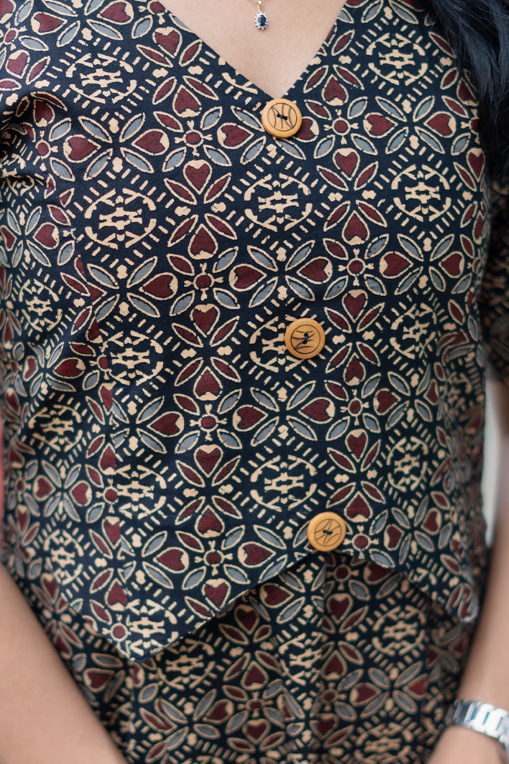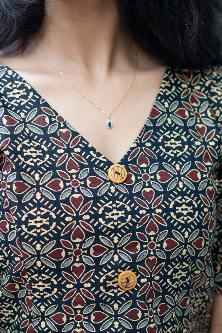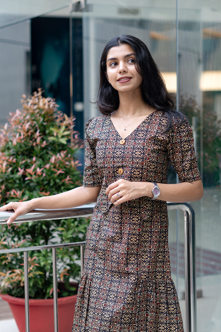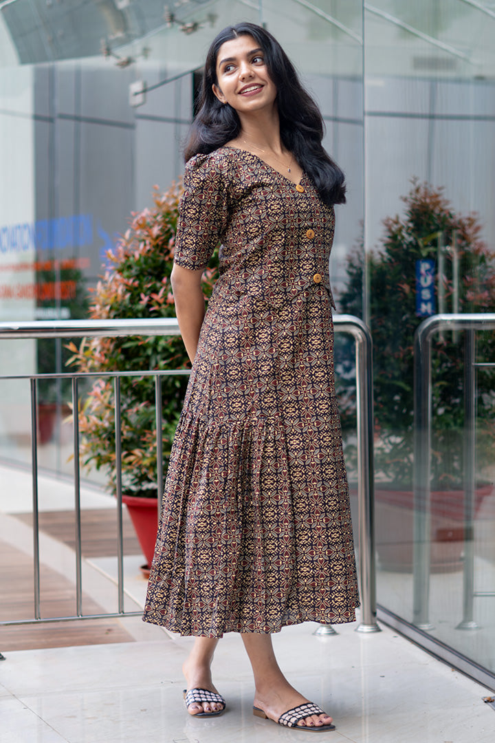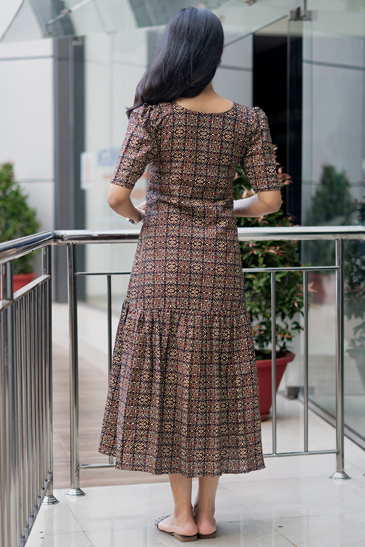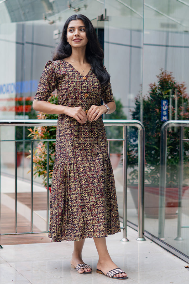 Casual black A-line frock features puff sleeves, a V-neck, and a normal round back. Made of cotton with a lining, it's perfect for everyday wear. It can also be used for feeding purposes. It can also be used for feeding purposes.