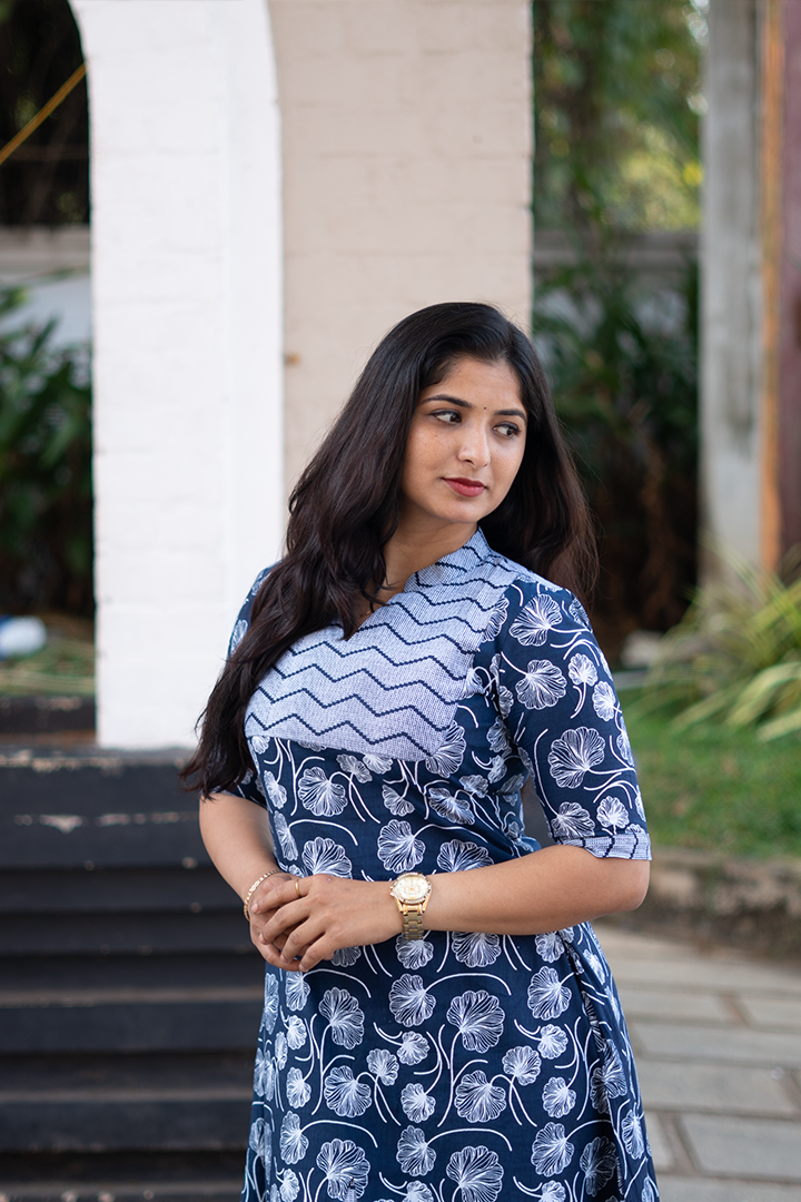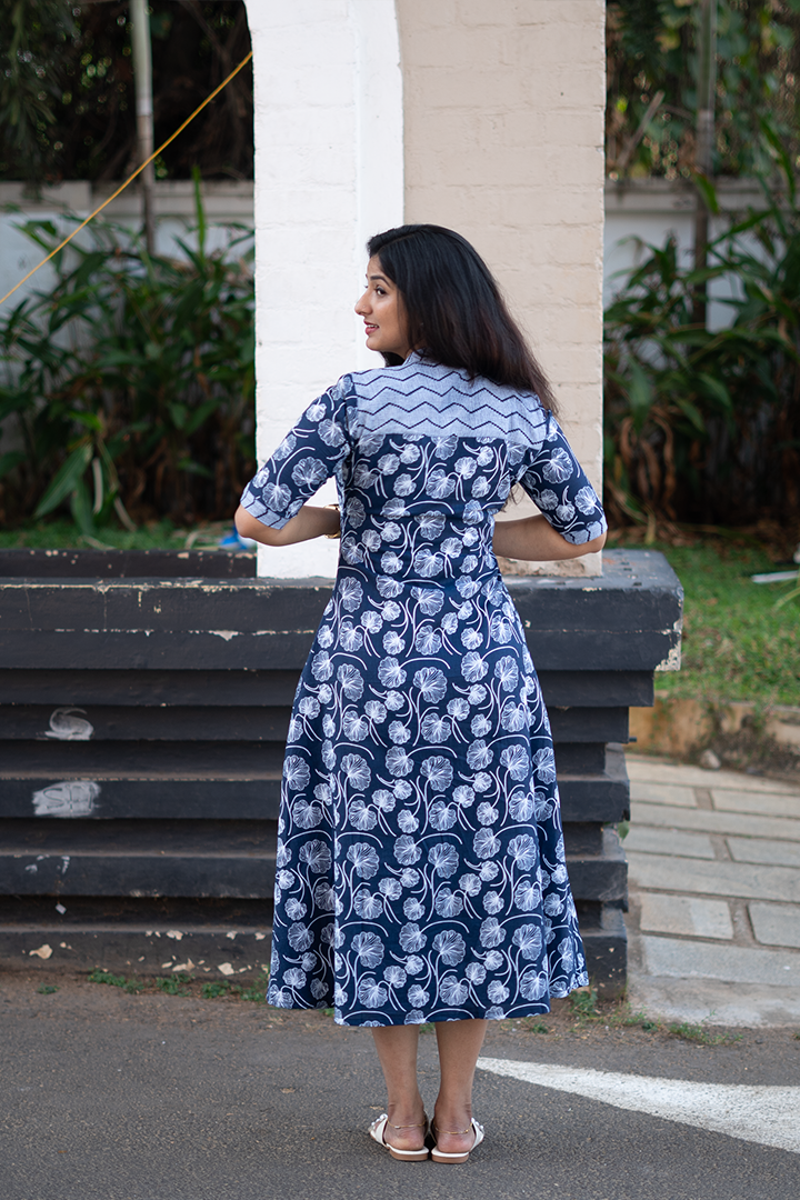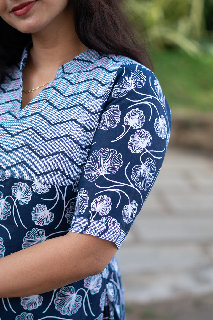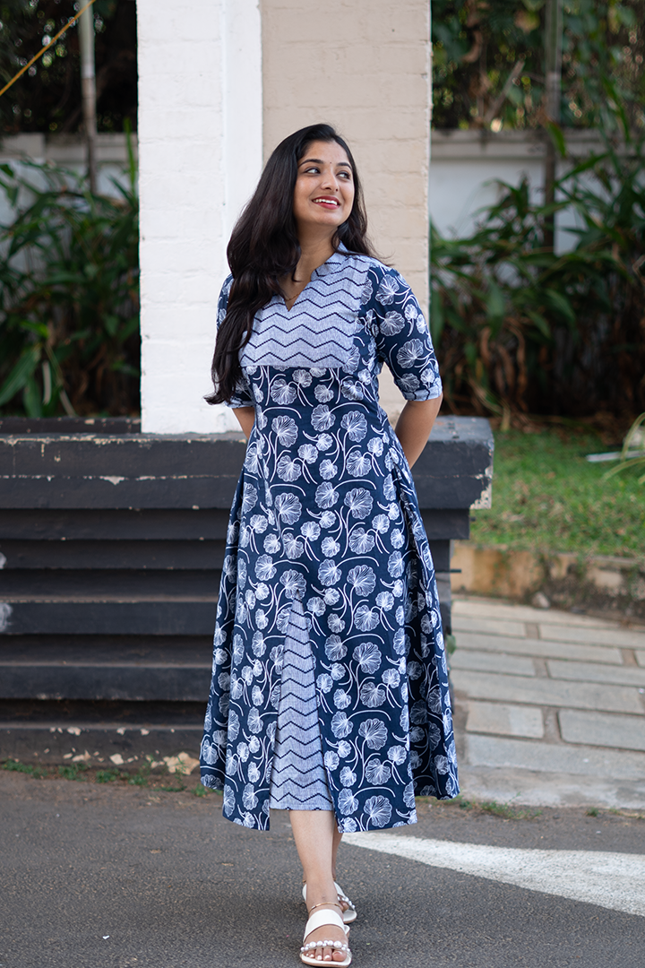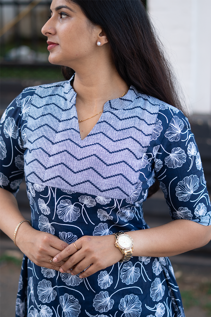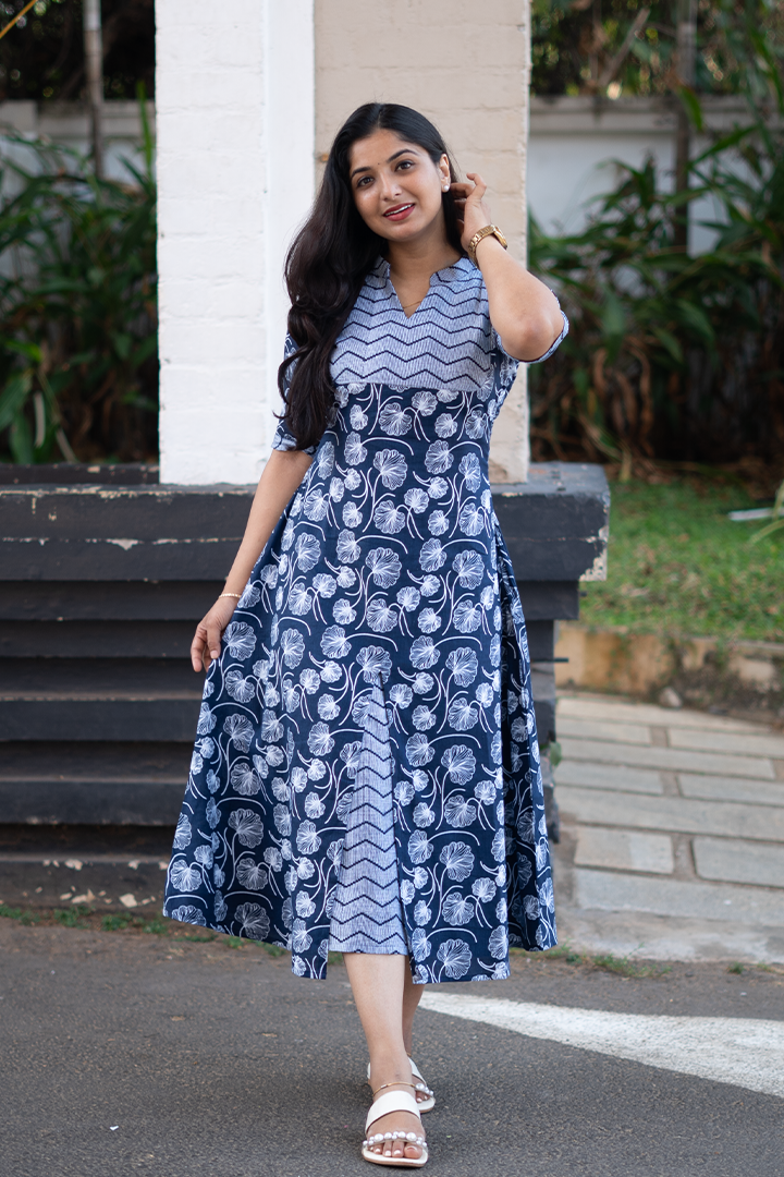 This blue and white A-line dress is crafted from breathable cotton, making it perfect for semi-functional, casual, and office wear. It features elbow-length sleeves with padi detailing and a V neckline styled with a Mandarin collar notch for a smart, structured look. The contrast printed yoke adds visual interest and definition, while the high-neck back enhances the refined silhouette. With a 47-inch length and soft cotton lining, this dress offers comfort, elegance, and easy all-day wear.
