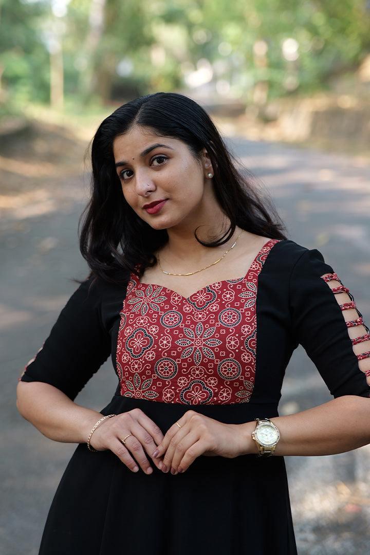 This Black and Red top is crafted from lightweight georgette, ideal for semi-functional occasions. Designed with an elegant sweetheart neckline, it features a striking ajrak cotton patchwork yoke that adds a rich ethnic accent. The elbow-length patterned sleeves, normal round back, 47-inch length, and smooth crepe lining ensure both comfort and graceful movement, making it a standout statement top.