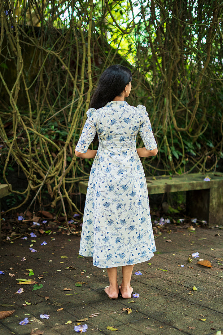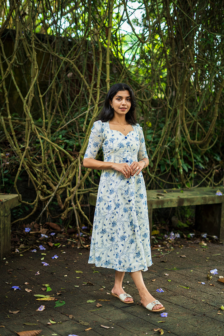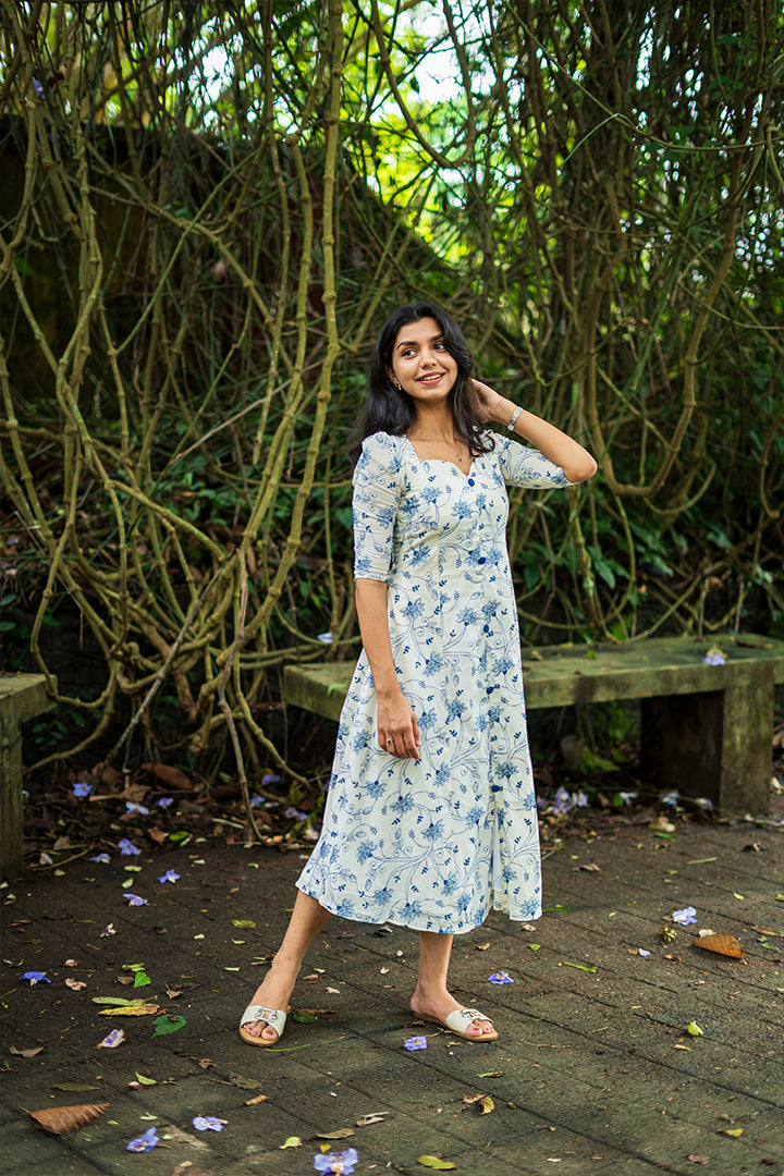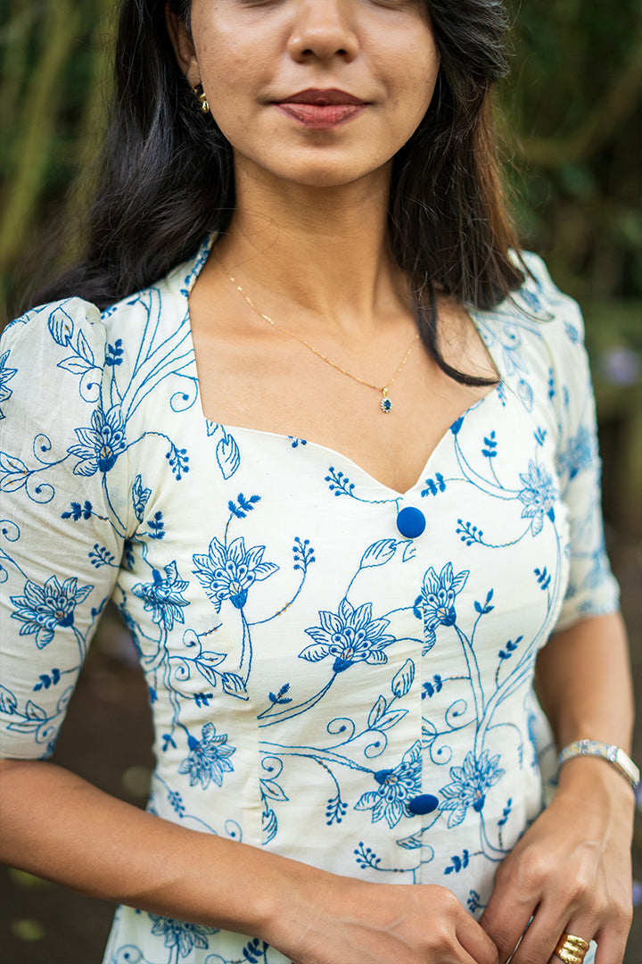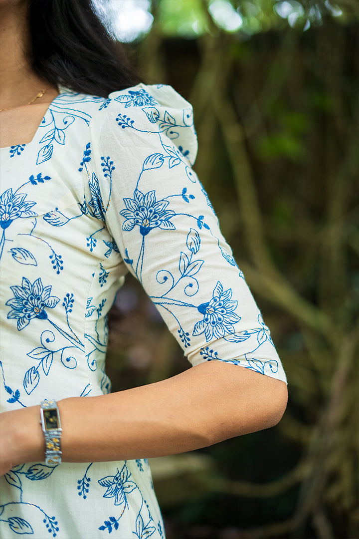 Grace meets simplicity in this white and powder blue A-line dress, tailored in breathable premium cotton (along with the blue floral embroidery, there are tiny shiny elements scattered within the design. Those are sequins (sequence work) that have been stitched in between the embroidery to give a subtle sparkle effect.) with for all-day ease. Designed with a flattering sweetheart neckline and princess-cut yoke, the dress beautifully enhances the silhouette. The elbow-length puff sleeves add a soft, feminine touch, while the collar back detail completes the look with elegance. Falling gracefully at 47 inches and fully lined with crepe, this versatile dress is perfect for casual wear as well as semi-functional occasions.