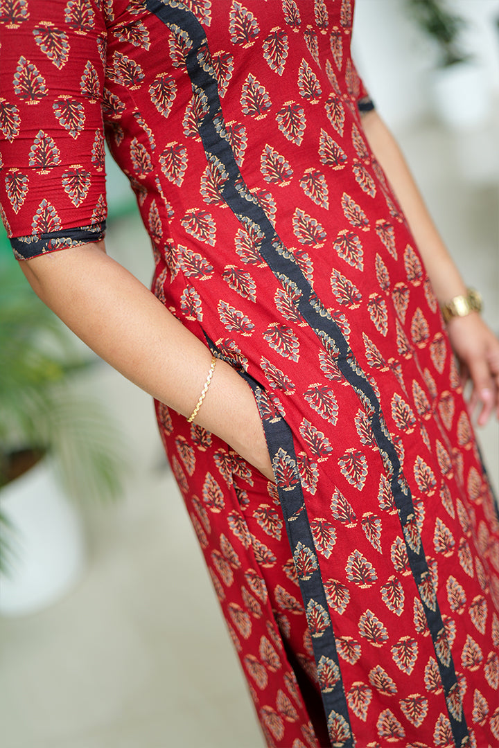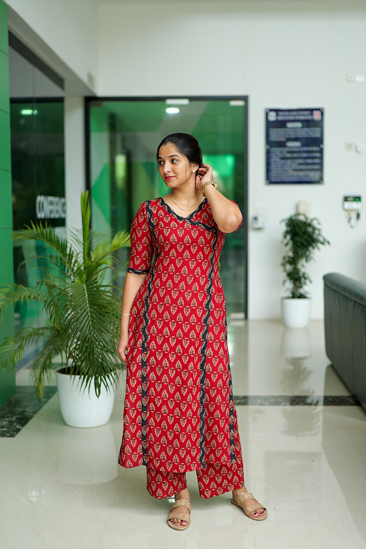 This Reddish brown and Black Cotton Co-Ord Set is crafted from breathable cotton with a smooth crepe lining, making it stylish yet comfortable for all-day wear. Designed with a flattering V-neckline and an overlapped yoke, it features elbow-length sleeves, a normal round back, and side slits that add both ease and modern appeal. The 47-inch straight-fit silhouette combines a striking red and black color palette with minimal detailing, making it versatile enough for casual outings, office wear, or semi-formal occasions.