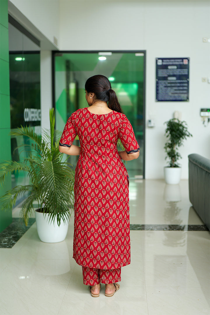 This Reddish brown and Black Cotton Top is designed with a flattering V-neckline and an overlapped yoke that adds a touch of sophistication to its casual charm. Featuring elbow-length sleeves, a normal round back, and side slits, it offers both comfort and style in a 47-inch length. Crafted from breathable cotton with a smooth crepe lining, this versatile piece is perfect for pairing with trousers, palazzos, or skirts, making it suitable for both casual wear and office styling.