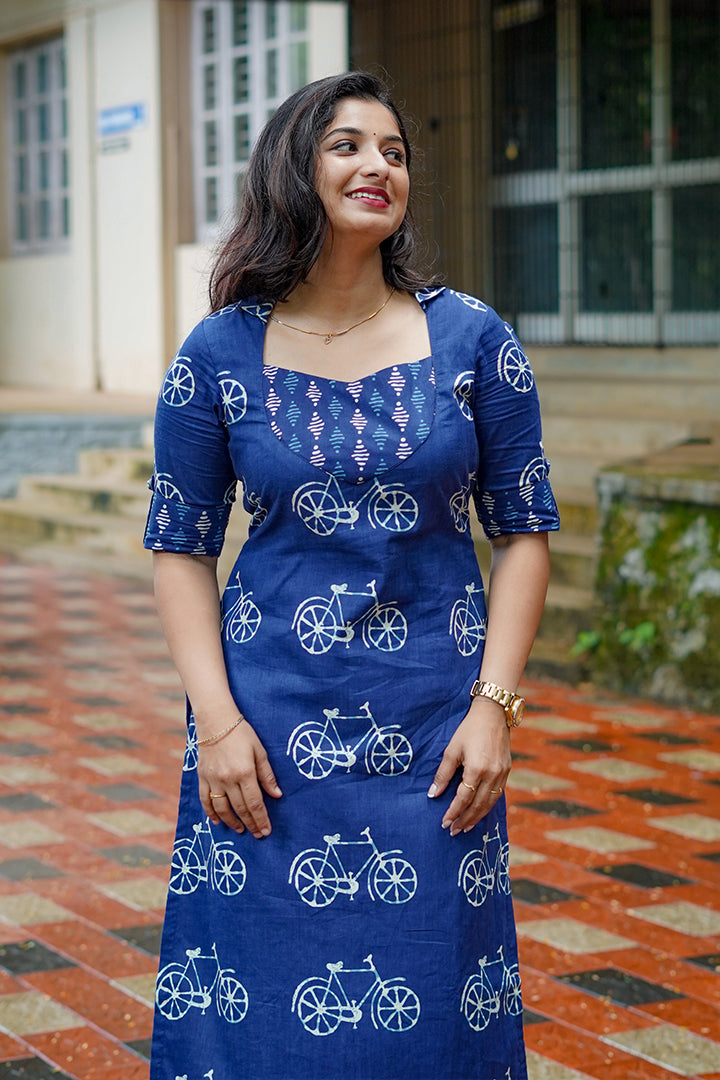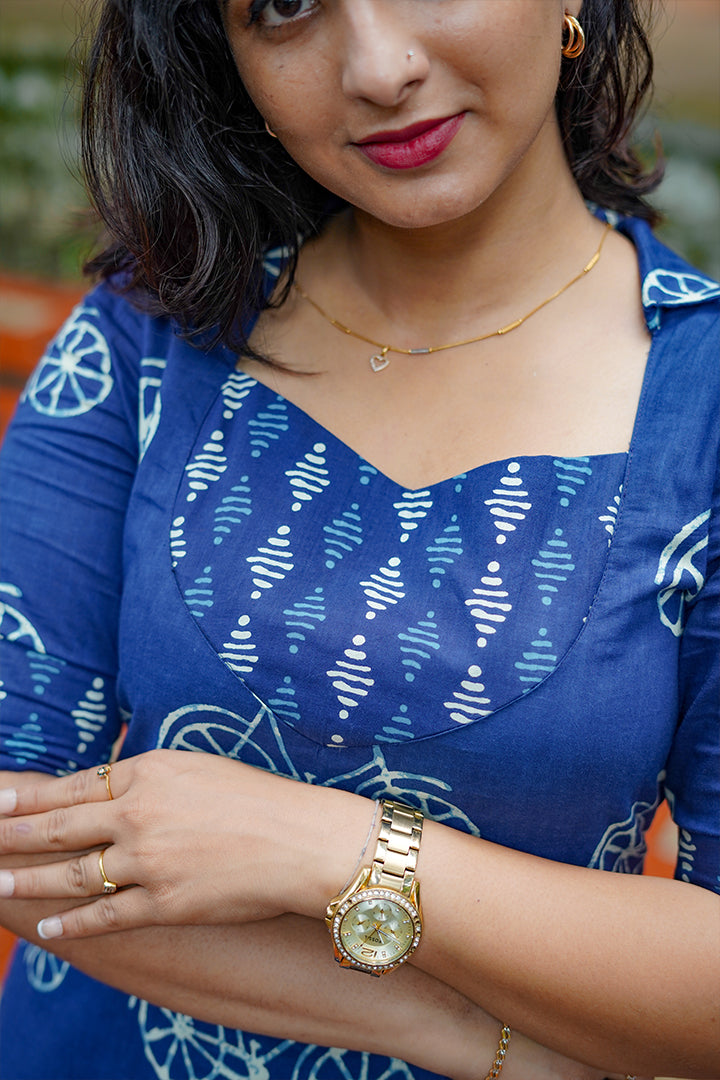 Add a chic and playful touch to your wardrobe with this Indigo Blue & White Co-Ord Set, crafted from soft, breathable cotton fabric. The top features a sweetheart neckline with a shirt collar, elbow sleeves with cuff detailing, and a yoke designed using bottom-printed fabric for a coordinated, stylish appeal. Adorned with a mix of bicycle motifs and geometric prints, this set blends fun and sophistication seamlessly. The 47-inch top comes with cotton lining for comfort and structure, while the bottom completes the look with matching indigo prints, making it perfect for casual outings or smart office wear.