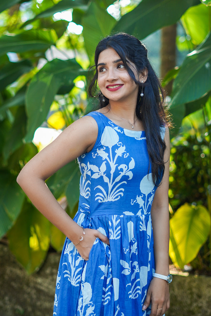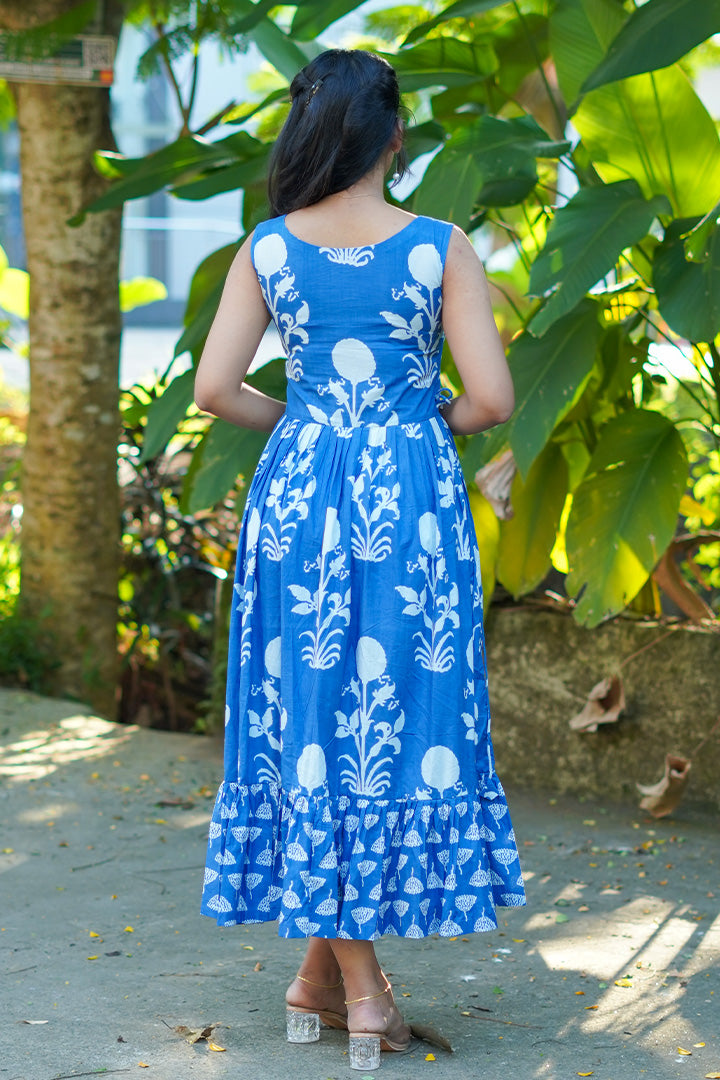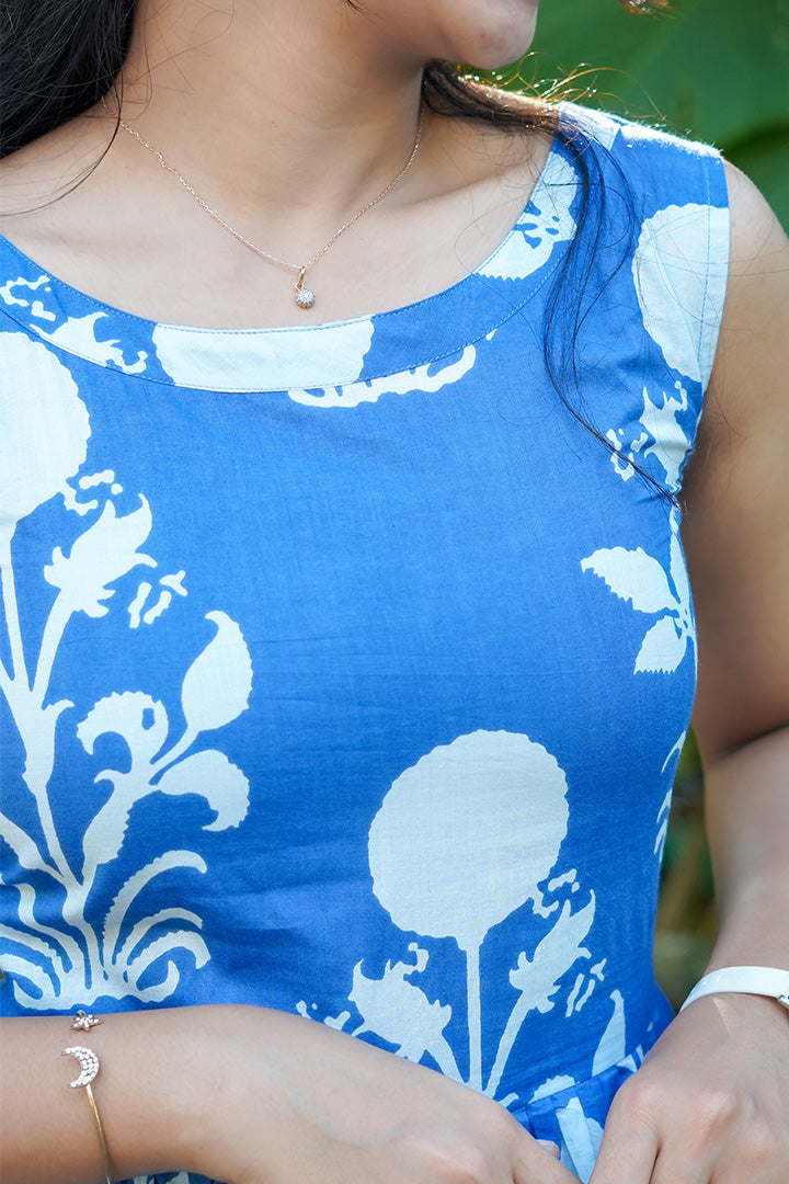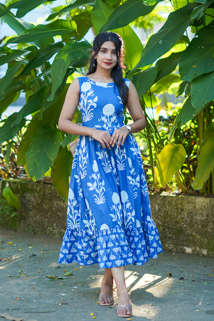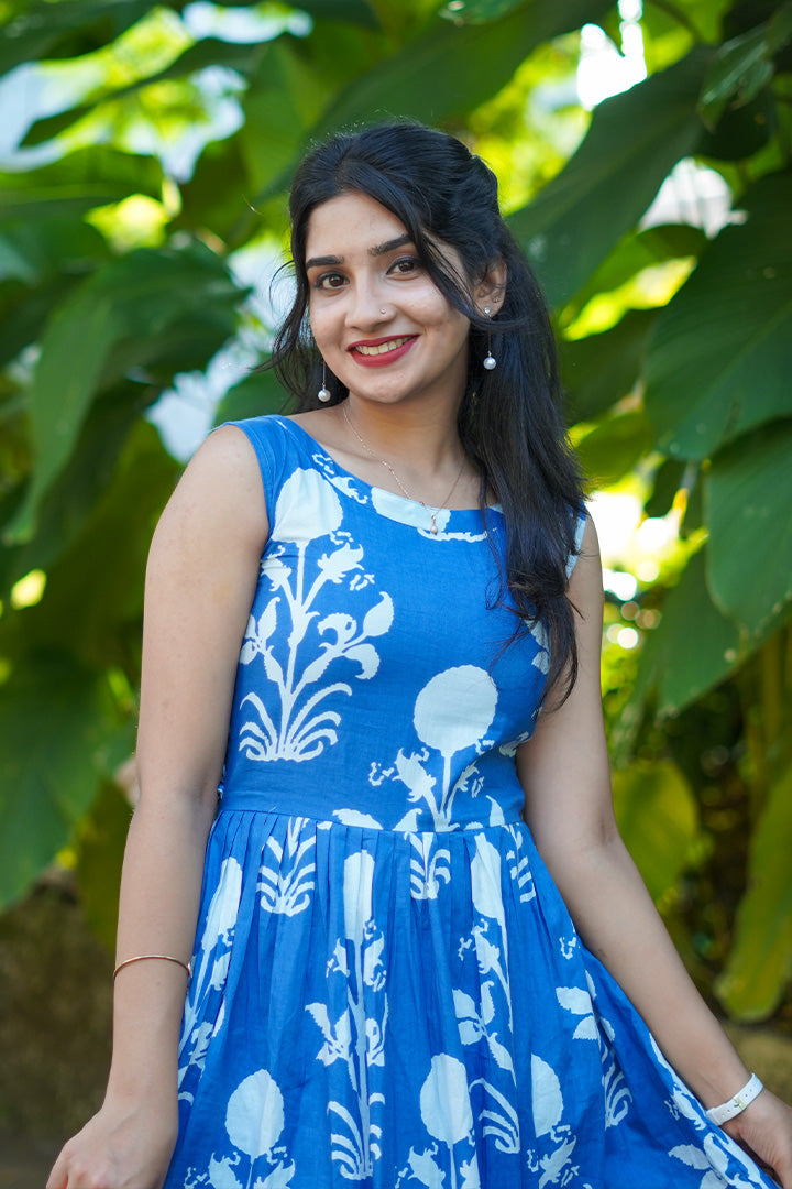 This royal blue gathered floral-printed maxi dress, crafted from premium Jaipur cotton, is a perfect choice for casual occasions. The sleeveless design features a boat neck, a normal round back, and a flattering gathered silhouette and Right side pocket. Its 48-inch length and it has a gathered design that adds charm to your everyday wardrobe. With no lining, it’s perfect for lightweight comfort and casual outings.