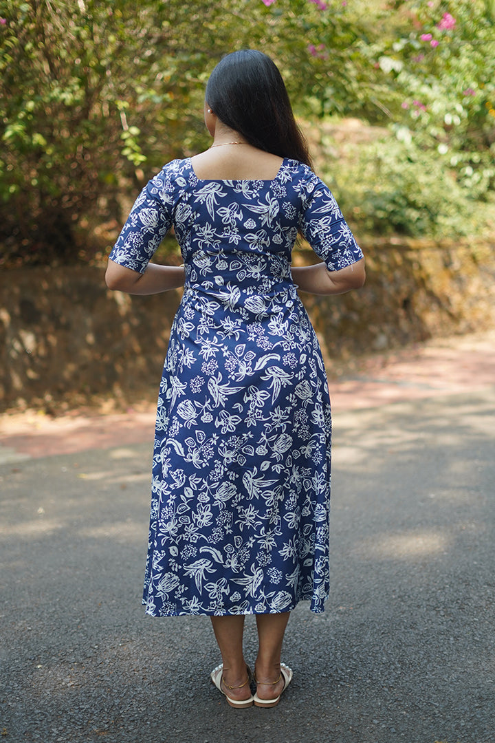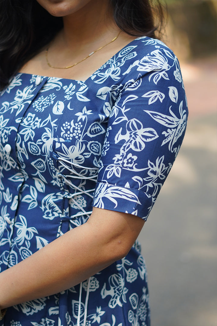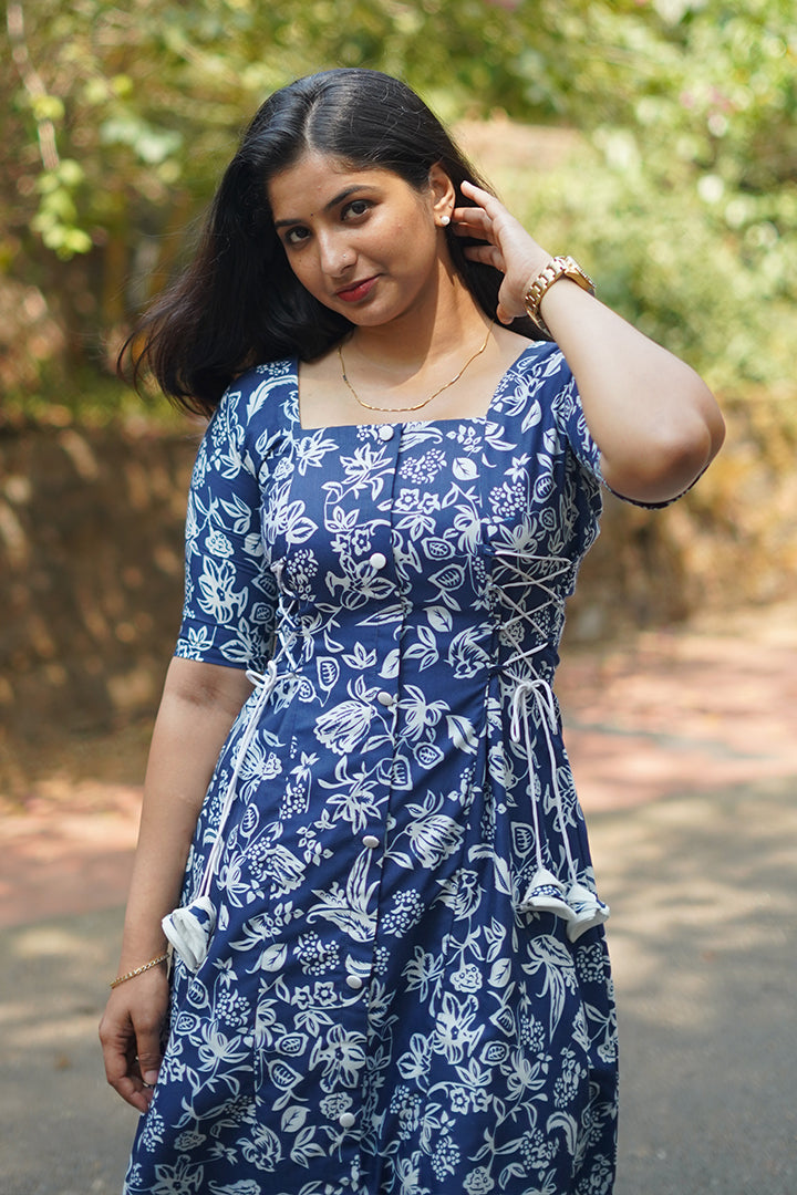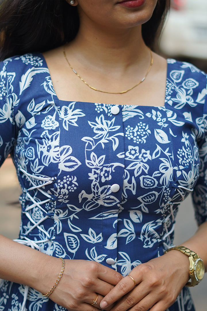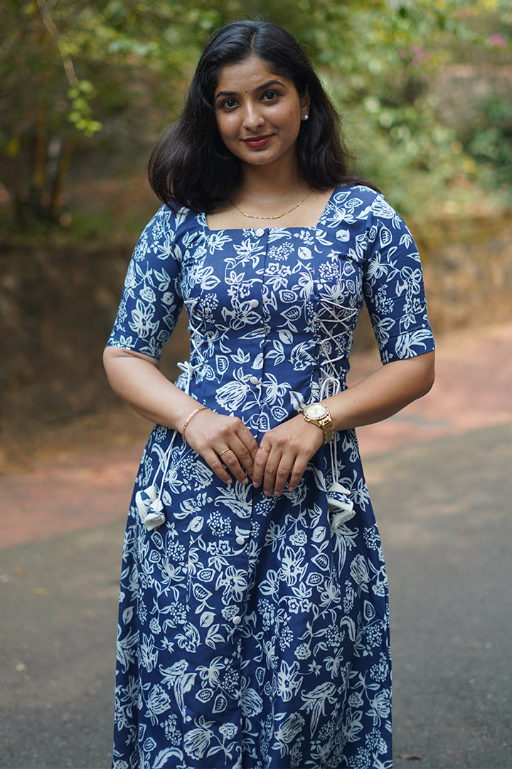 This blue and white 3-piece A-line dress is crafted from soft rayon slub, making it ideal for semi-functional, casual, and office wear. It features elbow-length sleeves and a flattering square neckline, complemented by a full padi button yoke with side corset-style lace-up detailing for a structured yet stylish look. The high-neck back adds a refined finish, while the 47-inch length ensures graceful coverage. Finished with a cotton lining, this dress offers breathable comfort and effortless elegance for all-day wear.