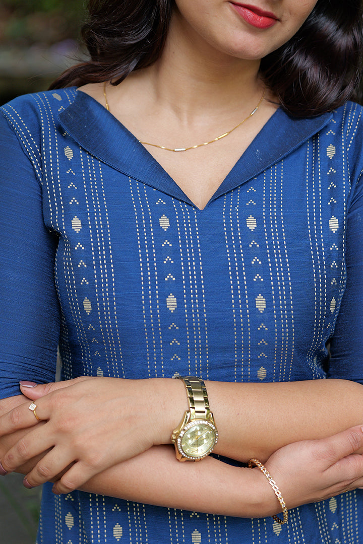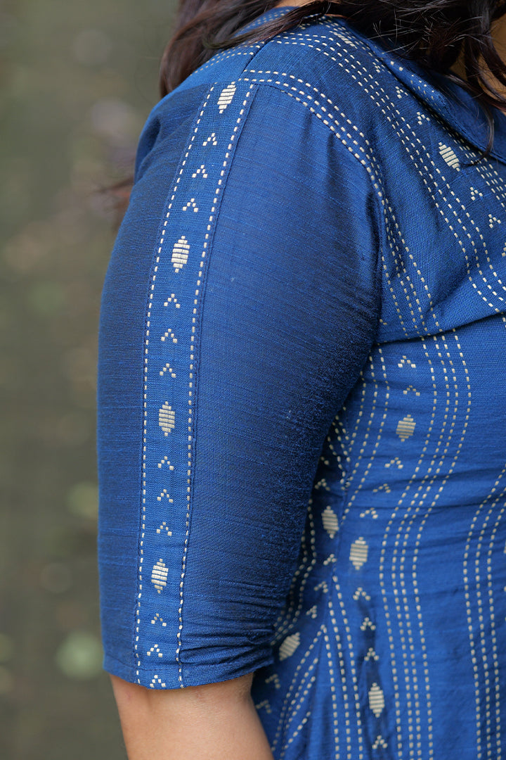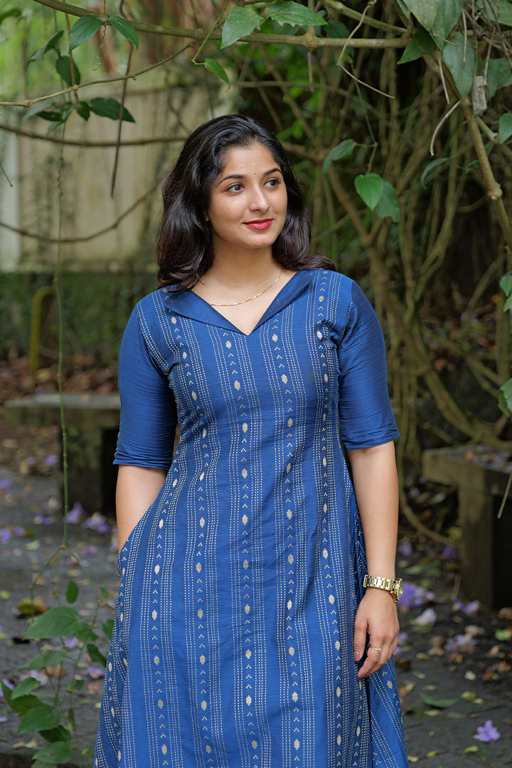 This Indigo Blue A-line Kurti crafted from soft cotton fabric combines simplicity and elegance, making it perfect for casual outings or office wear. Designed with a smart collar and V-neckline, and right side have pocket it adds a touch of sophistication while ensuring comfort. The elbow sleeves and A-line silhouette provide a flattering fit and easy movement. Finished with a crepe lining and a 47-inch length, this versatile piece can be styled as both a kurti or a dress, offering effortless everyday chic.