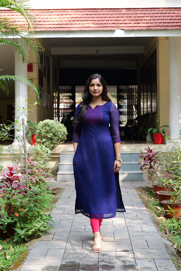 Elegant royal blue and pink georgette top featuring a boat neck with V-slit, machine thread-work striped yoke, 3/4 sleeves with pink padi, and comfortable crepe lining—ideal for office and casual wear