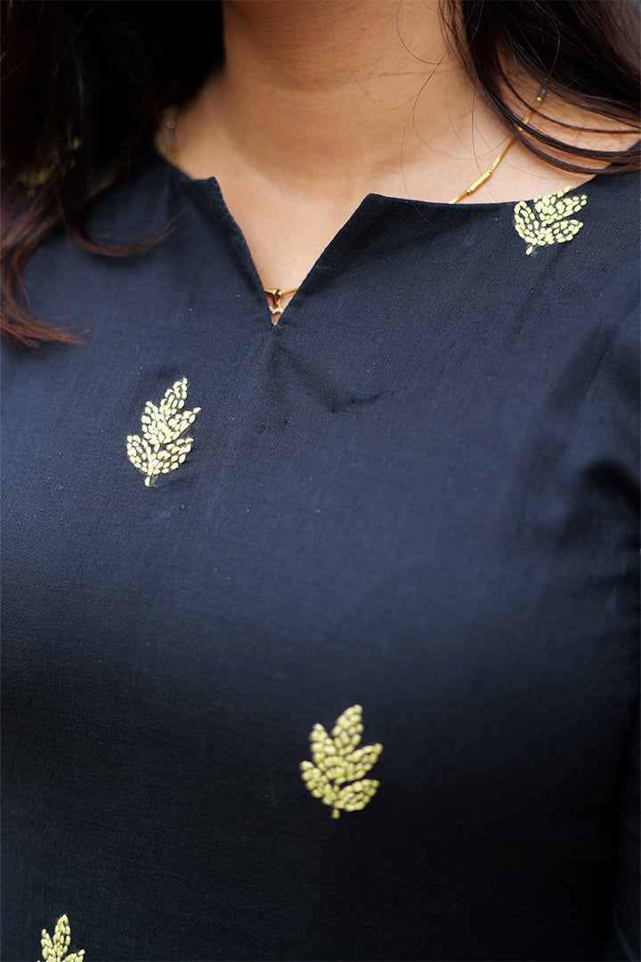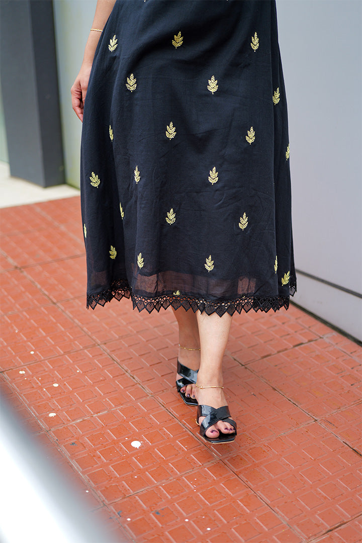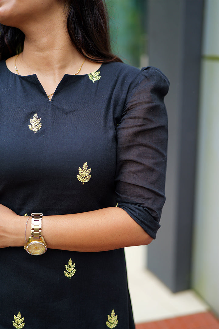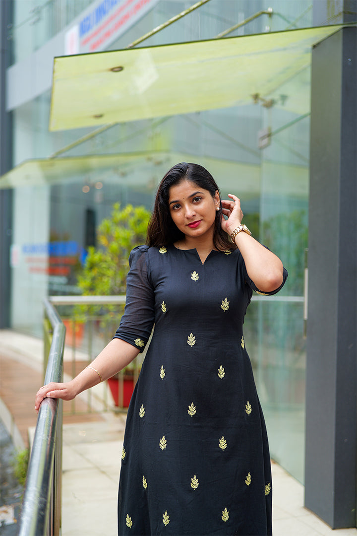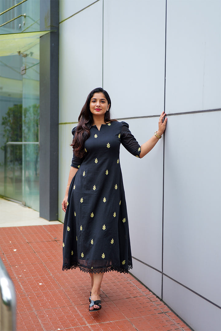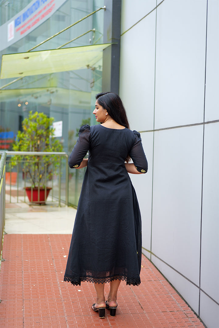 Elevate your everyday look with this classic black cotton A-line dress. Designed with a flattering round neck enhanced by a subtle V cut, elbow sleeves, and a 47-inch length, it offers both comfort and elegance. The soft cotton fabric with lining ensures breathability, making it perfect for casual outings and semi-functional occasions. A timeless wardrobe essential that blends simplicity with style.
