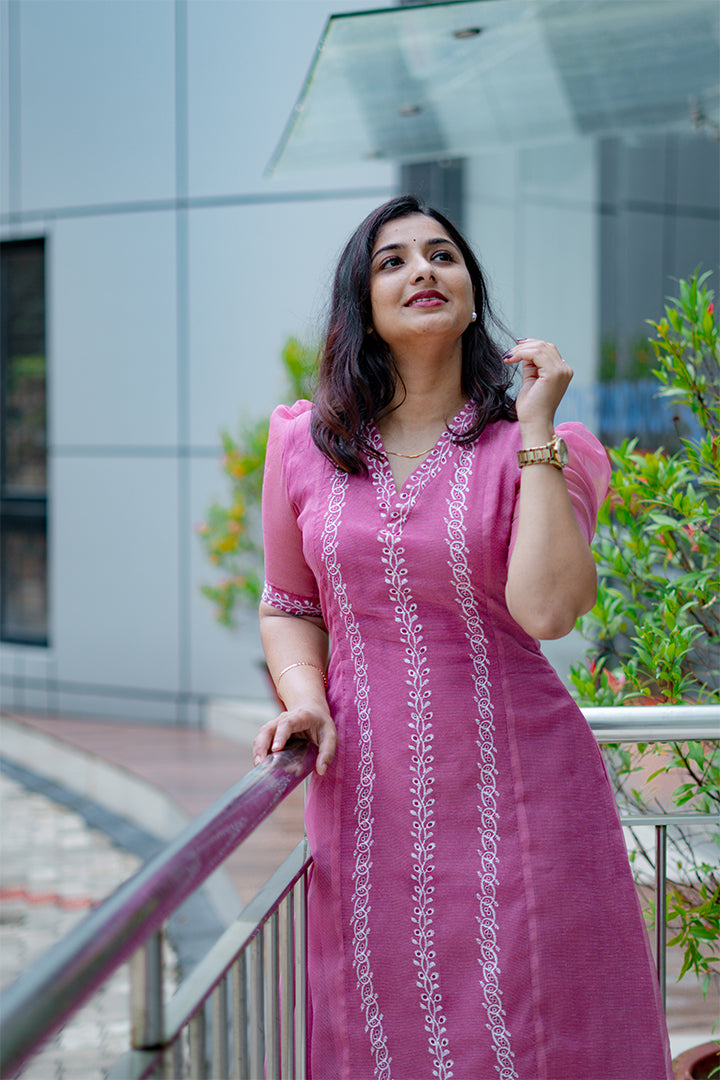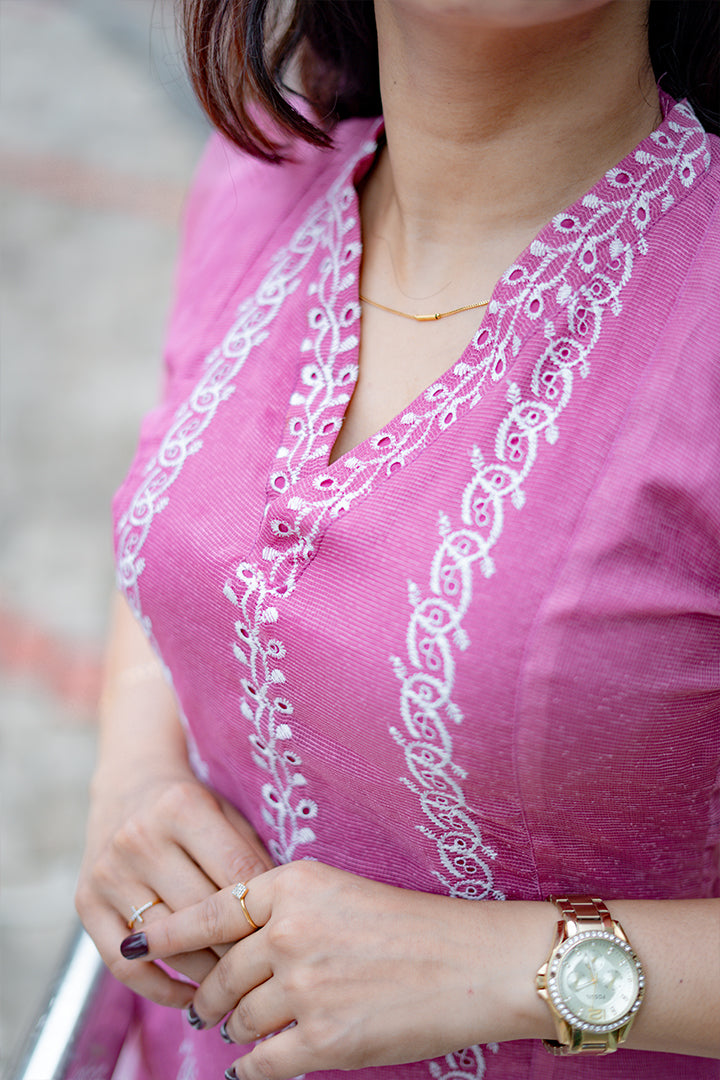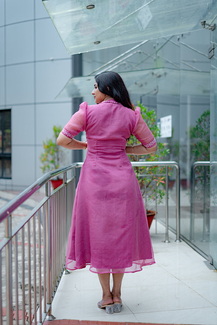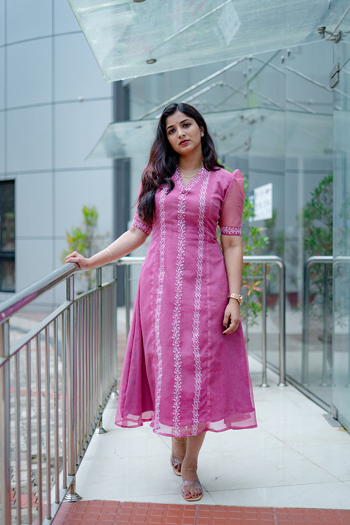 This Mauve Pink A-line Dress is crafted in delicate net cotta fabric, perfect for casual and semi-functional occasions. The dress features a flattering V-neck with padi, elbow-length puff sleeves, and a high-neck back for a graceful silhouette. Its three-panel A-line construction is enhanced with vertical floral thread embroidery on the front panel and sleeves, adding texture and elegance. Fully lined with crepe and measuring 46 inches, this dress flows effortlessly while maintaining a soft, structured shape.