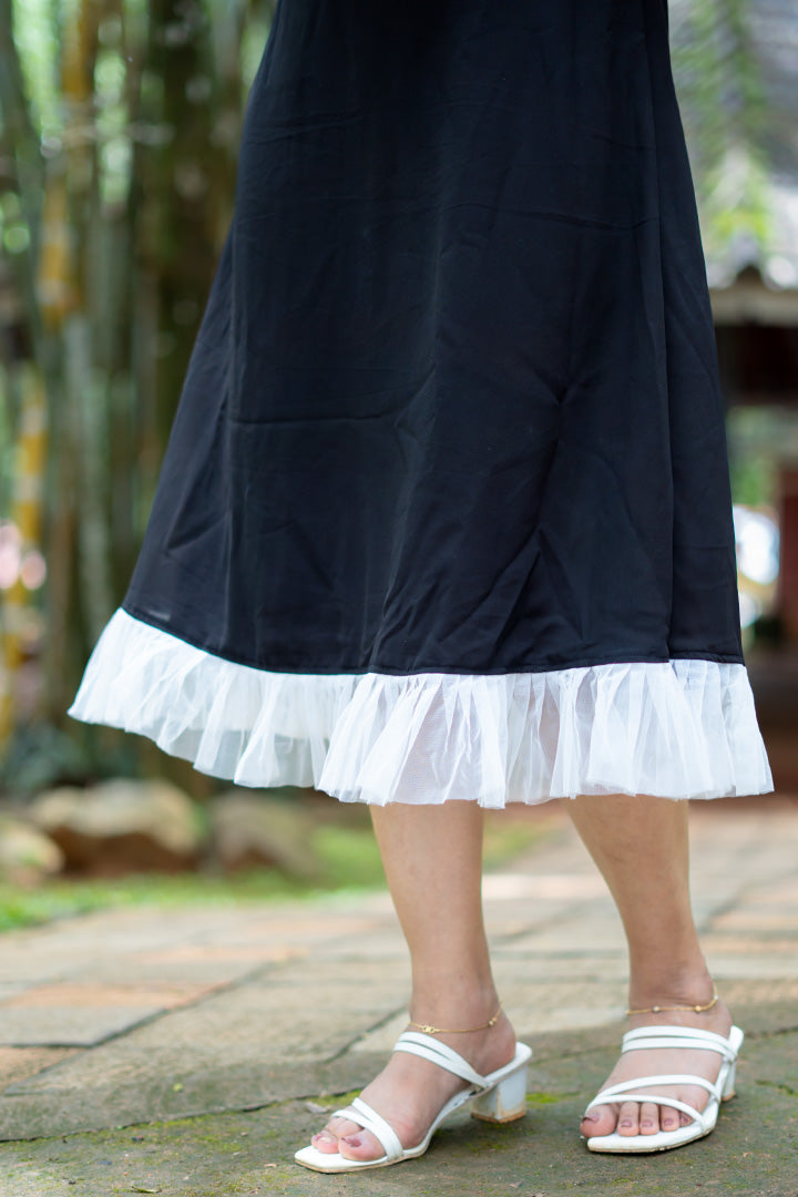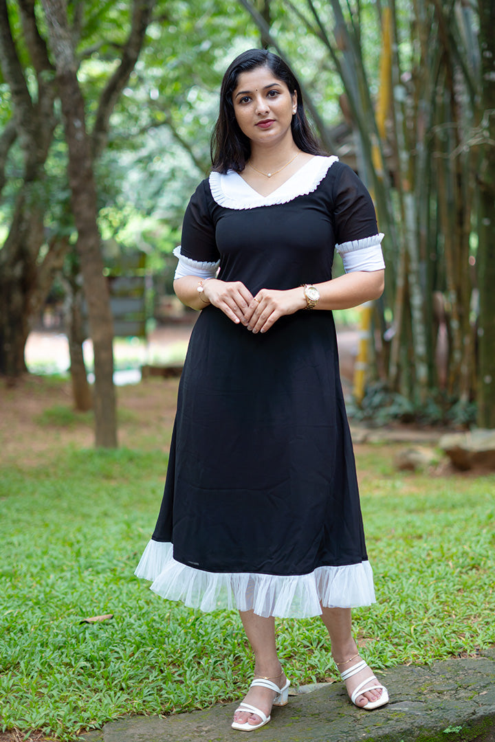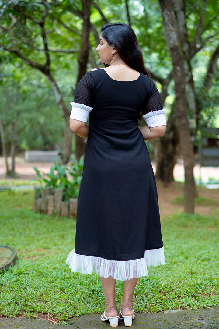 Shop our elegant black net fabric dress with elbow sleeves, V-neck, and pleated yoke. Designed for casual occasions, this 47-inch dress features a round back and crepe lining, offering both comfort and style. Available in classic black and white.
