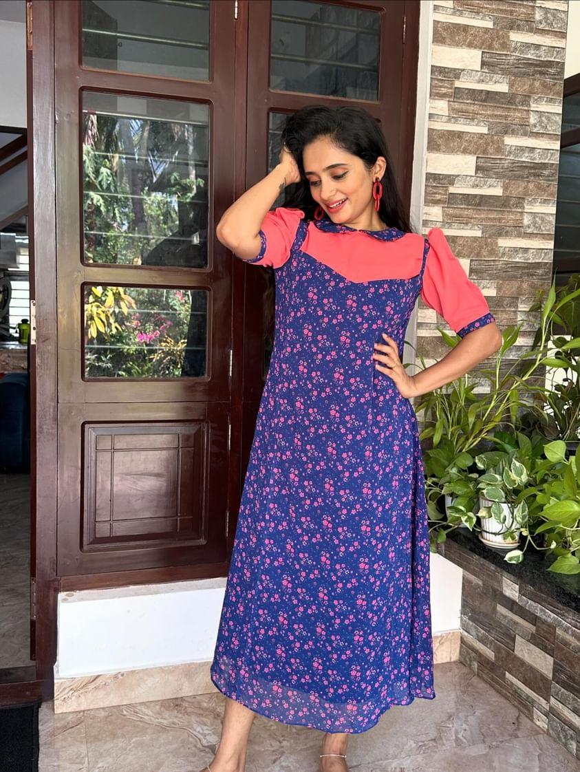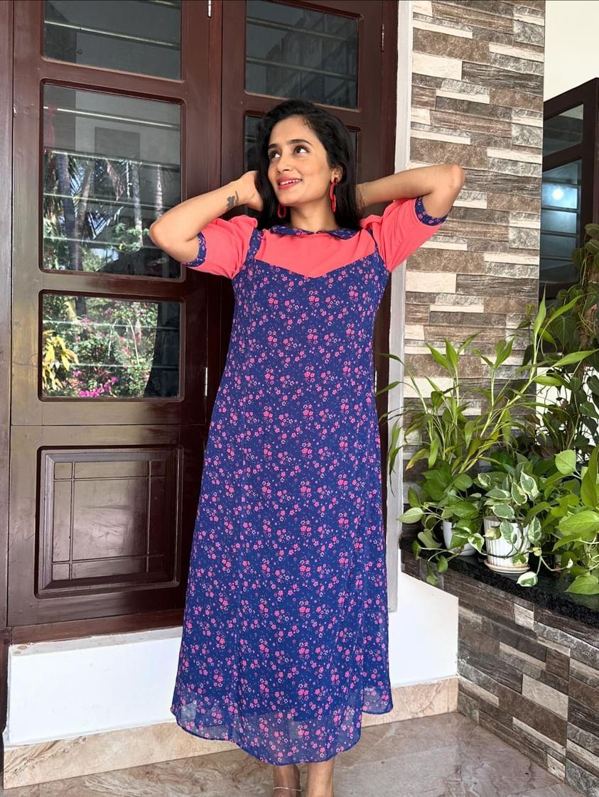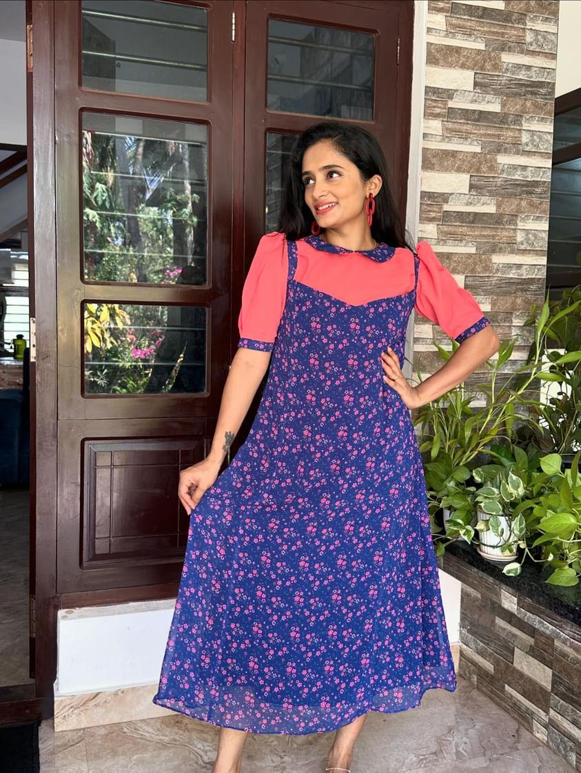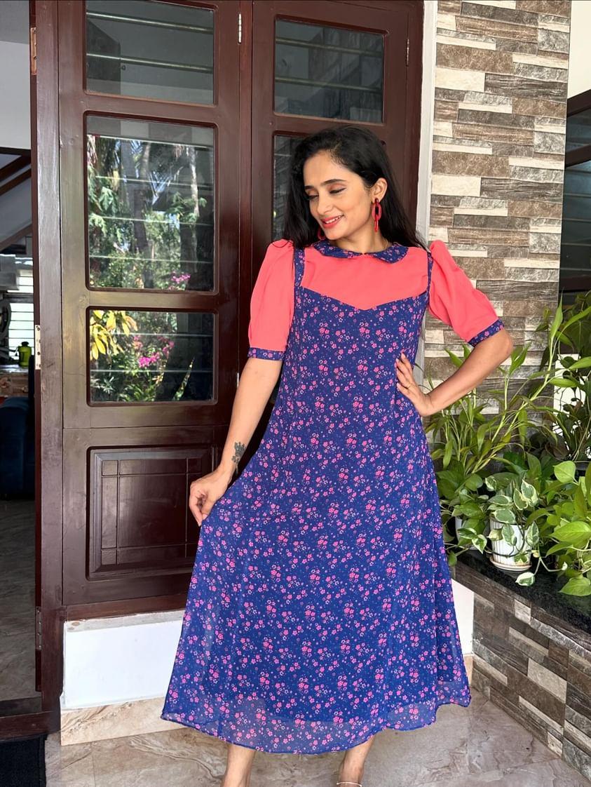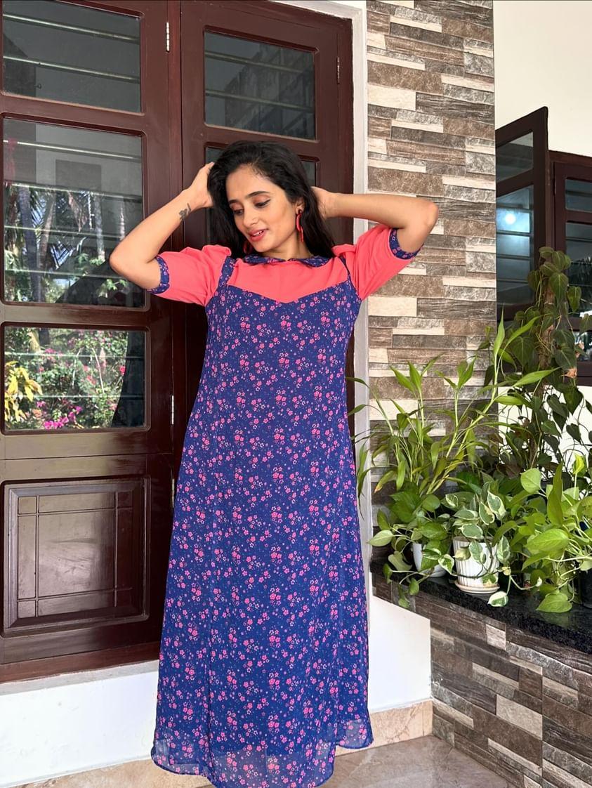 Introducing our latest casual wear addition: a stunning blue A-line floral printed pinafore dress crafted from luxurious georgette fabric, complete with a charming peach shade plain georgette inner layer. Adorned with a fashionable Peter Pan collar and bordered puff sleeves in matching blue printed material, this dress exudes effortless elegance.