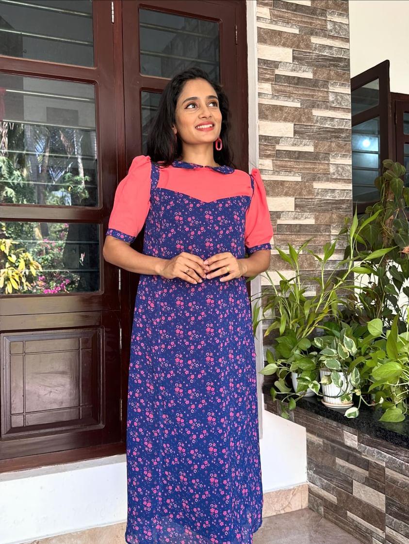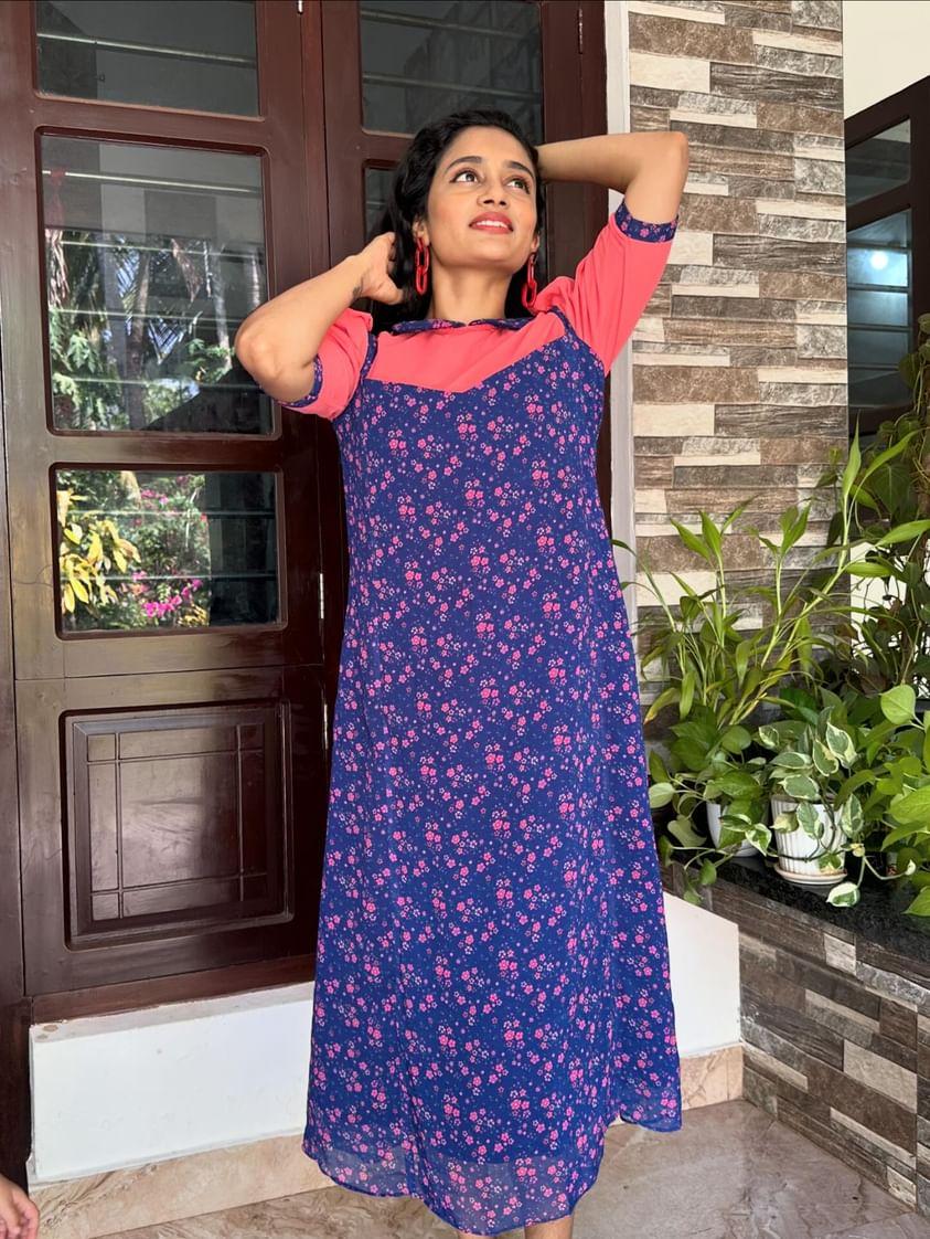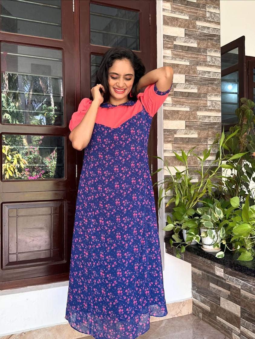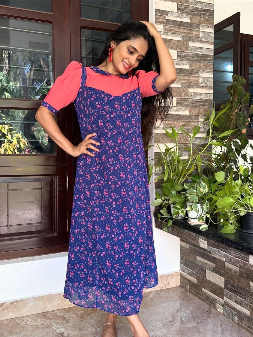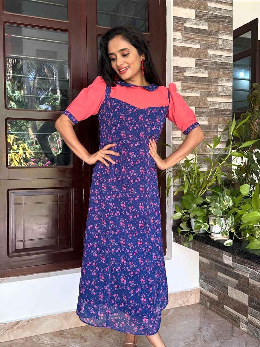 Introducing our latest casual wear addition: a stunning blue A-line floral printed pinafore dress crafted from luxurious georgette fabric, complete with a charming peach shade plain georgette inner layer. Adorned with a fashionable Peter Pan collar and bordered puff sleeves in matching blue printed material, this dress exudes effortless elegance.