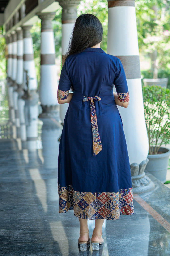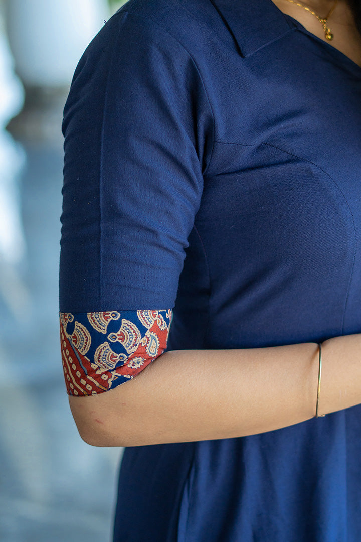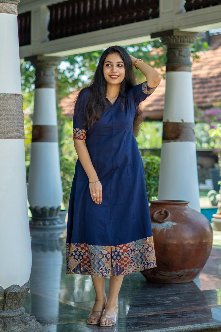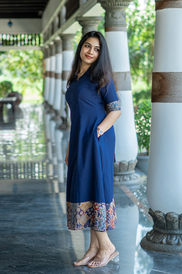 This Navy Blue A-line Dress in Flex Cotton is perfect for both casual and office wear. It features a collar with a V-neck, elbow-length sleeves with printed cuffs, and a princess cut design that enhances its elegant silhouette. The back styling includes a printed material tie, adding a unique touch. The solid base is beautifully complemented by an ethnic geometric printed hem and sleeve borders, making it a perfect blend of style and comfort.