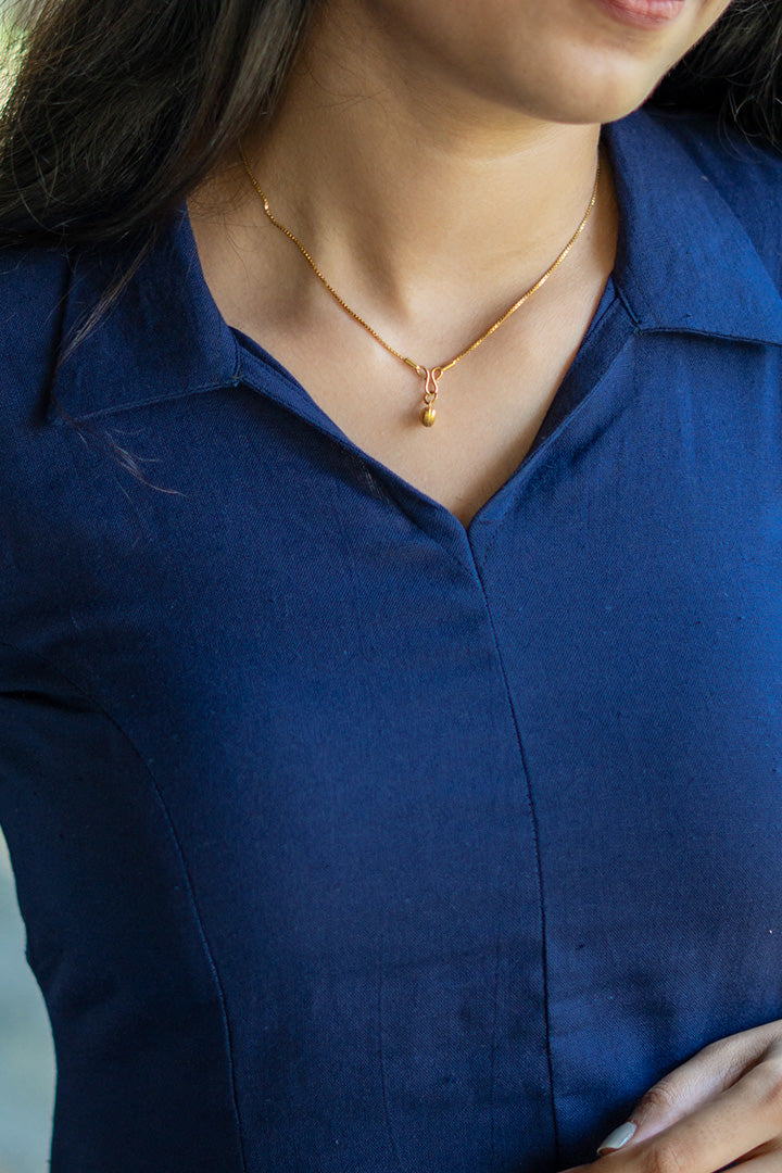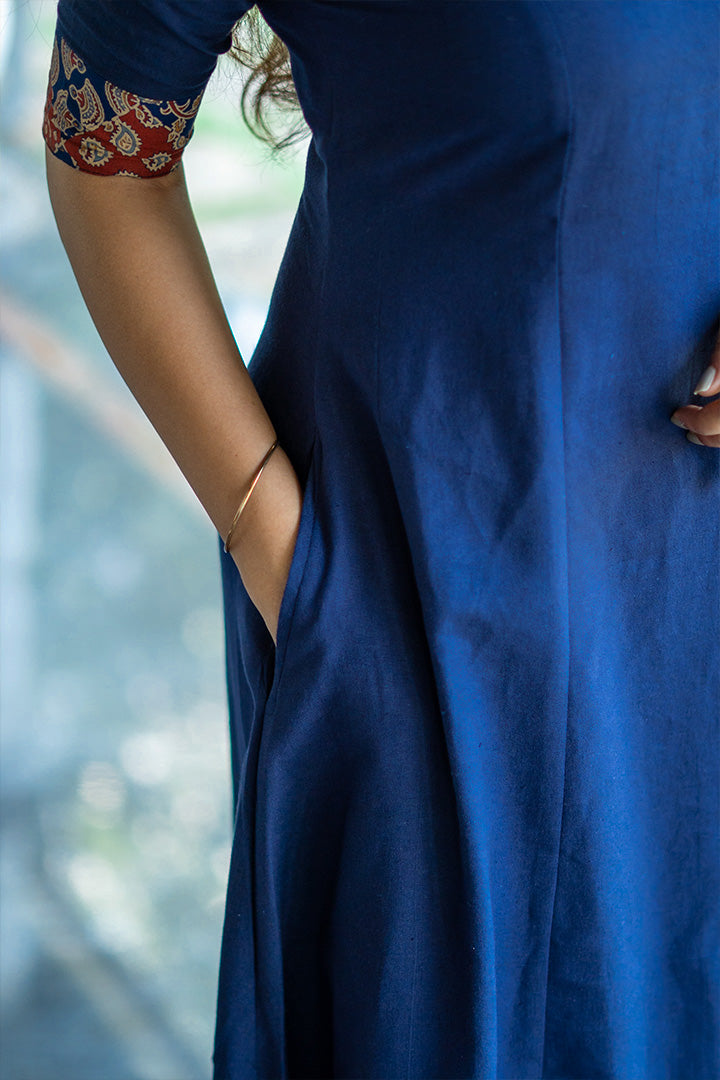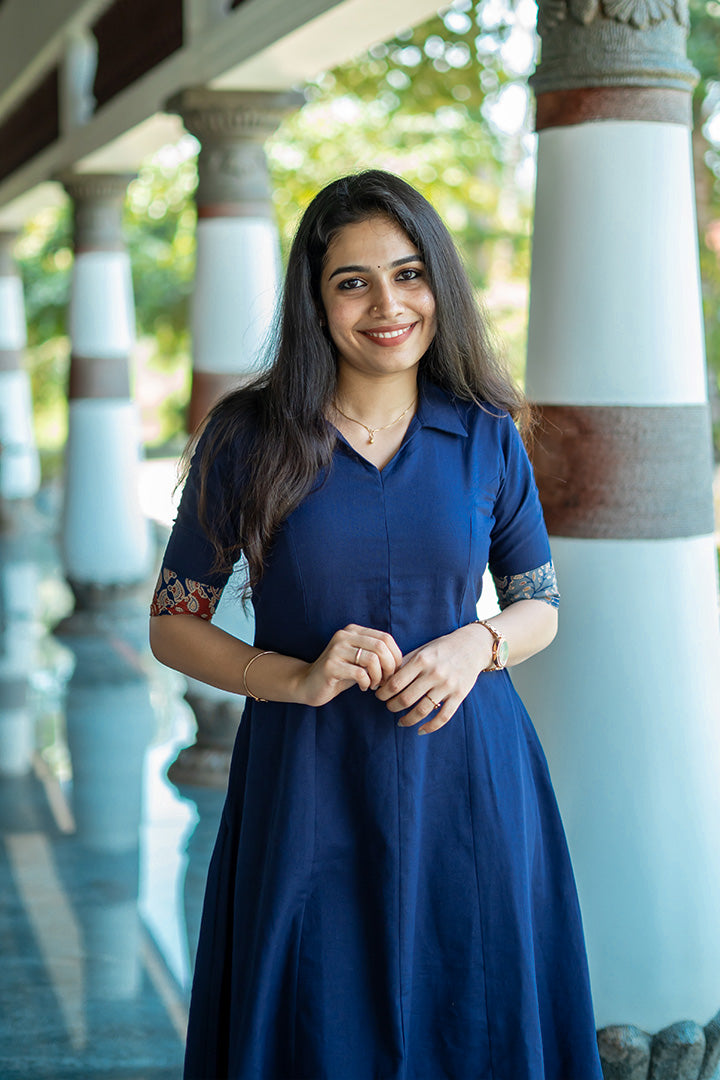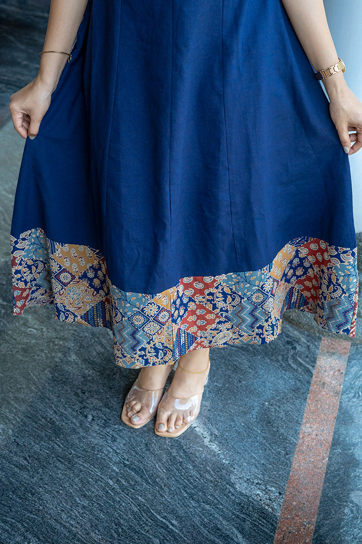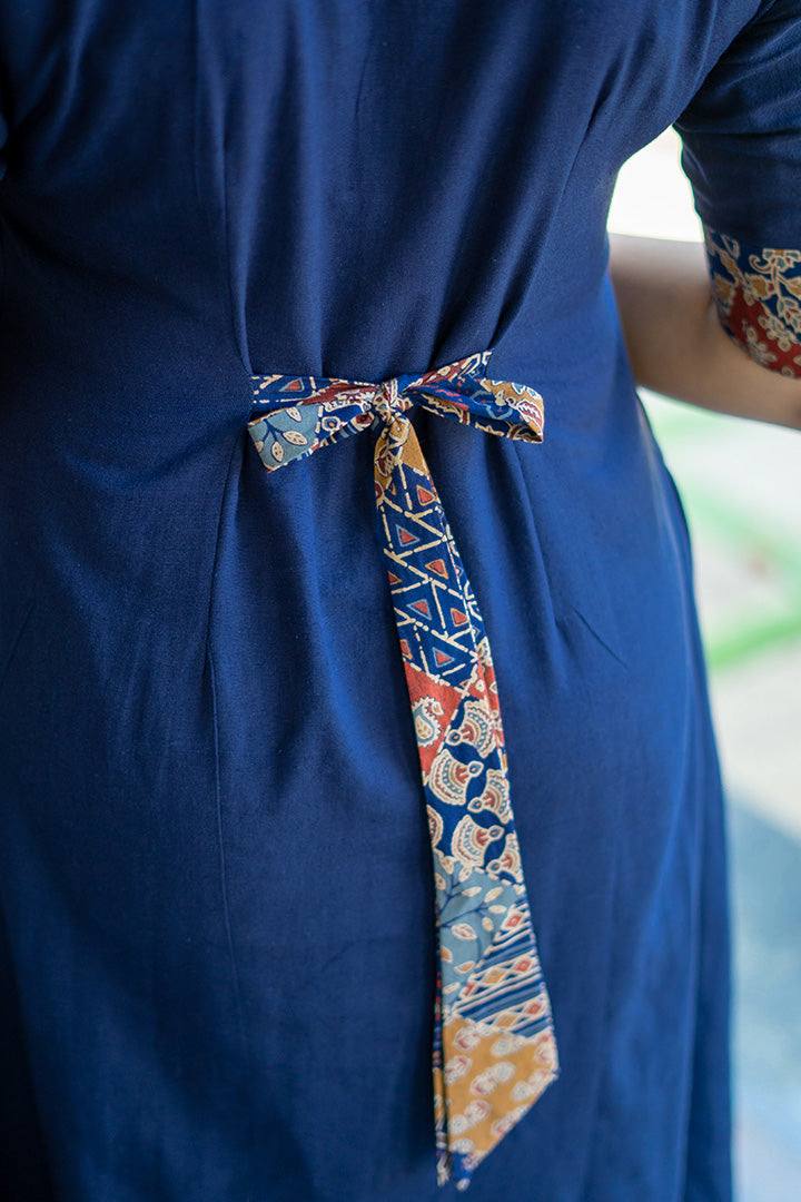 This Navy Blue A-line Dress in Flex Cotton is perfect for both casual and office wear. It features a collar with a V-neck, elbow-length sleeves with printed cuffs, and a princess cut design that enhances its elegant silhouette. The back styling includes a printed material tie, adding a unique touch. The solid base is beautifully complemented by an ethnic geometric printed hem and sleeve borders, making it a perfect blend of style and comfort.