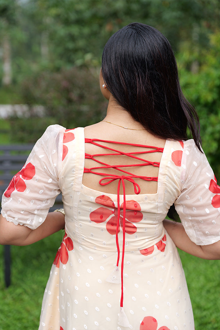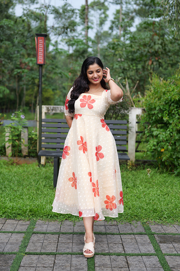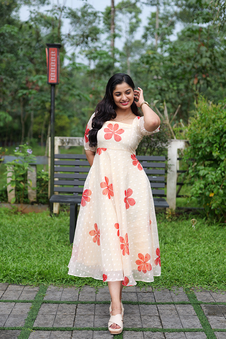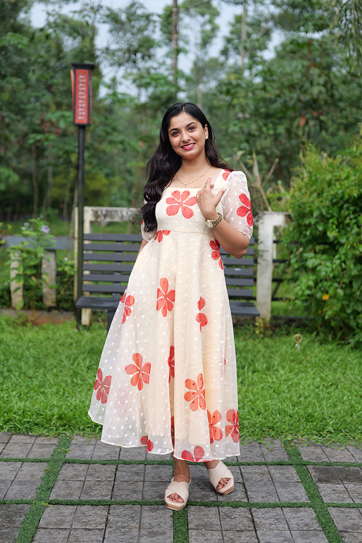 This elegant off-white umbrella frock is crafted from delicate organza butta fabric, perfect for semi-functional events and casual occasions. Designed with a classic square neck and a simple, clean yoke, the dress features charming elbow puff sleeves with elastic for a soft, feminine touch. The contrast-color back tie adds a subtle style highlight, while the 47-inch length and smooth crepe lining ensure comfort and a graceful flow. A beautiful blend of simplicity and elegance for any special day.