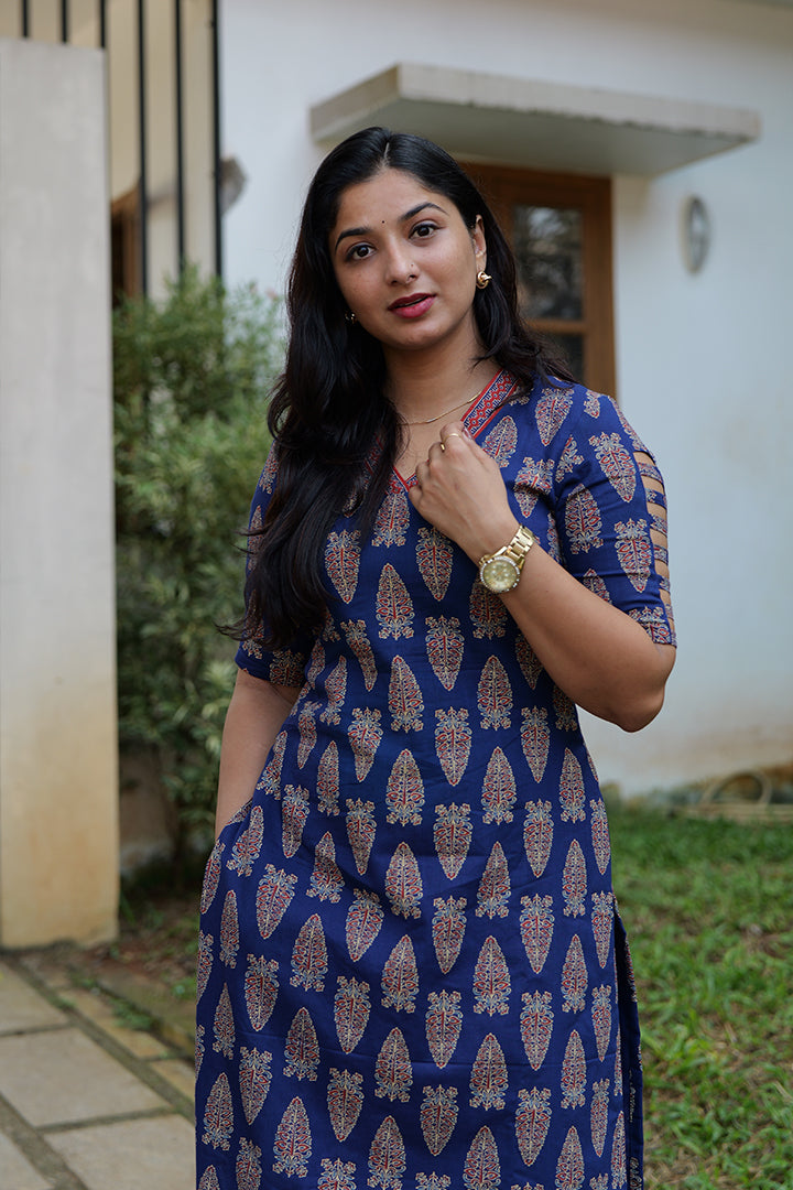 This Multi-Color Cotton Top is perfect for casual, office, and daily wear, designed with elbow-length sleeves featuring a stylish cut-out gap bridged by horizontal fabric strips for a modern touch. The flattering V-neck with a contrasting printed border adds visual interest, while the collar-style back neck gives a clean, structured finish. Crafted from breathable cotton with soft cotton lining, this 47-inch-length top offers comfort and effortless style for everyday dressing.
