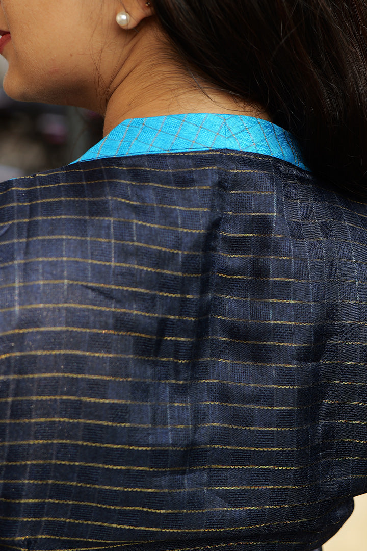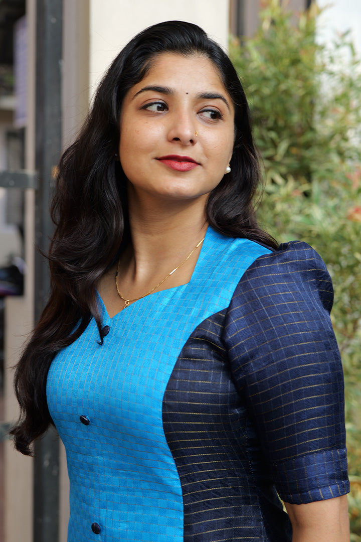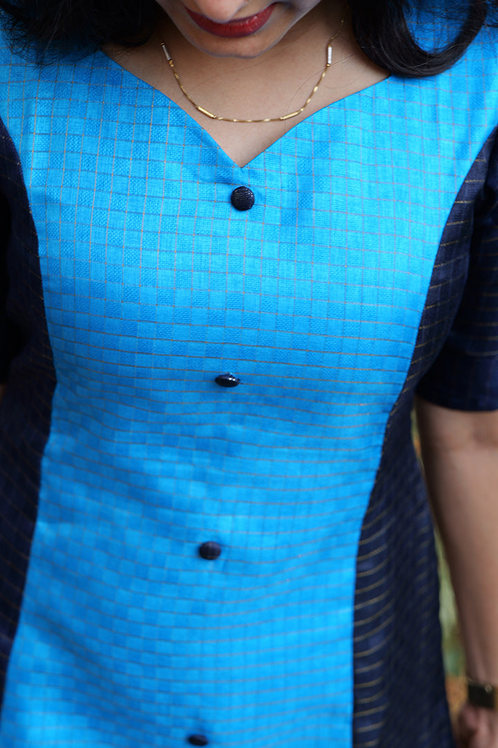This Navy Blue and Sky Blue A-line dress is crafted from breathable check cotta fabric, making it ideal for semi-functional occasions and casual wear. Designed with a smart high neckline and elbow-length sleeves, the dress offers a clean, structured silhouette. The classic A-line cut, 46-inch length, and comfortable cotton lining ensure ease of movement and all-day comfort. A versatile everyday dress with subtle pattern charm.