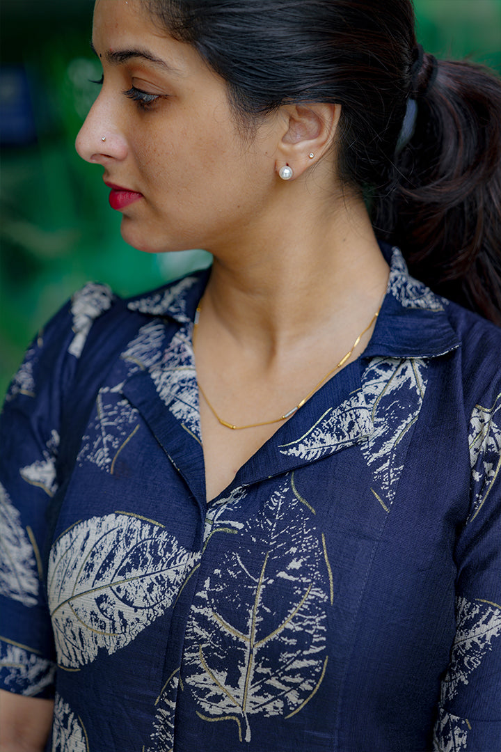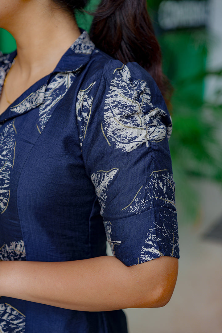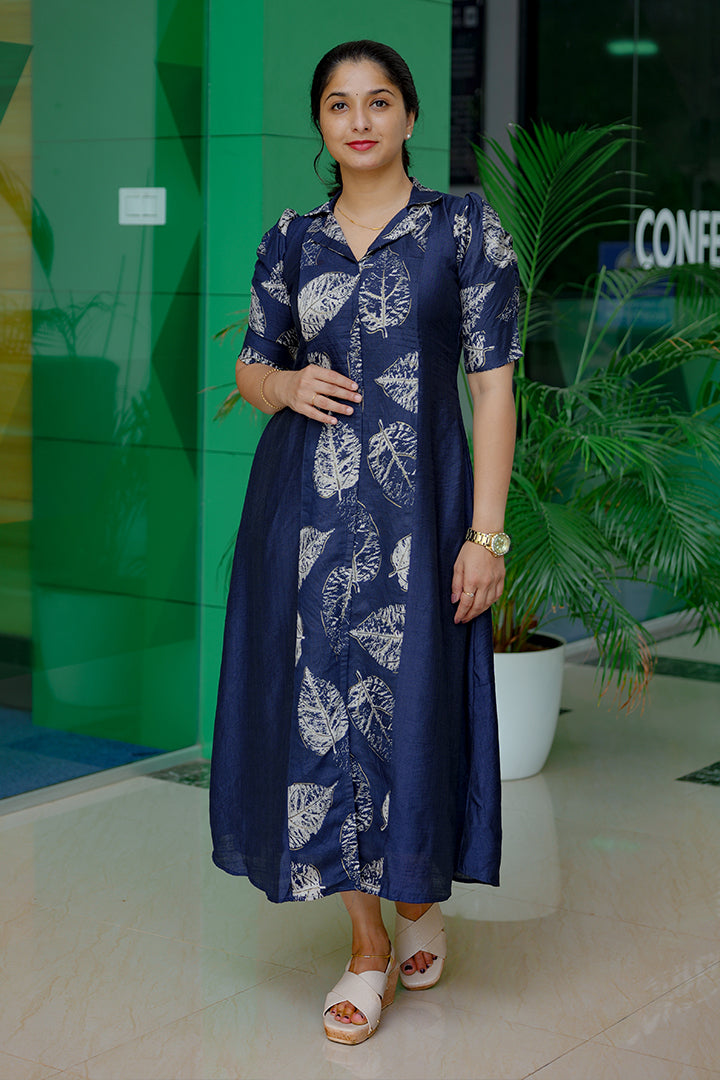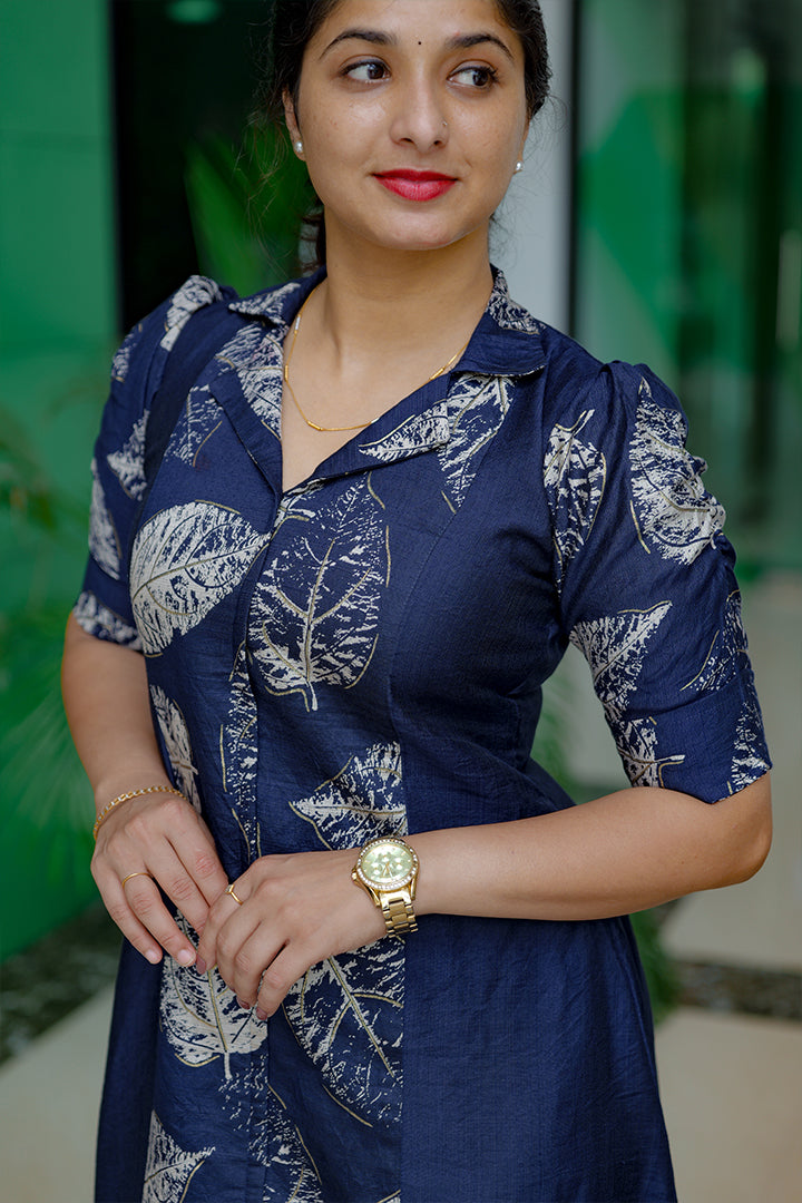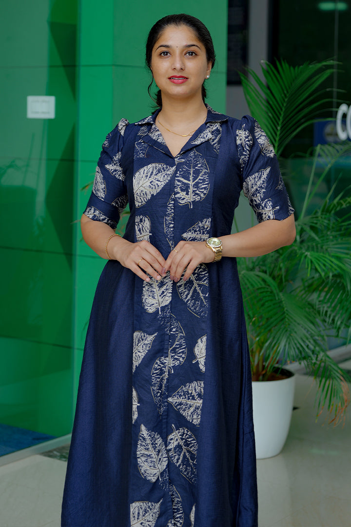 Step into effortless elegance with this Deep Navy Blue A-line three-panel dress made from premium Vatican fabric. Perfect for casual, semi-party, and office wear, this piece features a smart shirt collar and puff elbow sleeves that blend style with comfort. The three-panel yoke design enhances the silhouette, while the foil print details on the center panel and sleeves add a subtle festive shimmer. Finished with a soft crepe lining and 46–47 inch length, this dress brings refined charm to any occasion.
