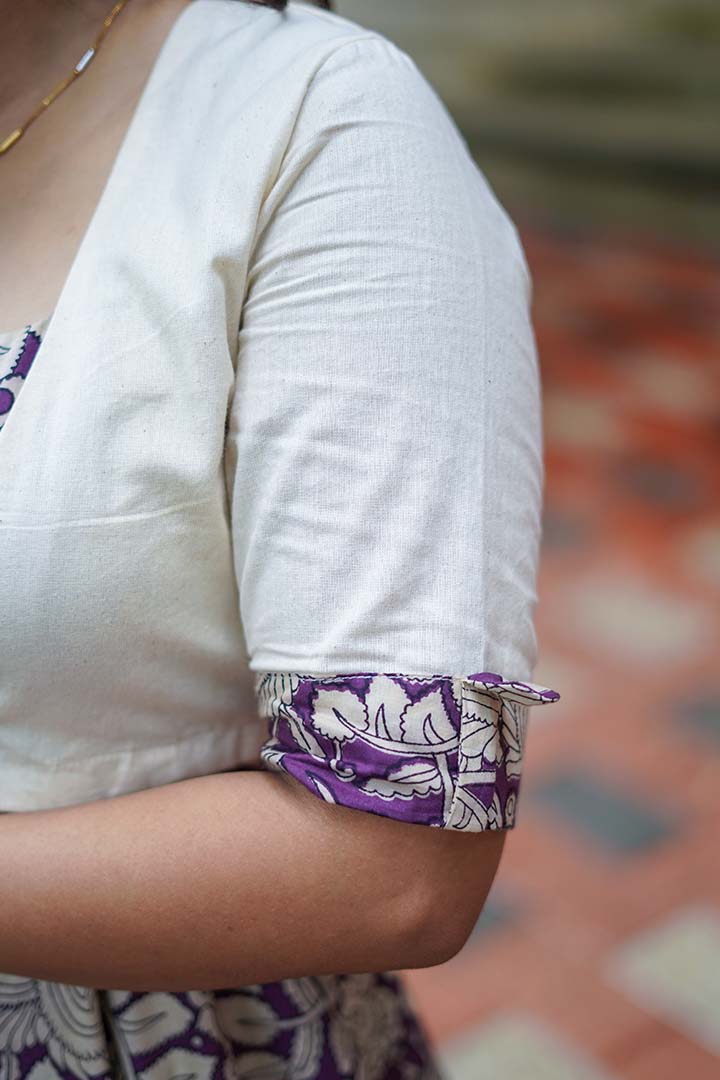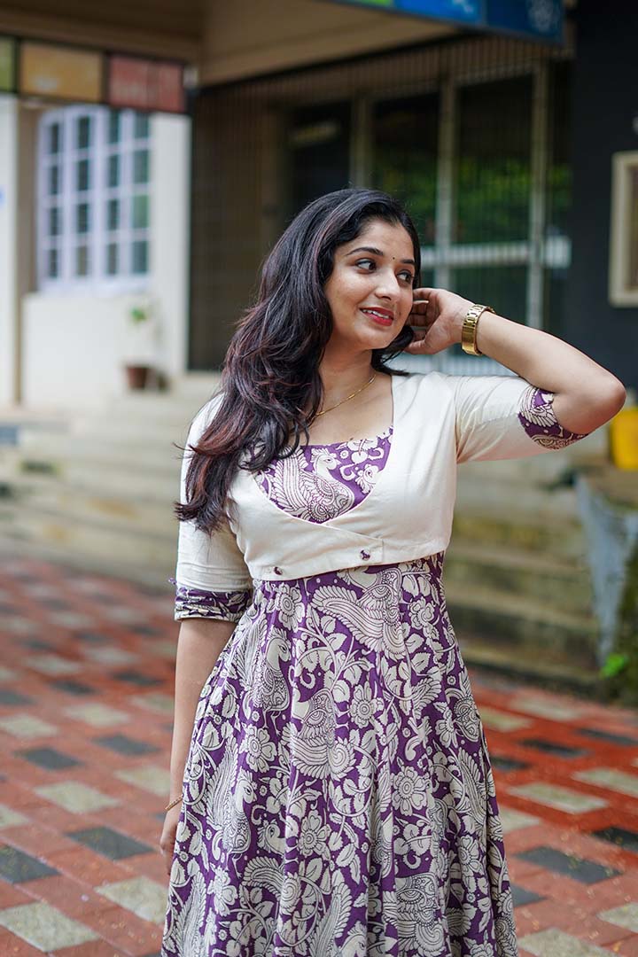 Bring effortless elegance to your wardrobe with this White and Purple umbrella frock with coat. a perfect fusion of traditional charm and modern style. The inner frock, crafted from cotton kalamkari-printed fabric with full cotton lining, features a graceful square neckline and a flowy umbrella silhouette that flatters every body type. Layered with a flex cotton coat featuring elbow sleeves, this ensemble adds structure and sophistication. Designed for casual outings and office wear, the 47-inch frock ensures breathable comfort while giving a stylish, coordinated look.
