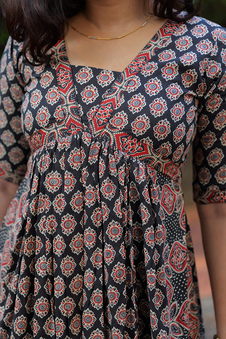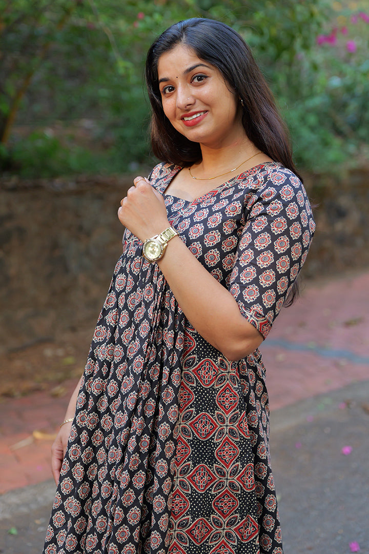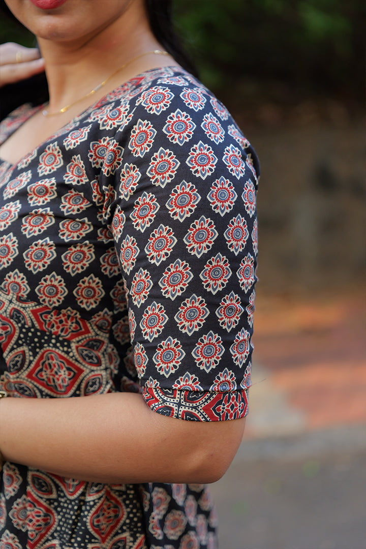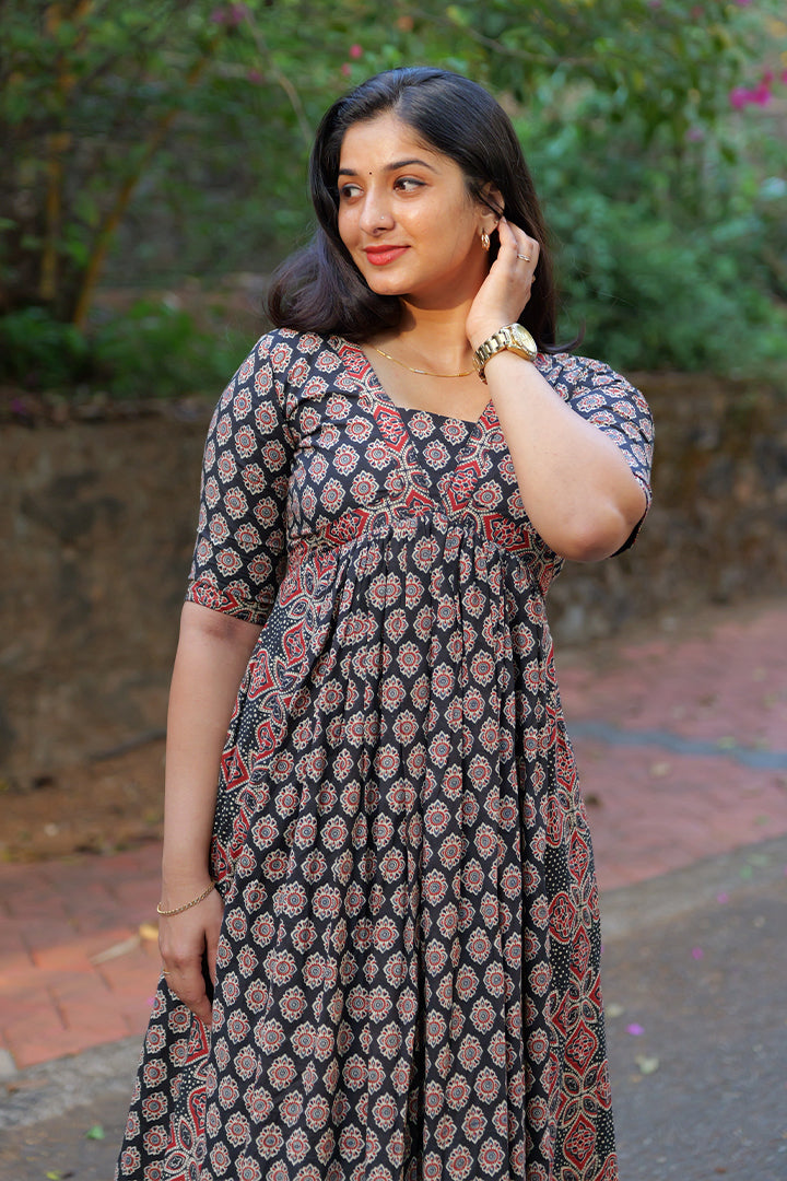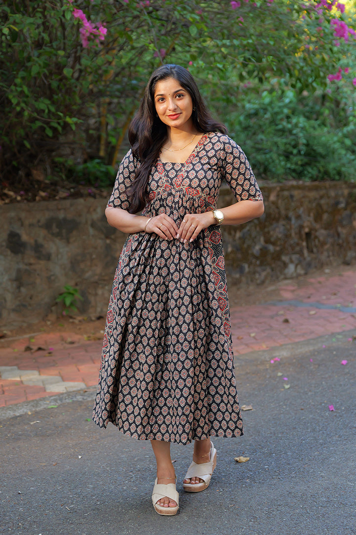 This multi-color Alia cut A-line dress is crafted from breathable cotton, making it ideal for casual, semi-functional, and office wear. It features a stylish bucket neckline with border detailing and elbow-length sleeves finished with matching borders, adding a refined touch. The Alia cut yoke with dual side panels using contrasting fabrics enhances the silhouette, creating a graceful and structured flow. Designed with a normal round back, 47-inch length, and cotton lining, this dress offers comfort, versatility, and elegant everyday styling.