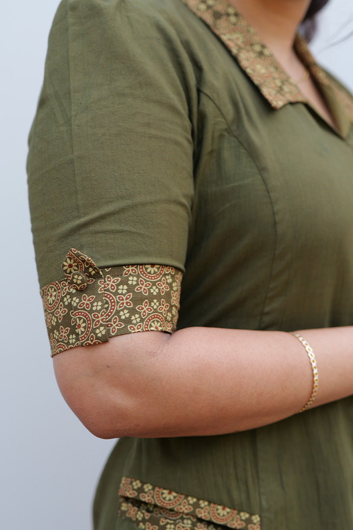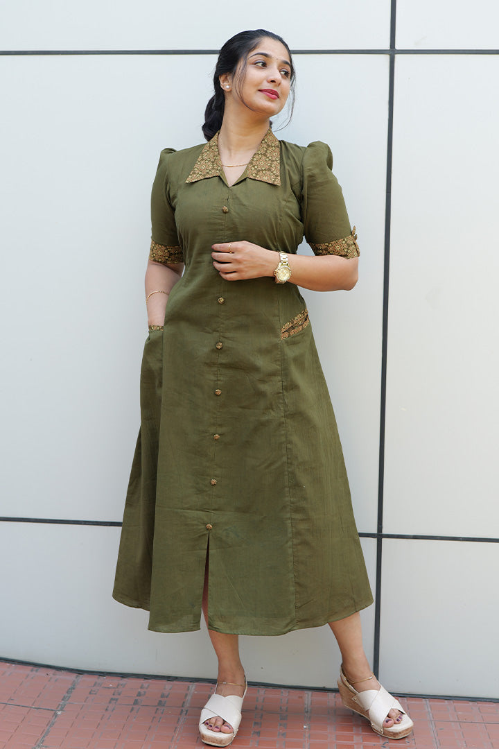 This Green Princess-cut A-line dress is crafted from breathable cotton, making it ideal for casual, semi-functional, and semi-formal occasions. Designed with a smart shirt collar and a structured princess-cut yoke with show buttons, the dress offers a tailored yet feminine silhouette. The elbow-length puff sleeves are enhanced with flap padi button detailing, adding refined charm. Finished with a collar-style back neck, 47-inch length, and comfortable cotton lining, this solid dress is beautifully accented with printed contrast detailing on the collar, cuffs, buttons, and pocket trim for a polished, contemporary look.
