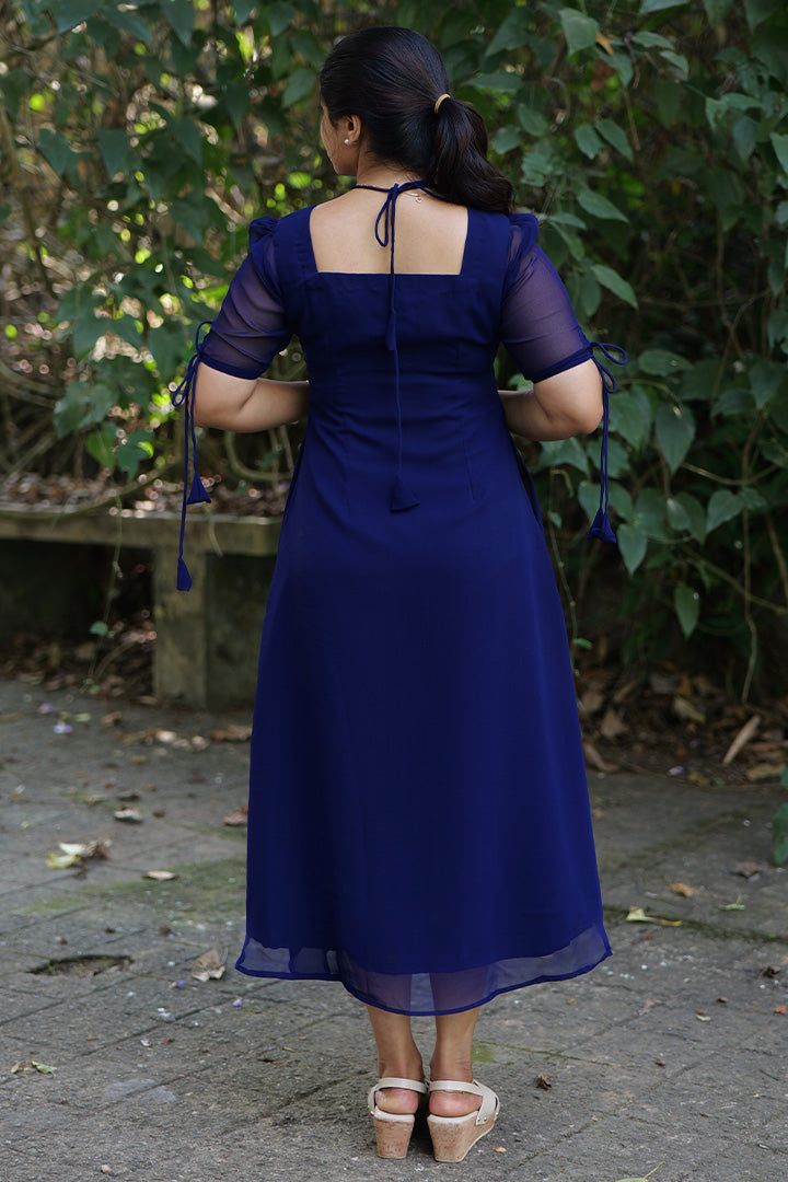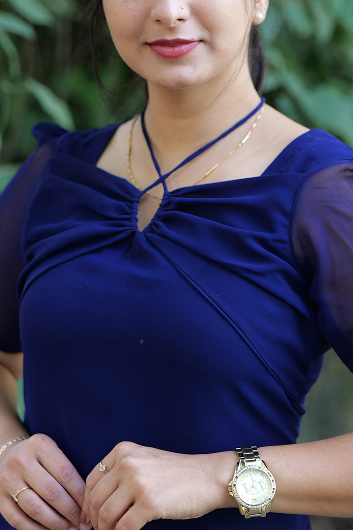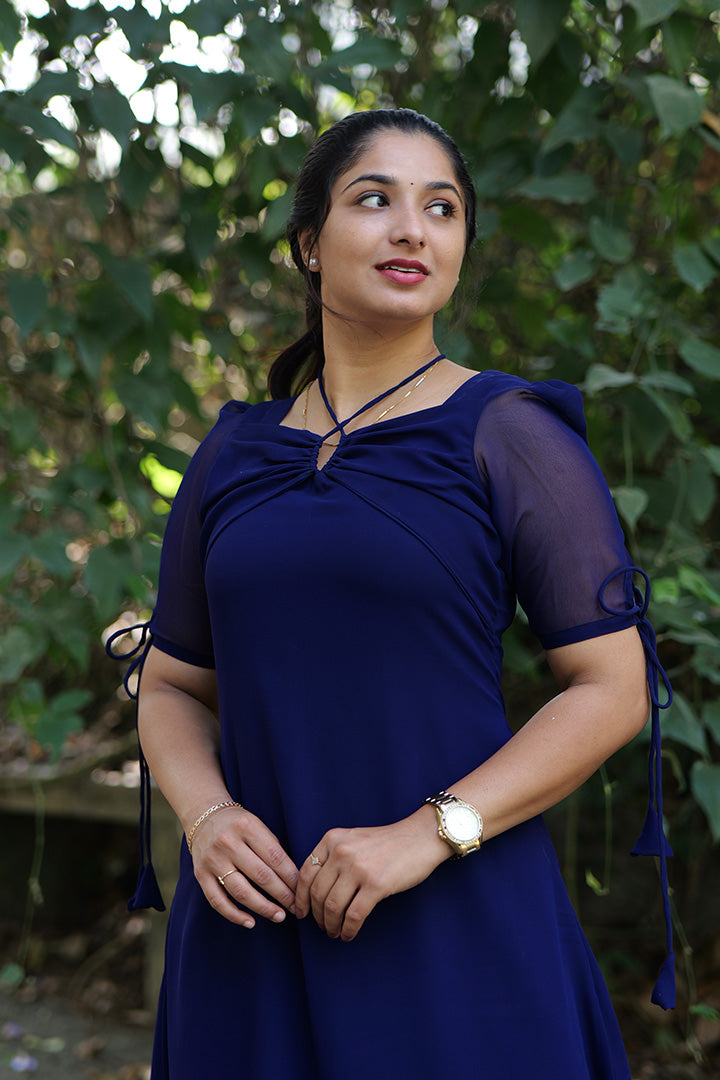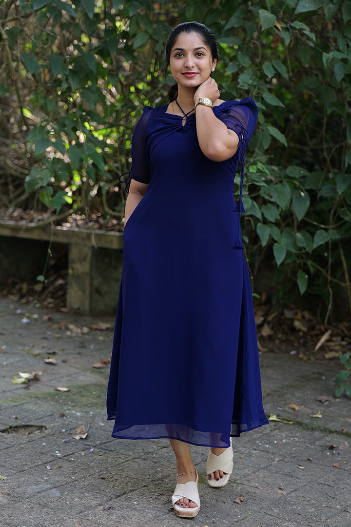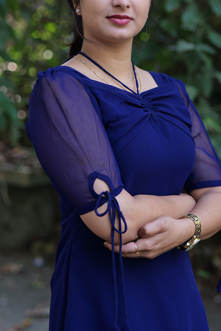 This Royal Blue A-line dress is crafted from lightweight georgette, making it a perfect choice for semi-functional occasions, casual outings, and office wear. The design features elbow-length puff sleeves with delicate end tie-up detailing, adding a soft, feminine touch. A stylish keyhole neckline with spaghetti tie detail pairs beautifully with the twisted front yoke, creating an elegant focal point. Finished with a square back neckline, a flattering 47-inch length, and smooth crepe lining, this dress offers effortless sophistication with comfortable wearability.