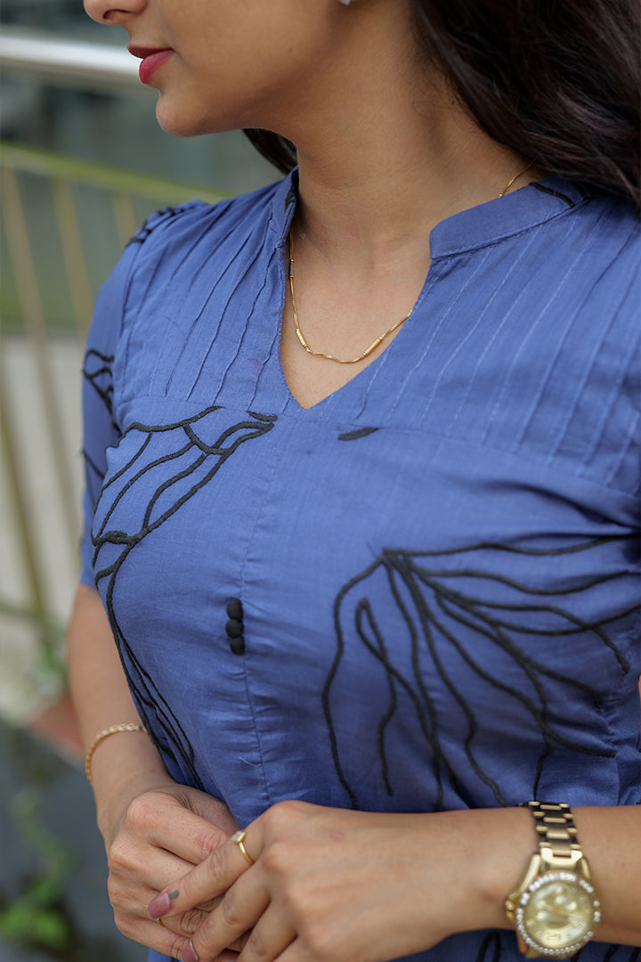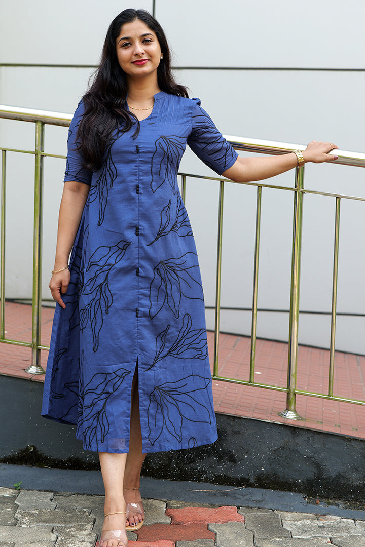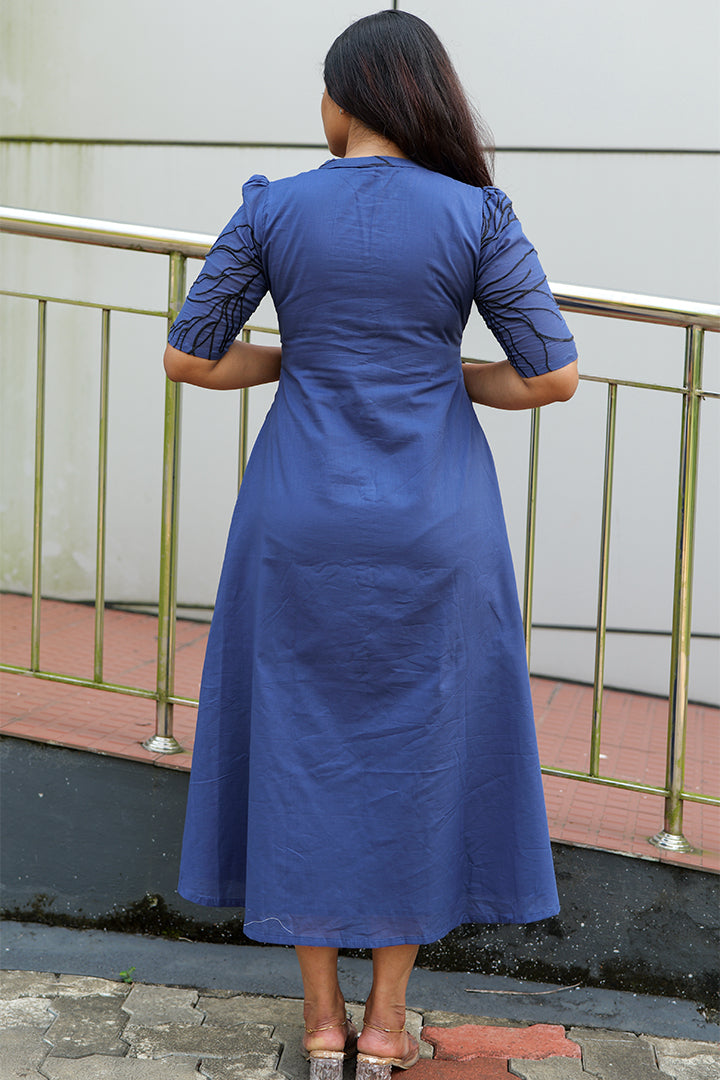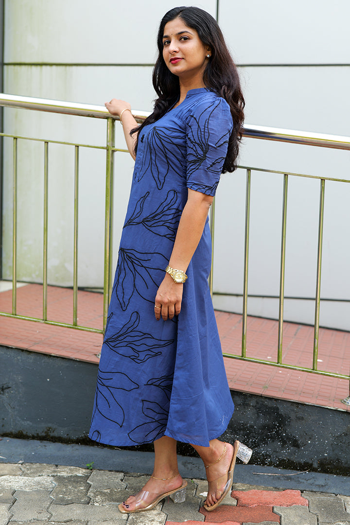 Elevate your everyday wardrobe with this elegant A-line dress crafted in premium cotton thread embroidery fabric. Designed in a rich midnight blue shade, this dress features a refined Chinese collar and a beautifully detailed pintuck yoke that adds structure and sophistication. The semi-puffed elbow-length sleeves enhance comfort while maintaining a graceful silhouette. A mock front opening adorned with delicate potli buttons adds a subtle design highlight. Fully lined with soft cotton for all-day ease, this 46-inch A-line dress is perfect for casual outings, office wear, and semi-formal occasions, offering a seamless blend of style, comfort, and versatility.