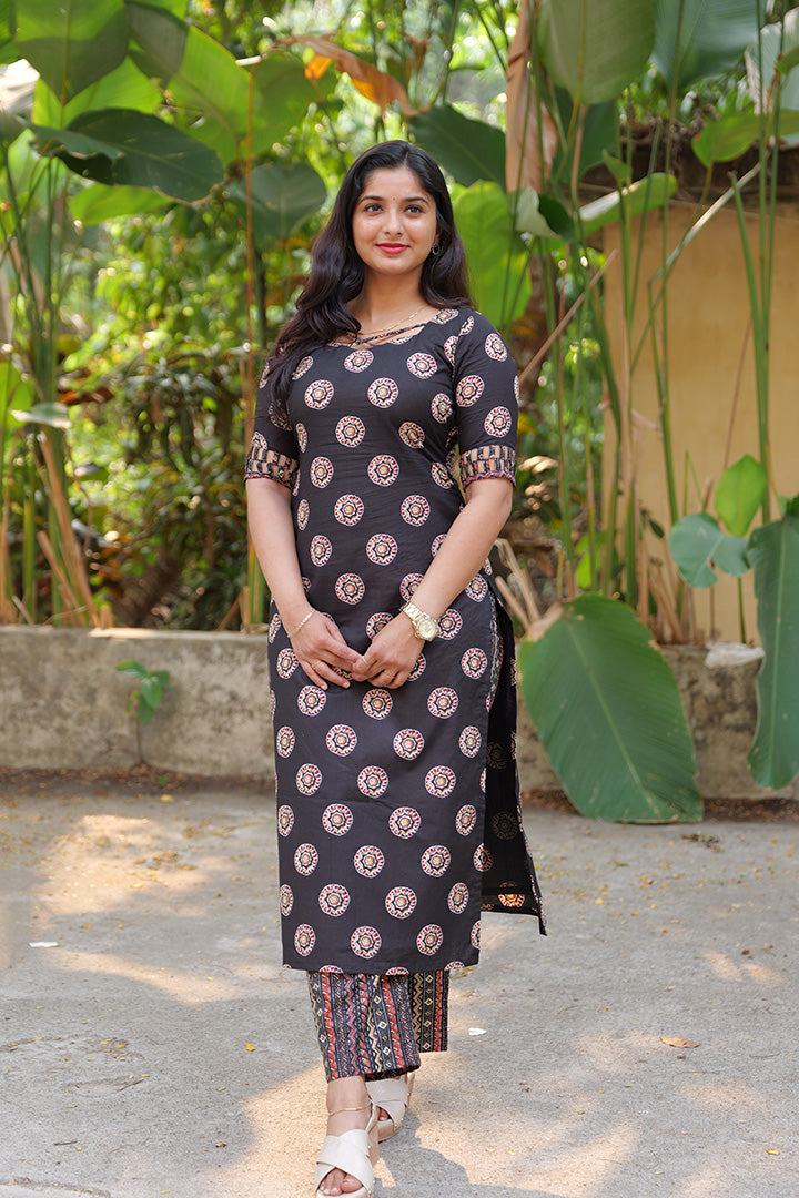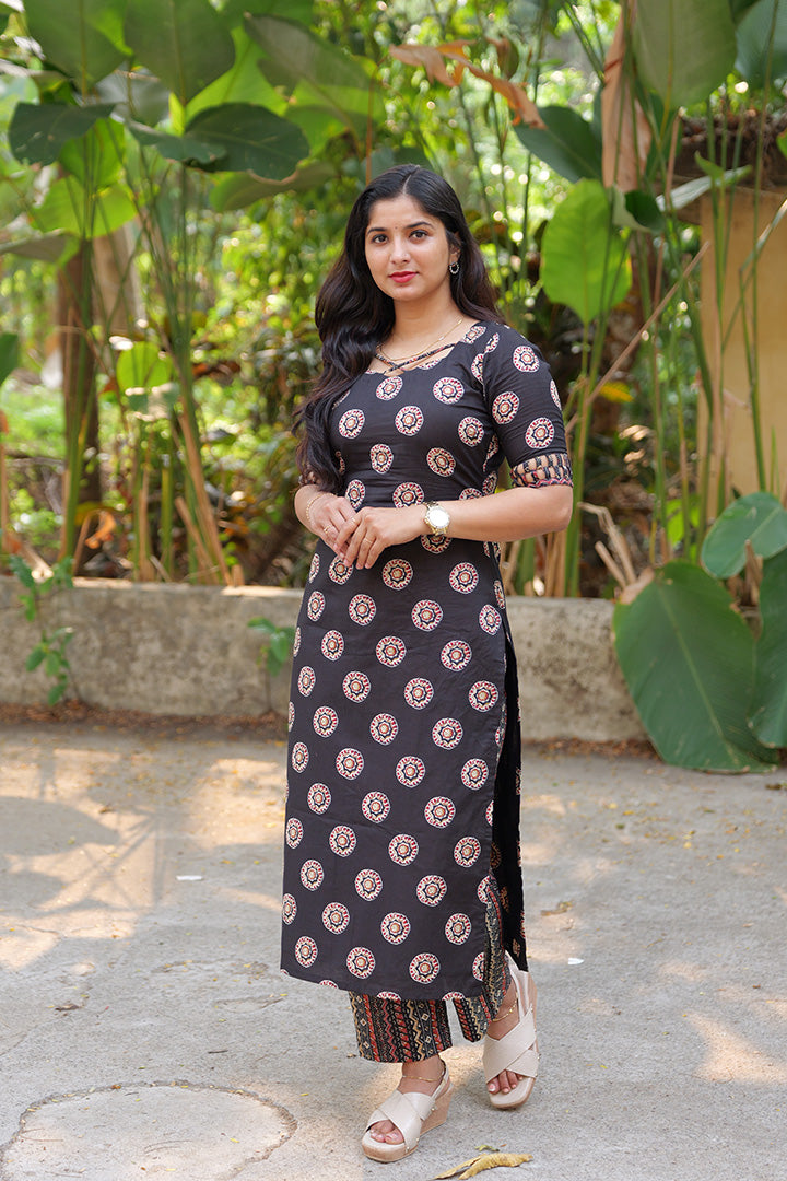 This black cotton top is designed for casual and office wear, blending contemporary style with comfortable wearability. It features elbow-length sleeves with intricate lattice cut-out detailing and contrast borders at the hem, adding a unique and elegant touch. The square V neckline with criss-cross detail enhances the structured look, while the deep square back with multi-strap criss-cross tie-up creates a striking design element. Finished with soft cotton lining and a 47-inch length, this top offers breathable comfort and a refined silhouette.