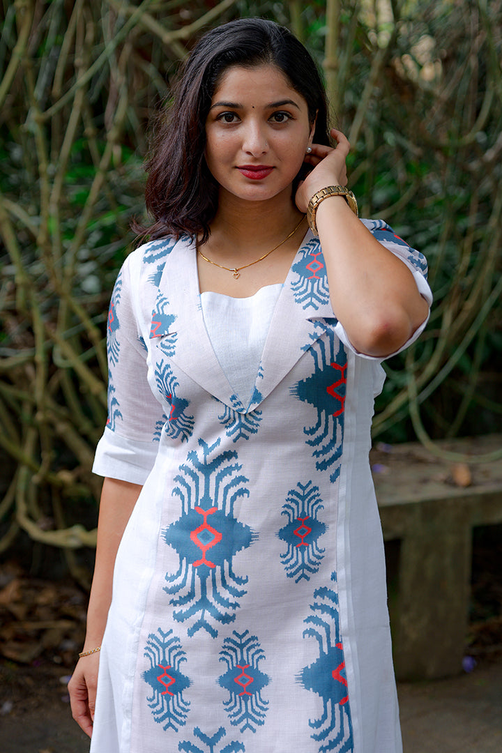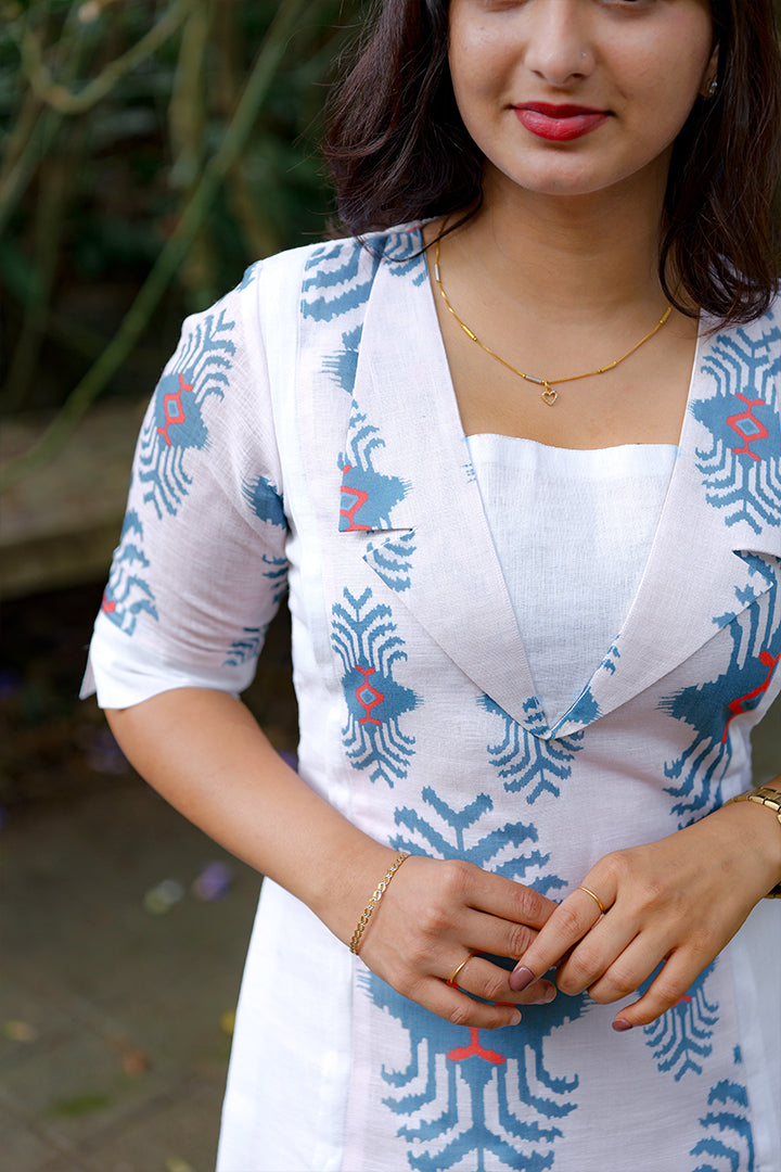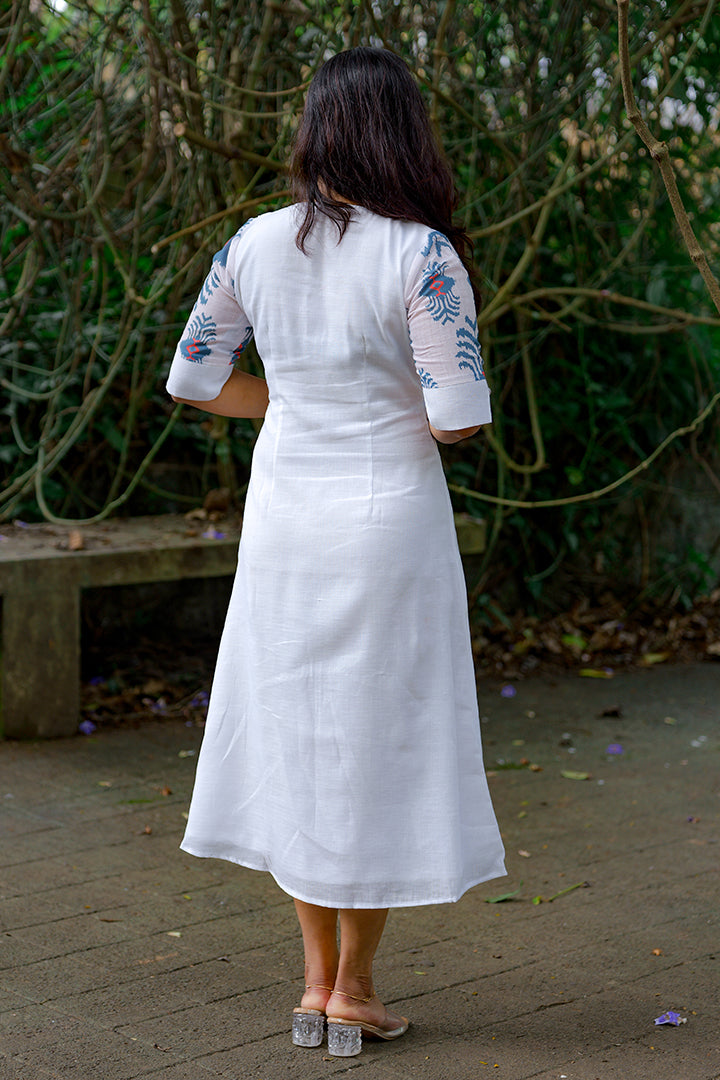 Step into effortless elegance with this White A-line dress tailored from breathable semi-linen fabric. Designed for casual and semi-formal occasions, it features a stylish V-neck with a notched collar flap design, giving the outfit a refined yet modern touch. The elbow sleeves add a neat, structured look, while the three-panel A-line silhouette enhances movement and comfort. Finished with a smooth crepe lining and a 46-inch length, this dress is perfect for everyday sophistication.