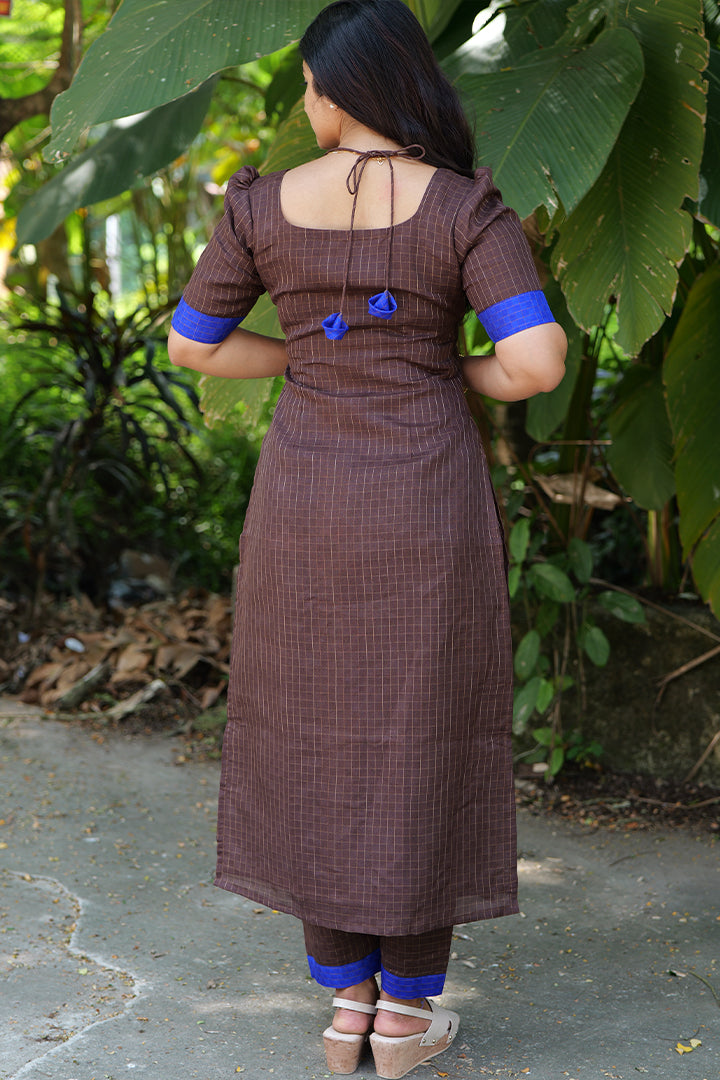 This Royal Blue and Brown Co-Ord Set is crafted from durable Levis fabric, making it ideal for semi-functional occasions, casual outings, and office wear. The top features a stylish square neckline with scalloped detailing and a tie-up accent, paired with a matching square yoke for a cohesive look. Designed with elbow-length puff sleeves finished with bordered ends, the set offers a balanced and elegant silhouette. Completed with a square back neckline, a 47-inch length, and comfortable cotton lining for both top and bottom and the bottom right side have pocket.this co-ord set blends structured design with everyday comfort.