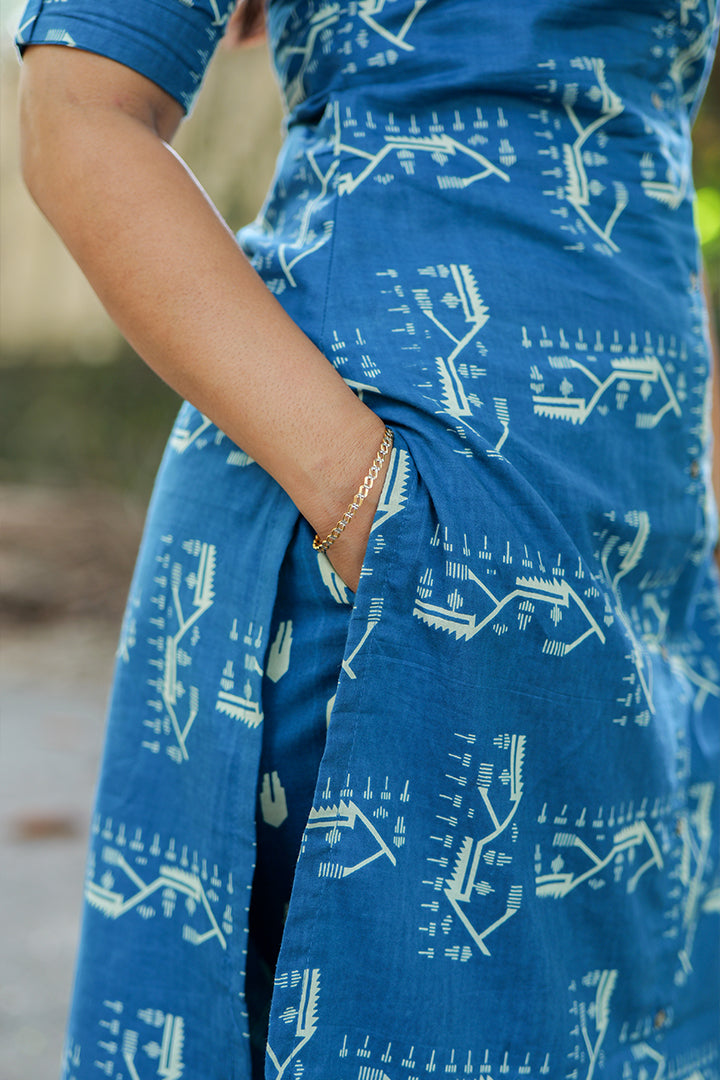 This Azure Blue Cotton Co-Ord Set is designed for casual outings and office wear, blending comfort with a smart, tailored look. The top features a refined notched collar, mock-open button detailing, and elbow-length sleeves with flap and loop accents, finished with a structured collar-style back neck. The straight-cut bottom comes with a functional right-side pocket, adding everyday practicality. Crafted from breathable cotton with soft cotton lining and a 47-inch length, this co-ord set offers effortless elegance with functional design.
