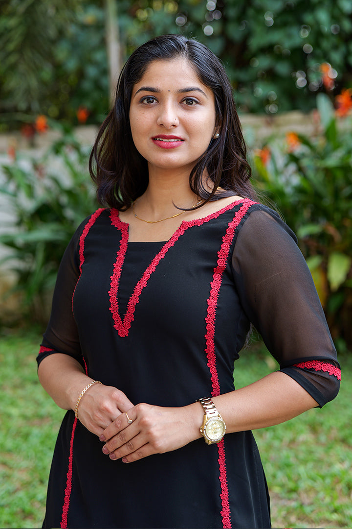Elevate your everyday ethnic wardrobe with this elegant black straight-cut kurta set, designed to balance minimal sophistication with subtle statement detailing. Crafted from lightweight georgette fabric and lined with soft crepe for added comfort, this kurta ensures a graceful drape and ease of wear throughout the day. The classic boat neckline is enhanced with contrast red lace detailing that continues along the front panel, sleeves, creating a refined yet eye-catching accent against the rich black base. Featuring 3/4th sheer sleeves the ensemble exudes understated elegance suitable for semi-formal and casual occasions. Finished with a normal round back yoke and a straight silhouette of 47 inches in length, this kurta is ideal for those who prefer a clean, timeless look with a touch of modern charm. Perfect for office wear, casual gatherings, or daytime events, this versatile black kurta set is a must-have addition to your ethnic collection.