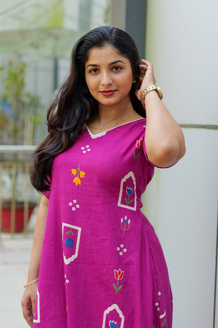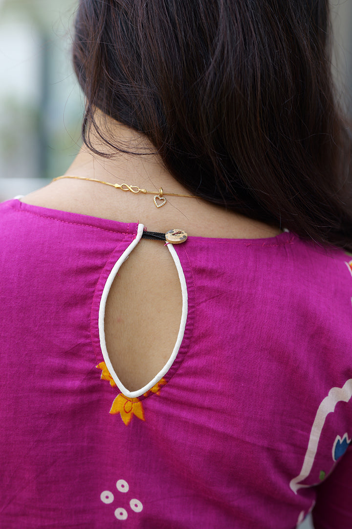 This Magenta Pink Cotton Co-Ord Set is designed for effortless casual and office wear, offering a perfect balance of comfort and style. The top features a flattering V-neck with piping detail and elbow-length sleeves finished with a V-cut, adding a refined design touch. The back is styled with a round neckline and subtle cut-out detail, enhancing the modern appeal. Crafted in breathable cotton with smooth crepe lining, this 47-inch A-line co-ord set delivers a clean silhouette ideal for everyday elegance