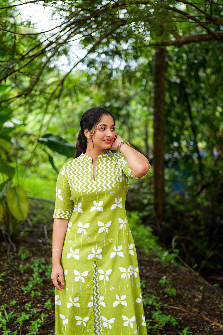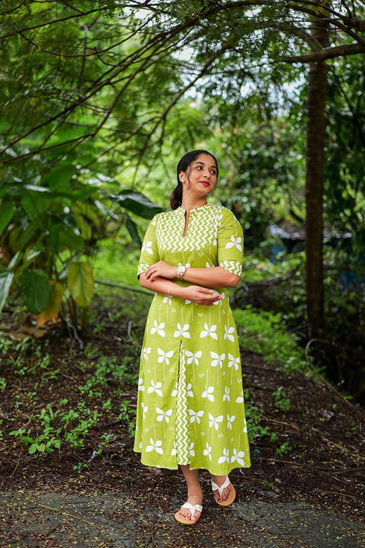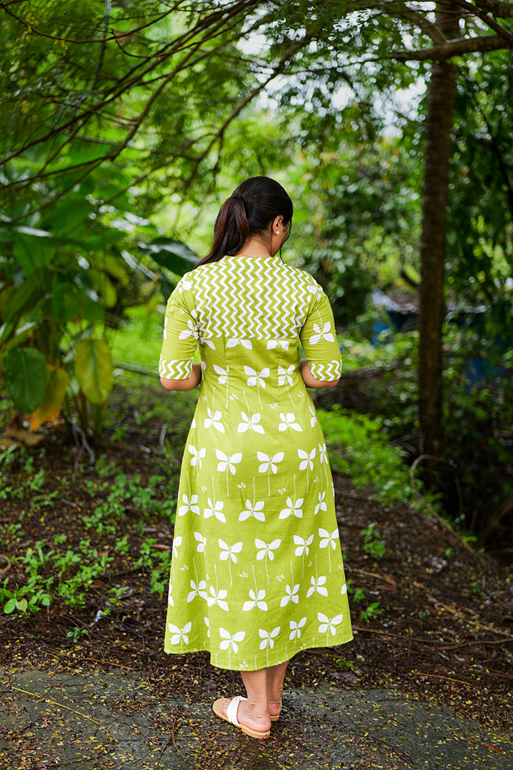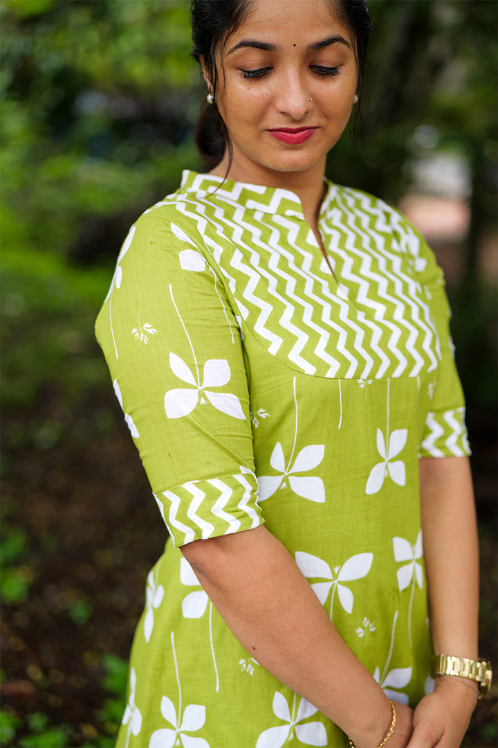 Step into effortless style with this olive green cotton A-line dress, designed with a smart collar neckline and elbow-length sleeves. The yoke is highlighted with contrasting printed fabric, adding a unique touch to the solid base. Falling gracefully at 47 inches, this dress is fully lined with cotton for breathable comfort, making it perfect for both casual wear and semi-formal occasions.