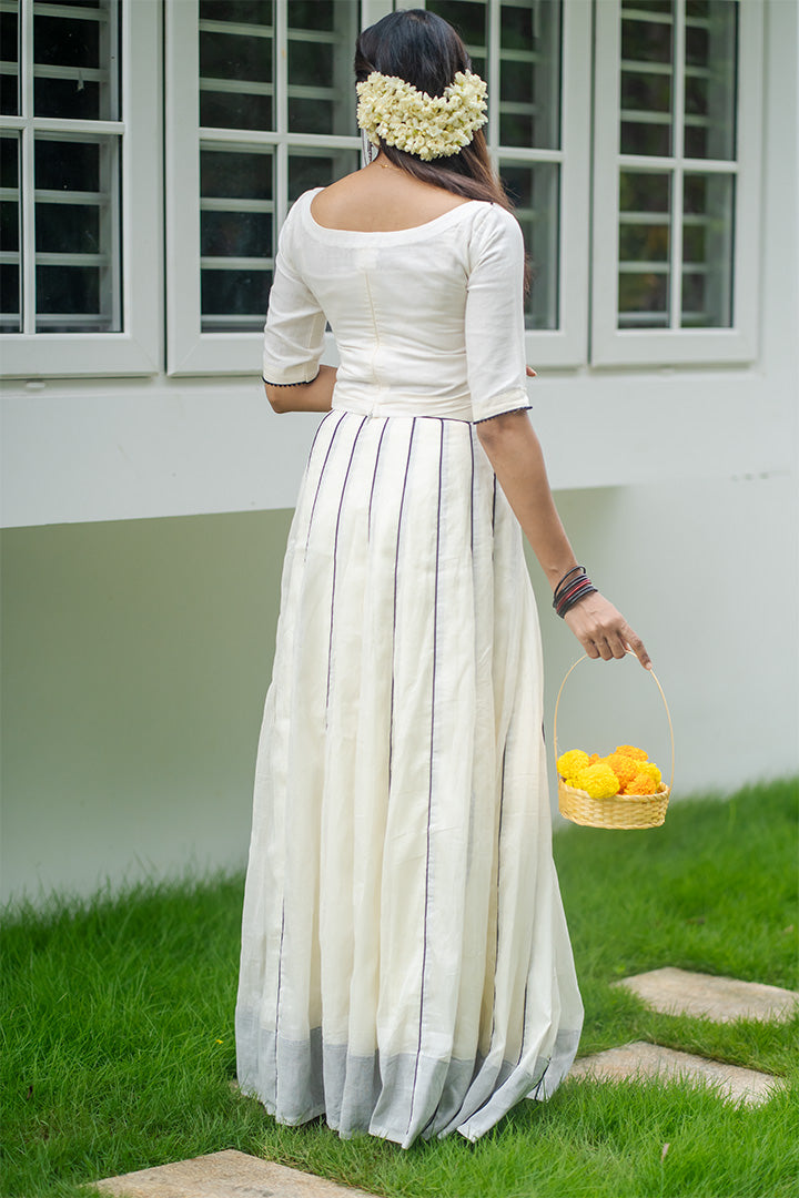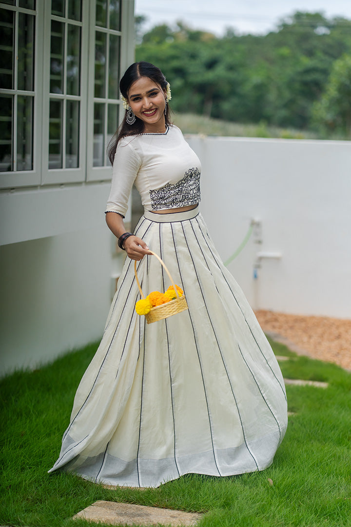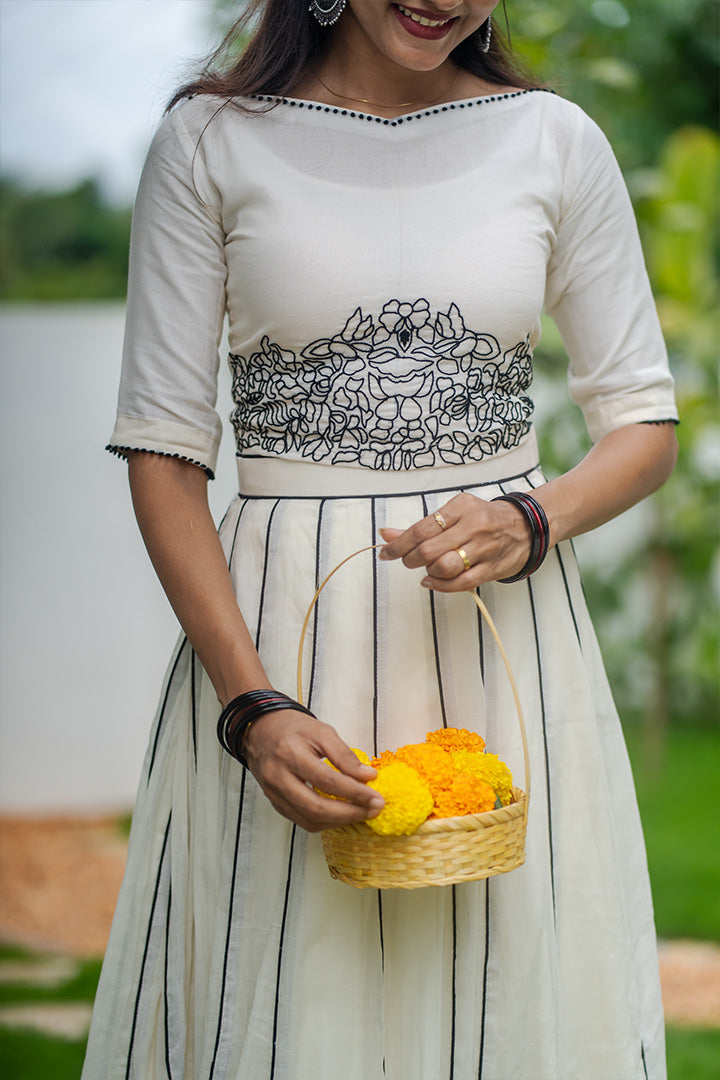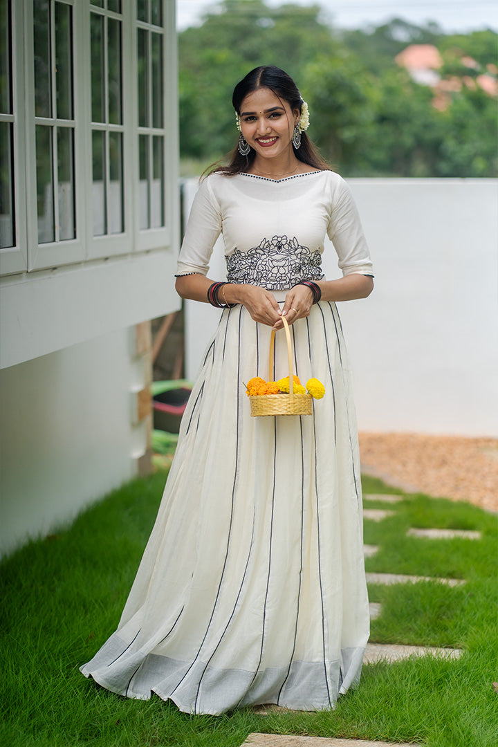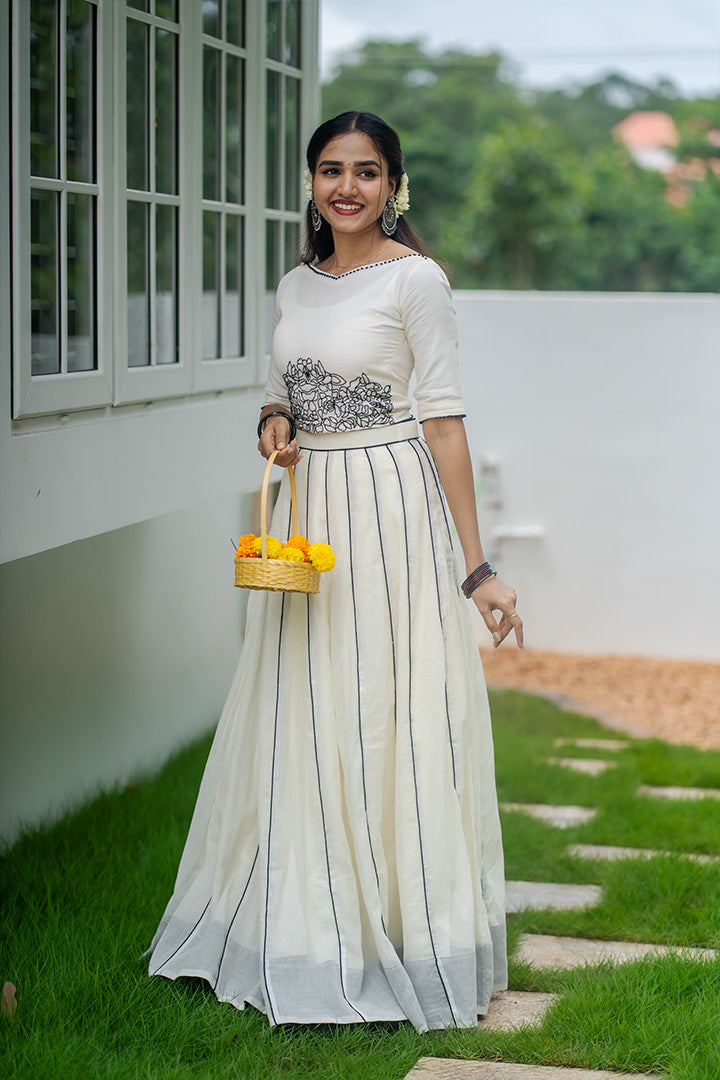 Elevate your festive wardrobe with this beautifully handcrafted Onam outfit, made from breathable cotton for all-day comfort. This traditional yet trendy ensemble features a thread-worked, back-open crop top with elegant elbow sleeves and a boat neckline, perfectly complemented by a full-length, flared panel skirt enhanced with delicate black piping. Designed in classic off-white and black, this outfit blends timeless charm with modern sophistication, making it ideal for Onam, festivals, and traditional functions.