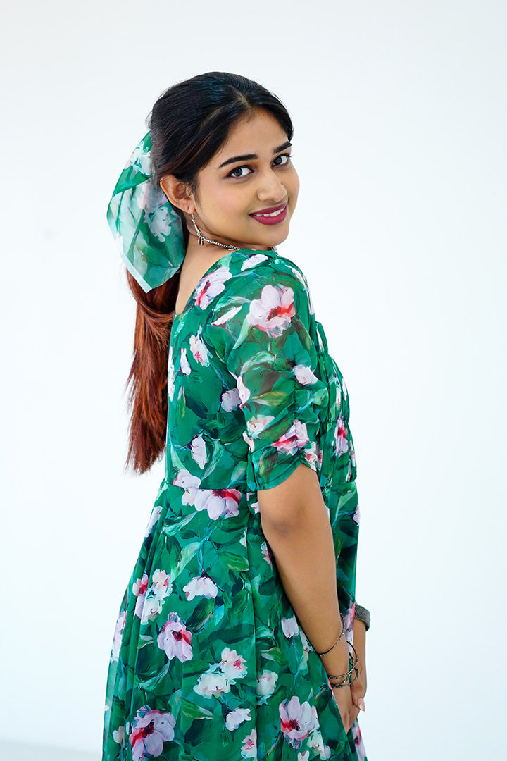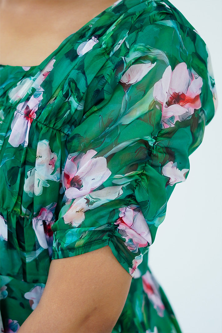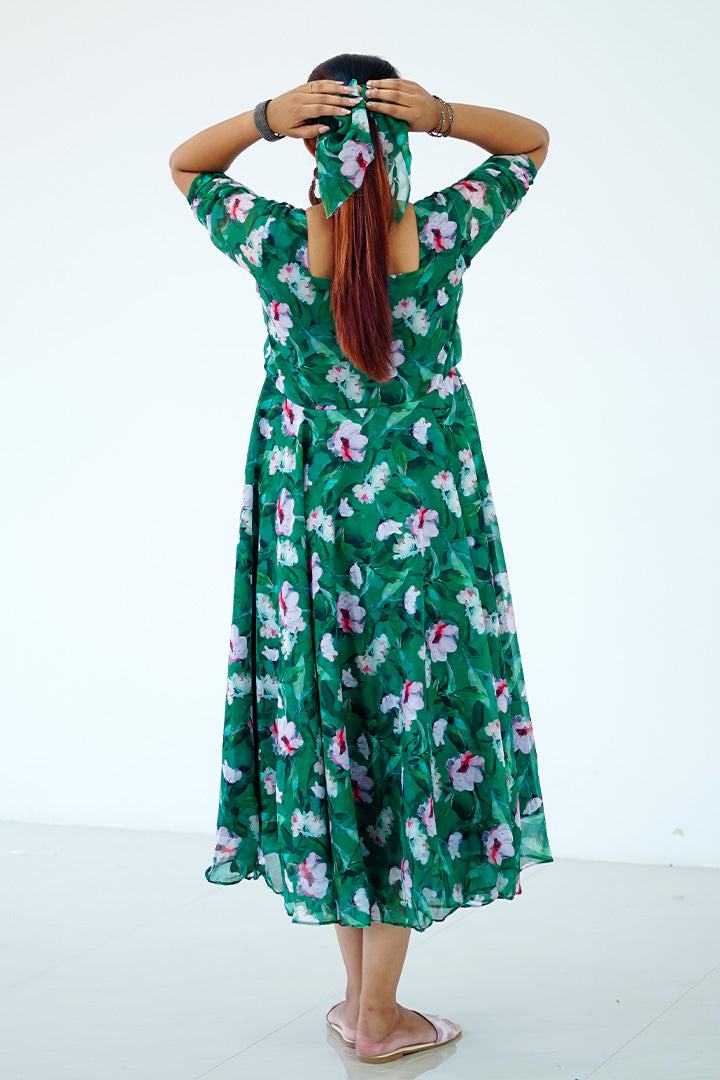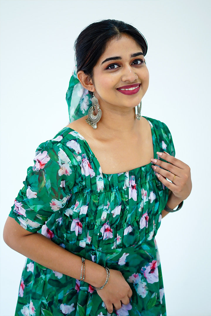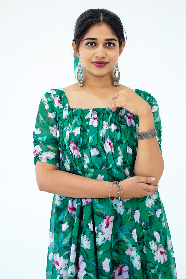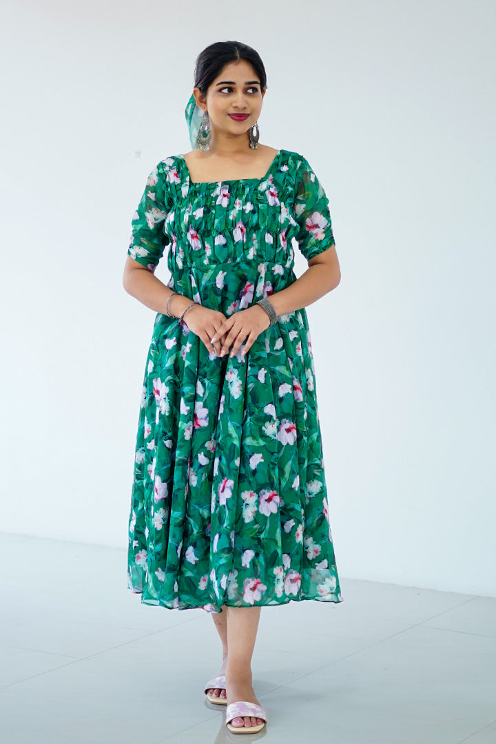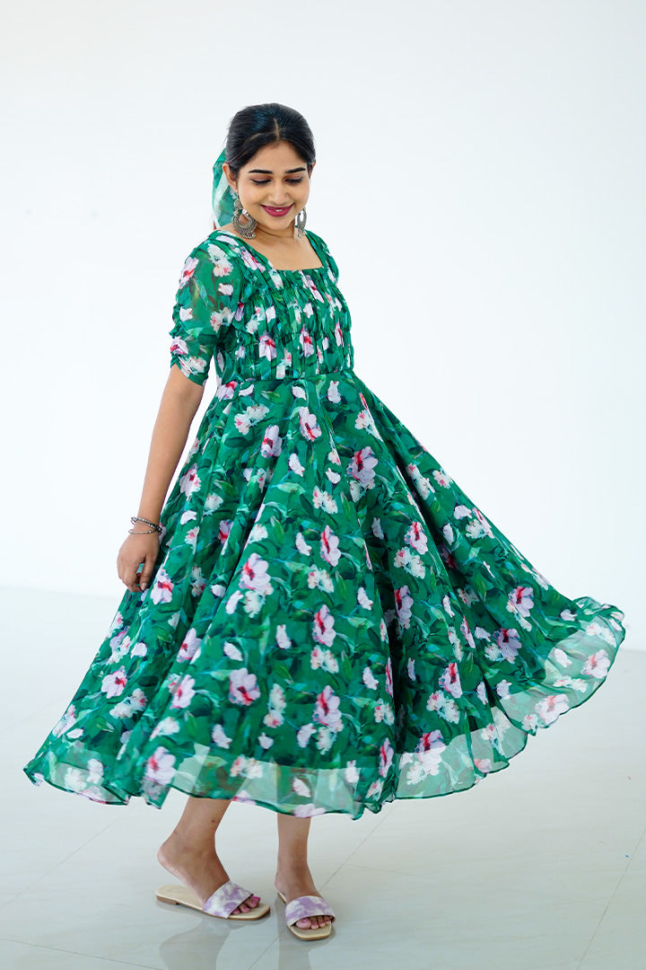 Check out this stunning green organza dress with elbow sleeves and a square neckline. Perfect for casual outings or semi-party events, its unique umbrella cut frock design in a vibrant green hue is sure to turn heads. The pleated yoke adds a touch of elegance, while the crepe lining ensures comfort all day long. With a length of 47 inches, it's both chic and practical for various occasions.