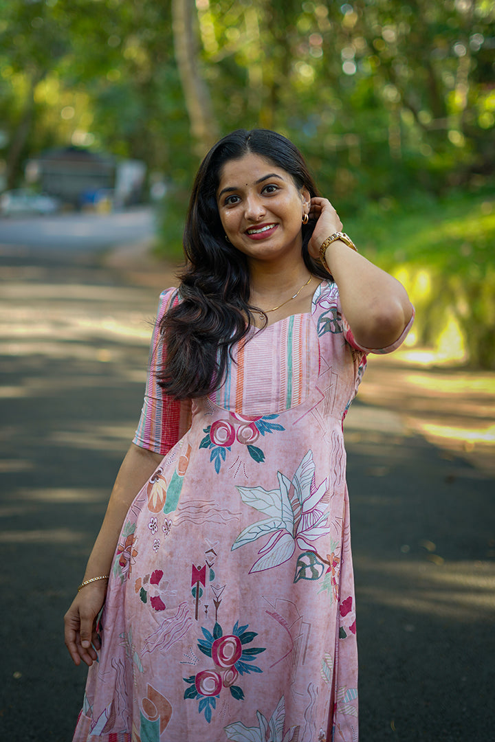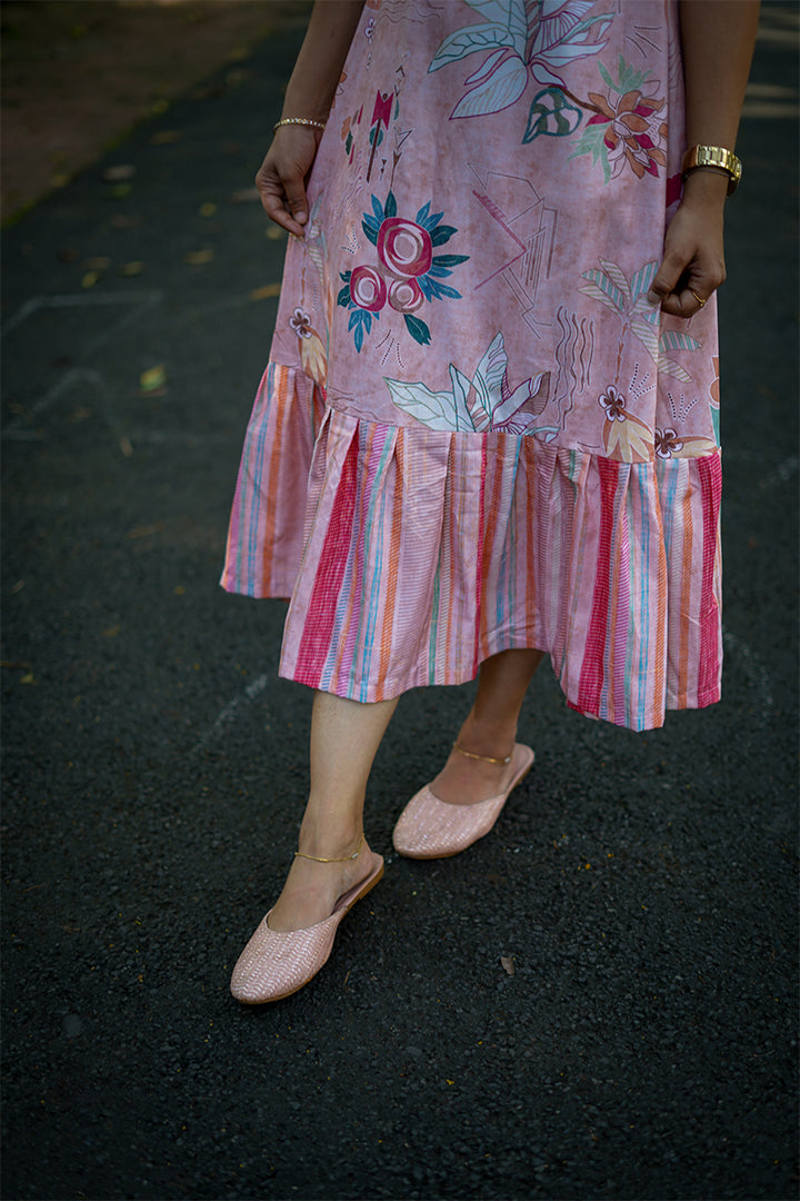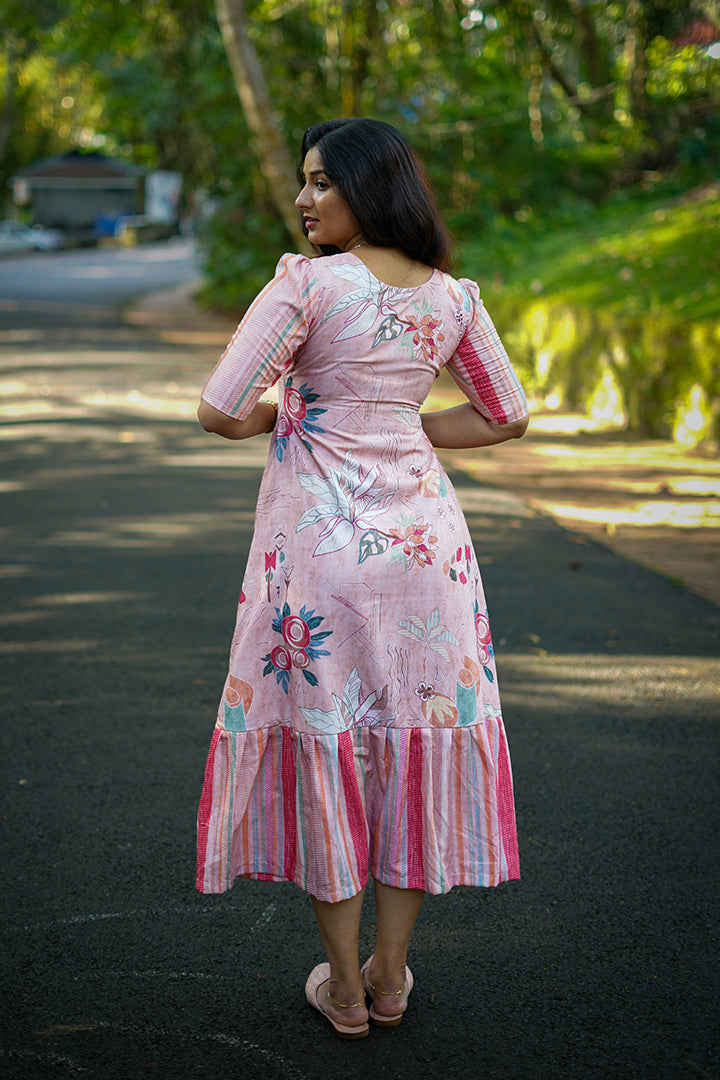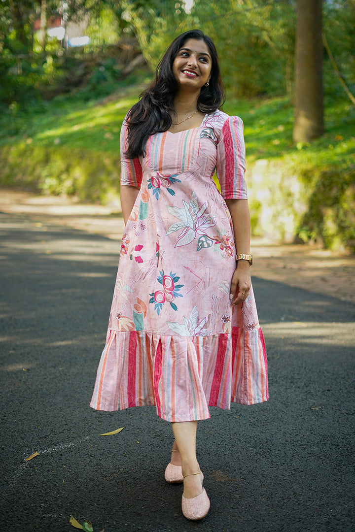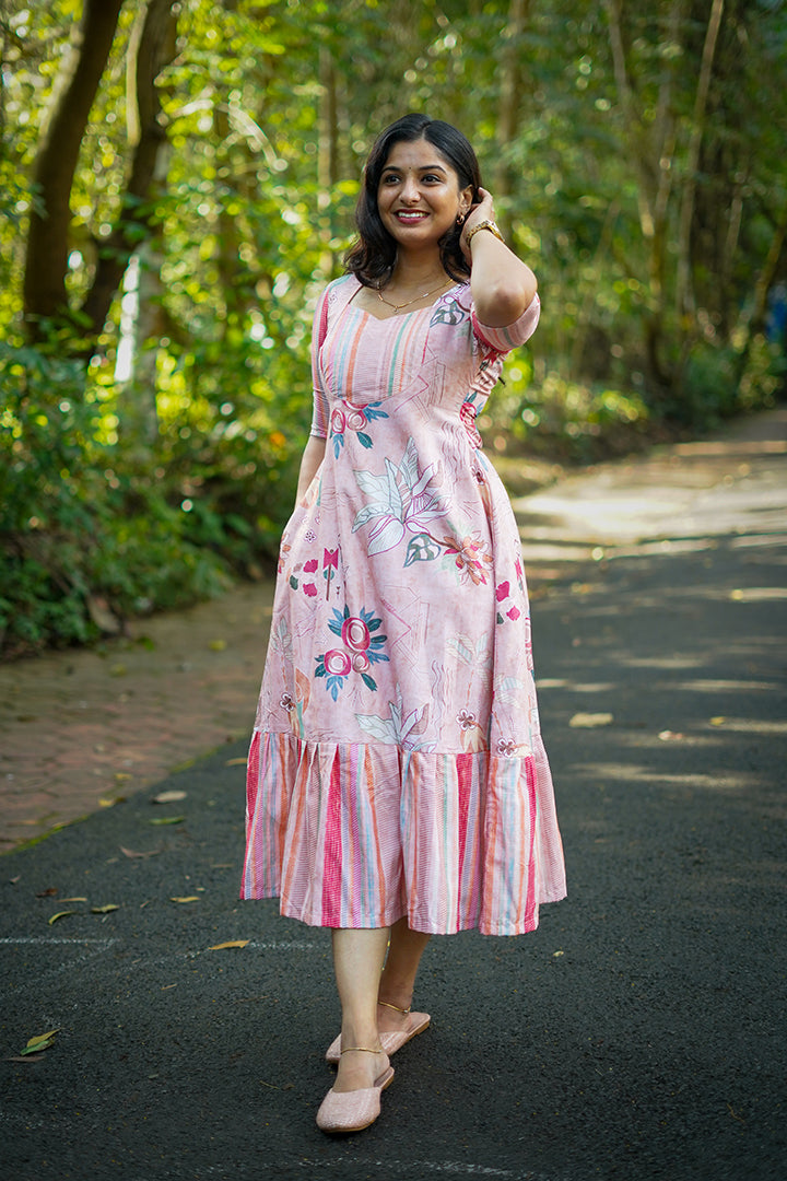 Stay stylish and comfortable in this Blush Pink A-line Cotton Dress, featuring a beautiful blend of multicolor floral and striped prints. Designed with a flattering sweetheart neckline, puff elbow sleeves, and a gathered hem, this dress combines modern charm with classic elegance. The yoke, sleeve, and hemline are detailed with variant printed fabric, adding a layered and artistic touch. Crafted from soft cotton with full lining, it ensures breathability and ease of wear. Thoughtfully designed with two functional side pockets, this 47-inch dress is perfect for office wear or casual occasions, offering both comfort and sophistication.