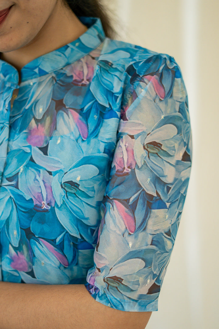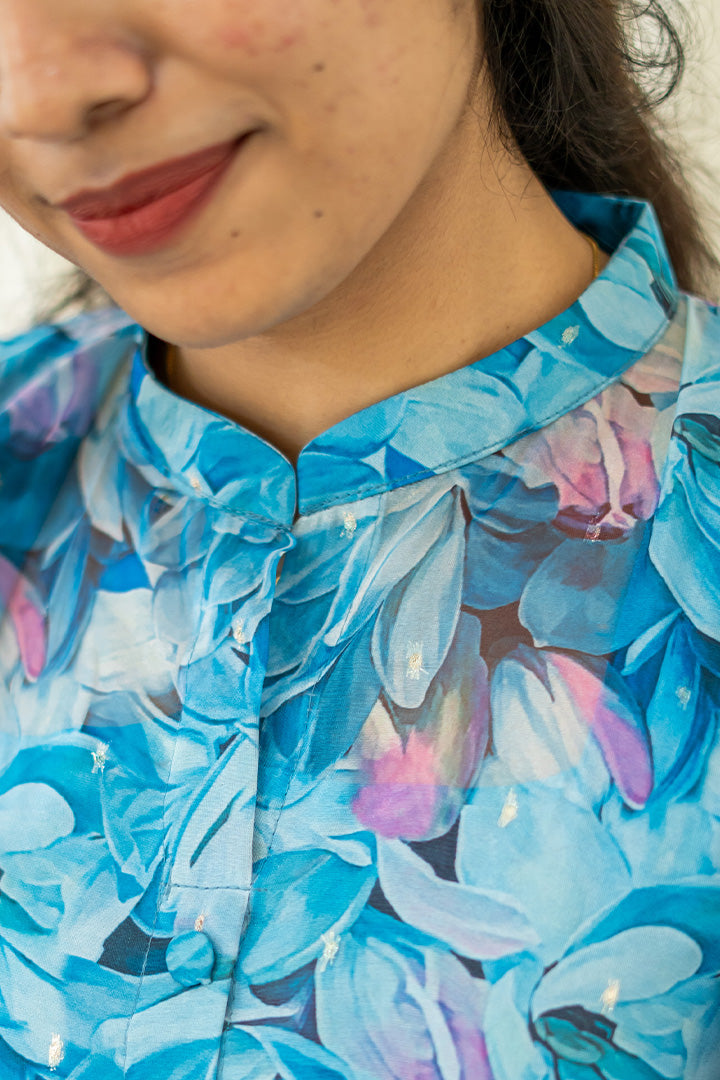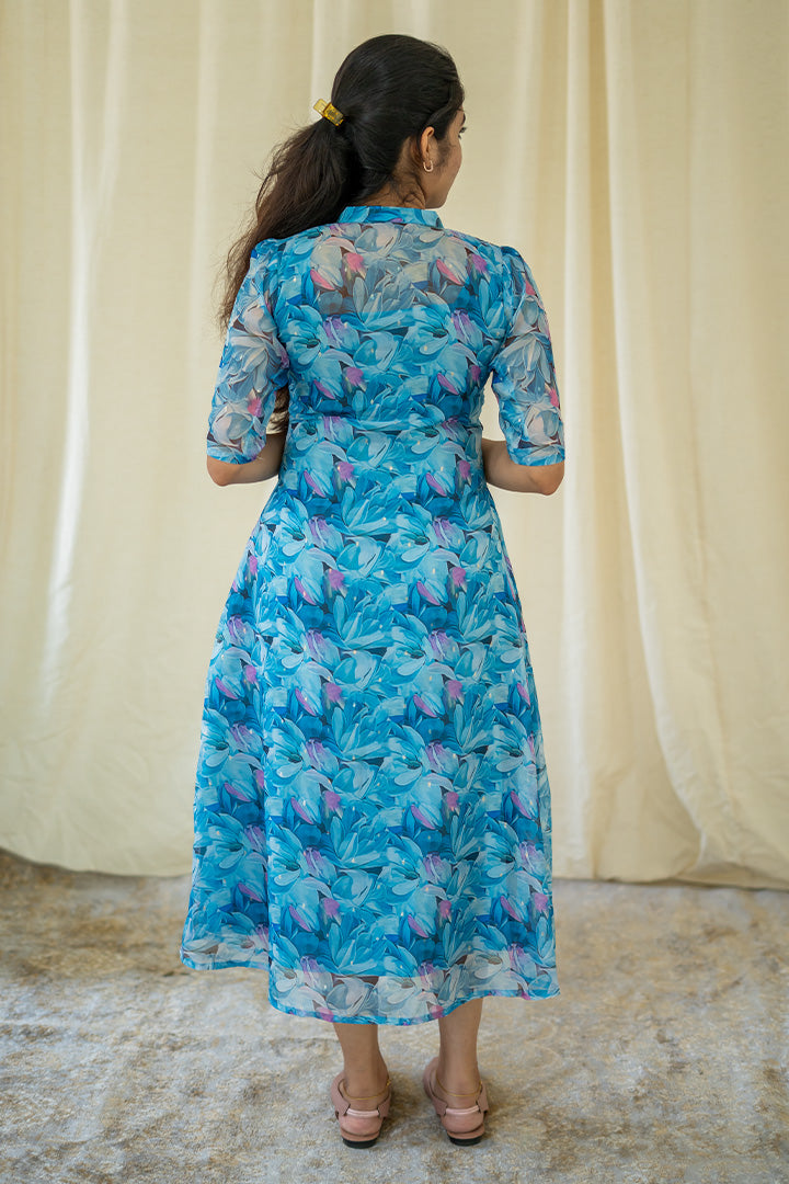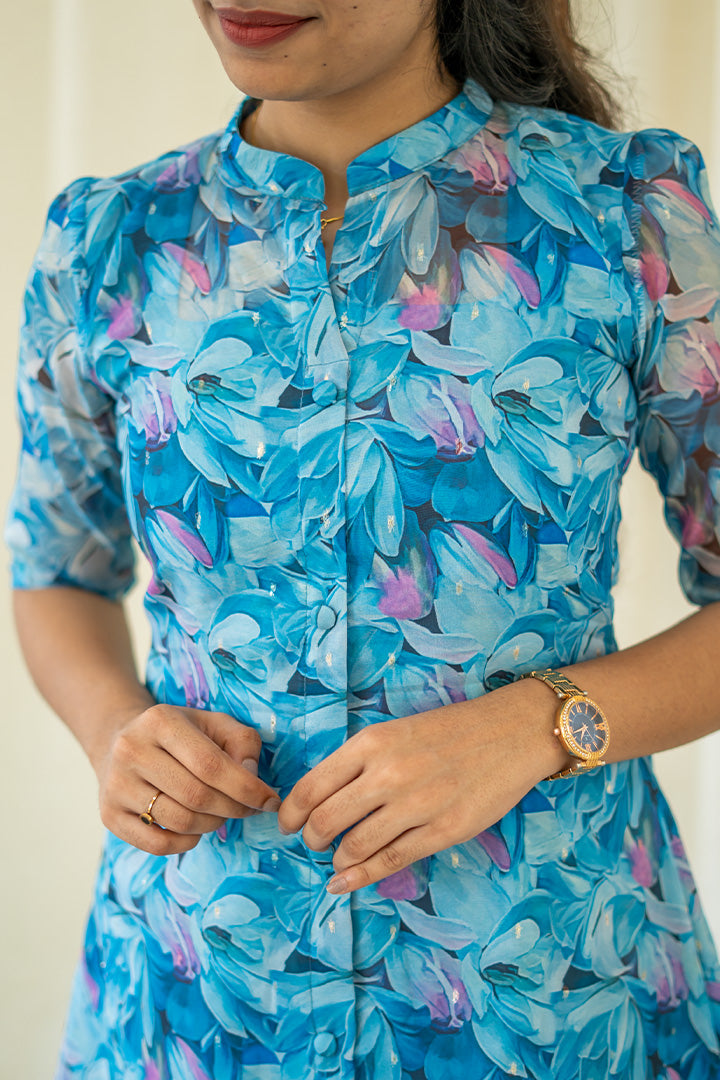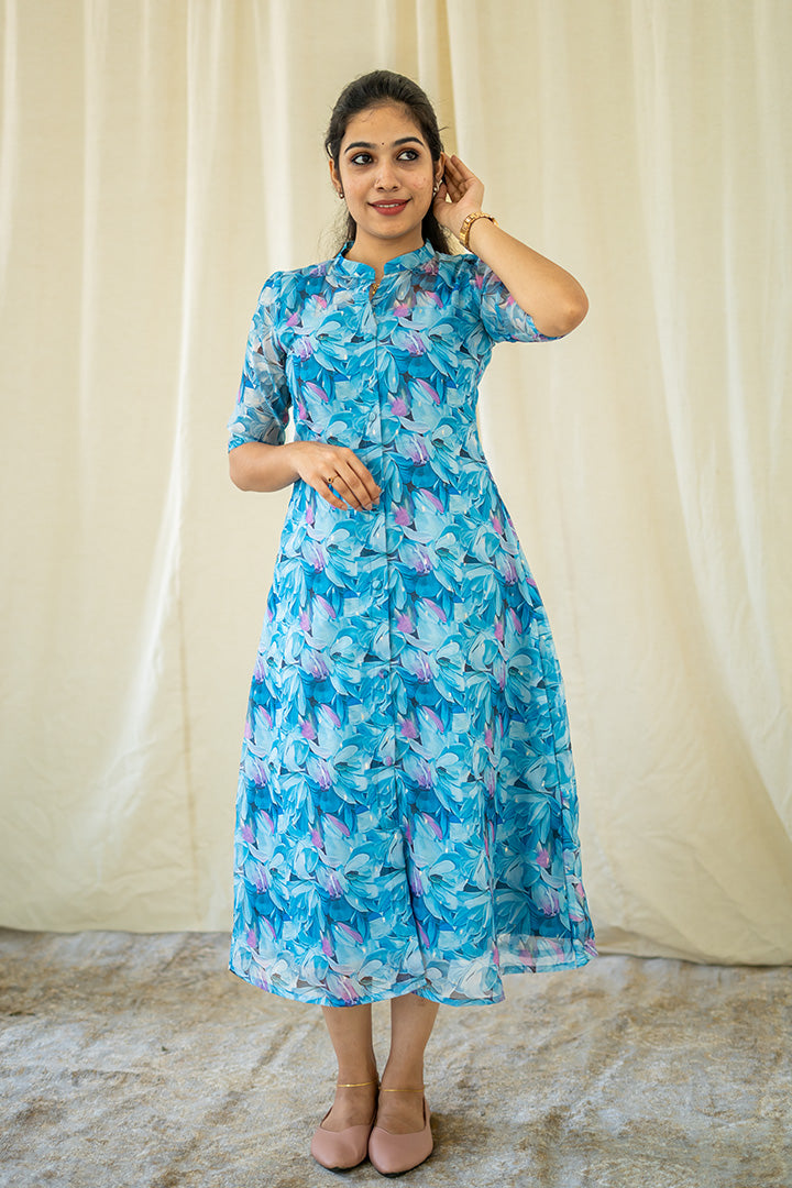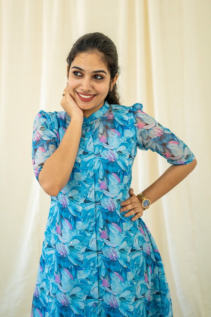 This elegant blue organza A-line dress blends sophistication with subtle statement details. It features a Chinese collar and a front patti with fabric-covered buttons that lend it a refined touch. The puff-style elbow sleeves are sheer for a delicate, feminine look, while the crepe lining ensures comfort and coverage. With a 45-inch length and graceful silhouette, this piece is ideal for casual, semi-formal, or semi-functional events.