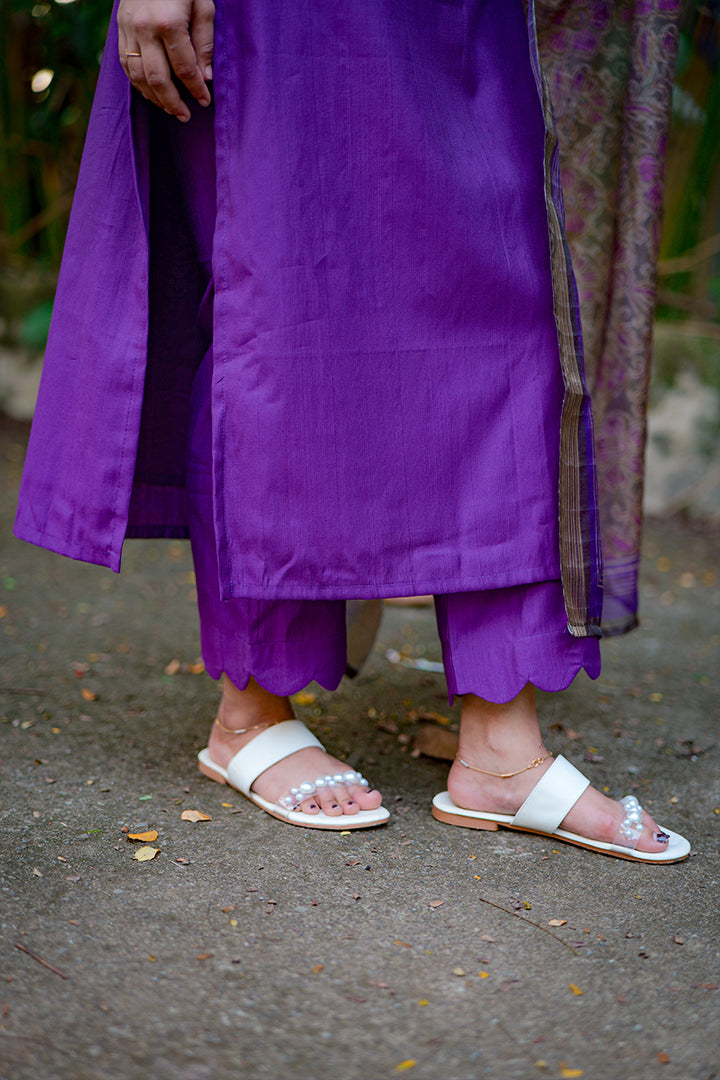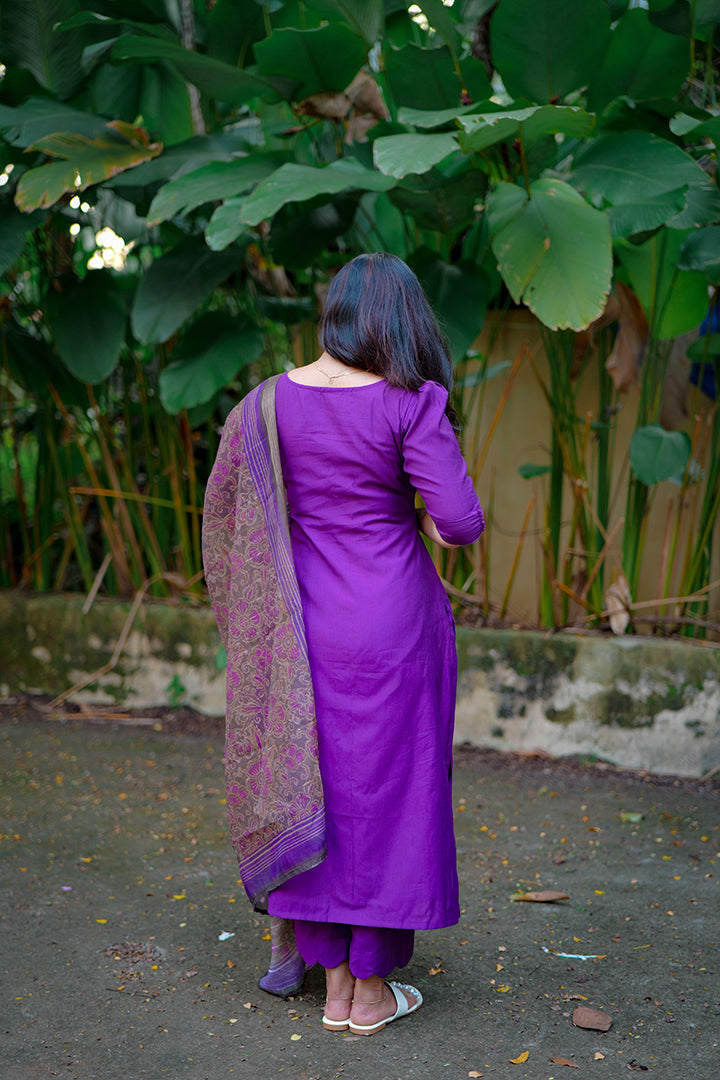 This elegant purple salwar set is crafted from rich Vatican silk fabric, paired with a chanderi dupatta for a graceful finish. Perfect for semi-functional gatherings and casual wear, the outfit features elbow-length puff sleeves and a scalloped neckline with delicate potli button detailing on the yoke. The hemline is beautifully finished with subtle scalloped edges, while the salwar bottom includes a practical right-side pocket for added convenience. Designed with a normal round back and a flattering 47-inch length, the set is lined with crepe to ensure all-day comfort along with its sophisticated charm.