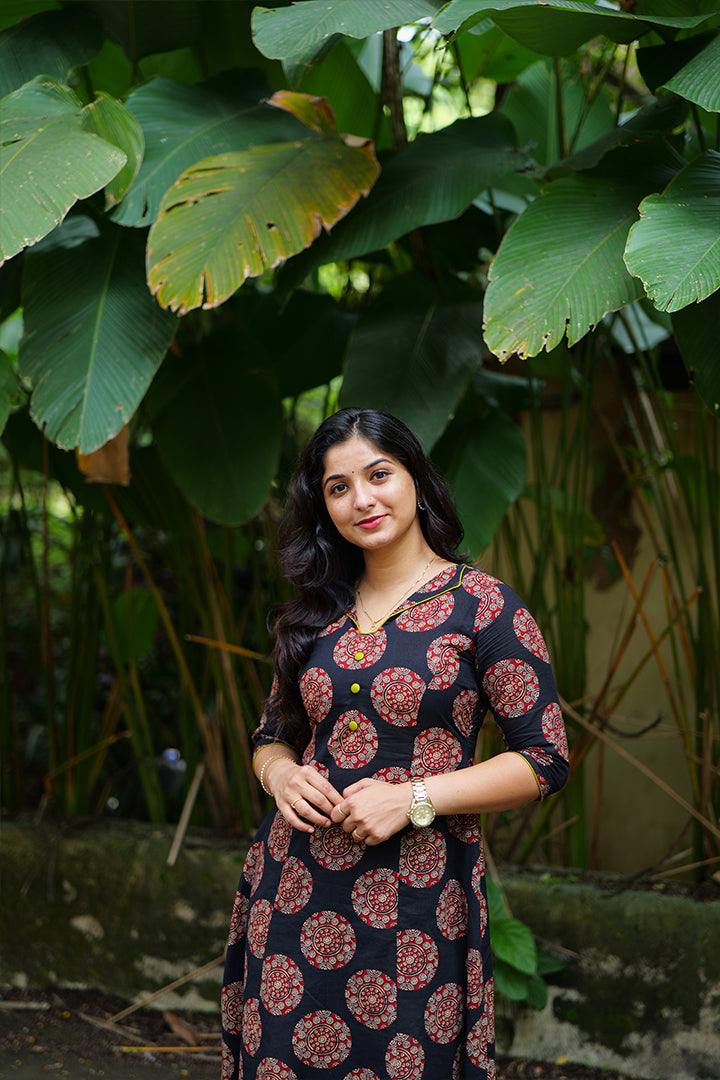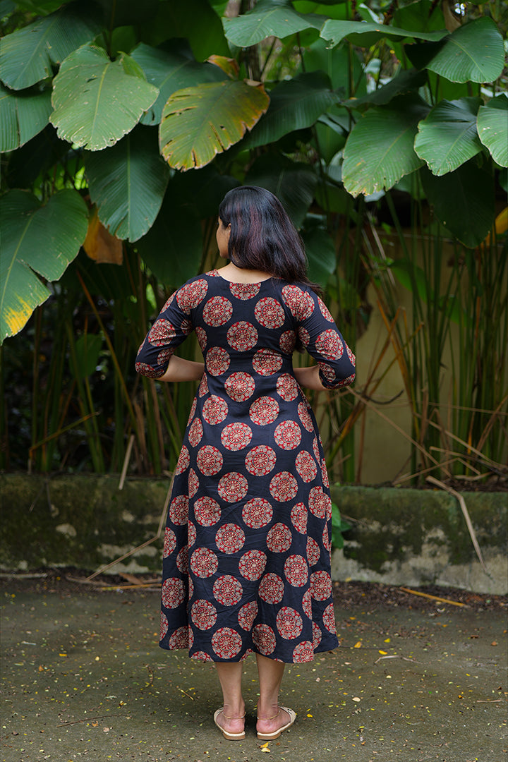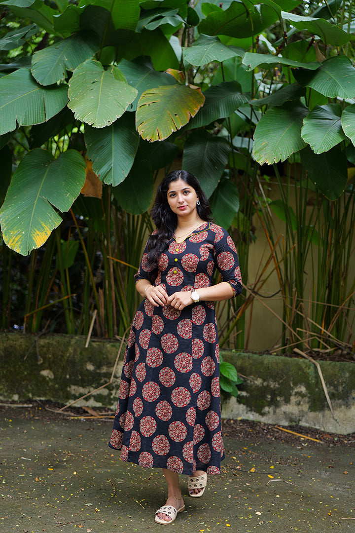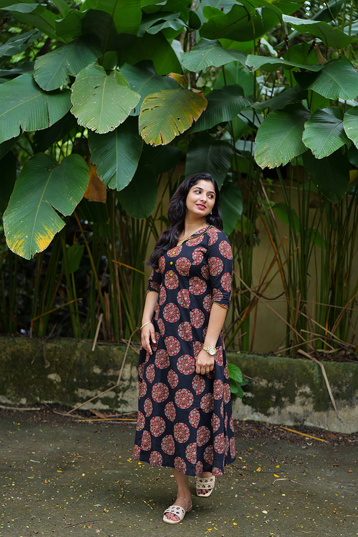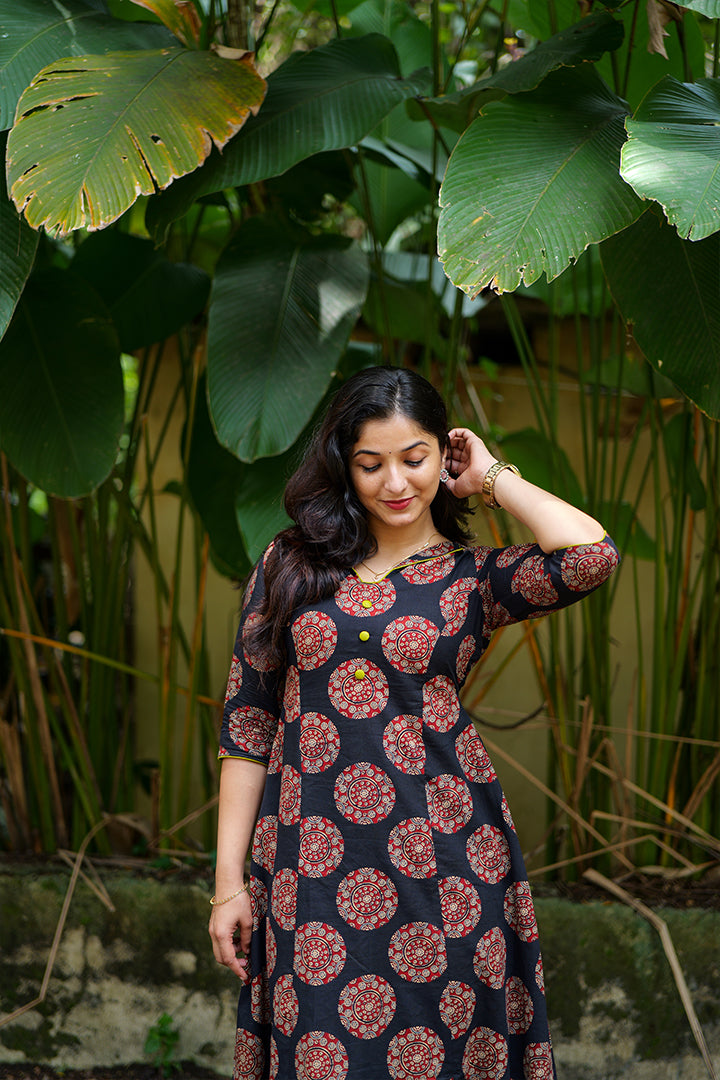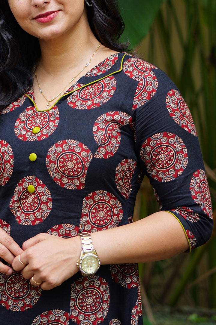 Elevate your everyday style with this Black and Red Ajrak Cotton A-Line Dress, designed with a smart collar neckline, 3/4th sleeves, and a flattering princess-cut yoke. The detailing stands out with Olive green piping on the sleeves, collar, and buttons, adding a vibrant contrast to the classic black base. Crafted in breathable cotton with full lining and a 47-inch length, this dress is perfect for casual outings and semi-formal occasions, offering both comfort and sophistication.