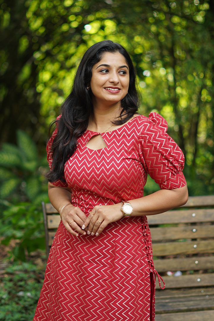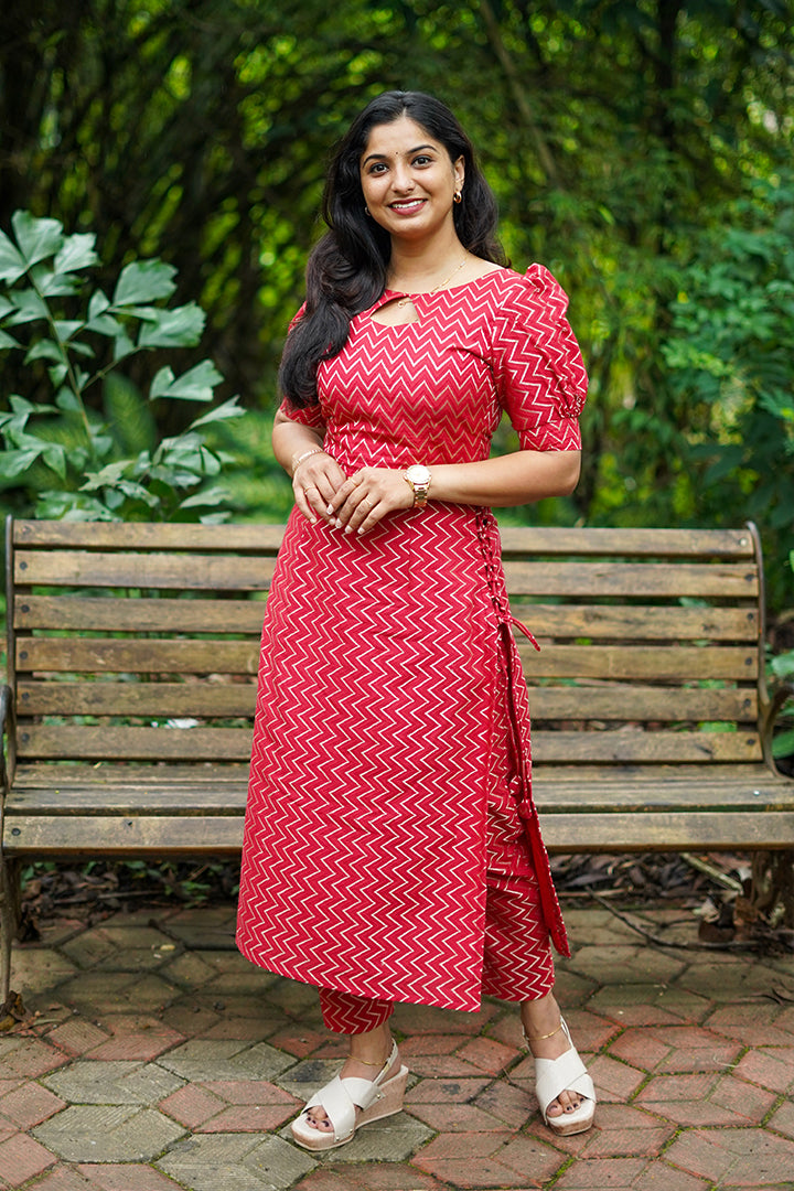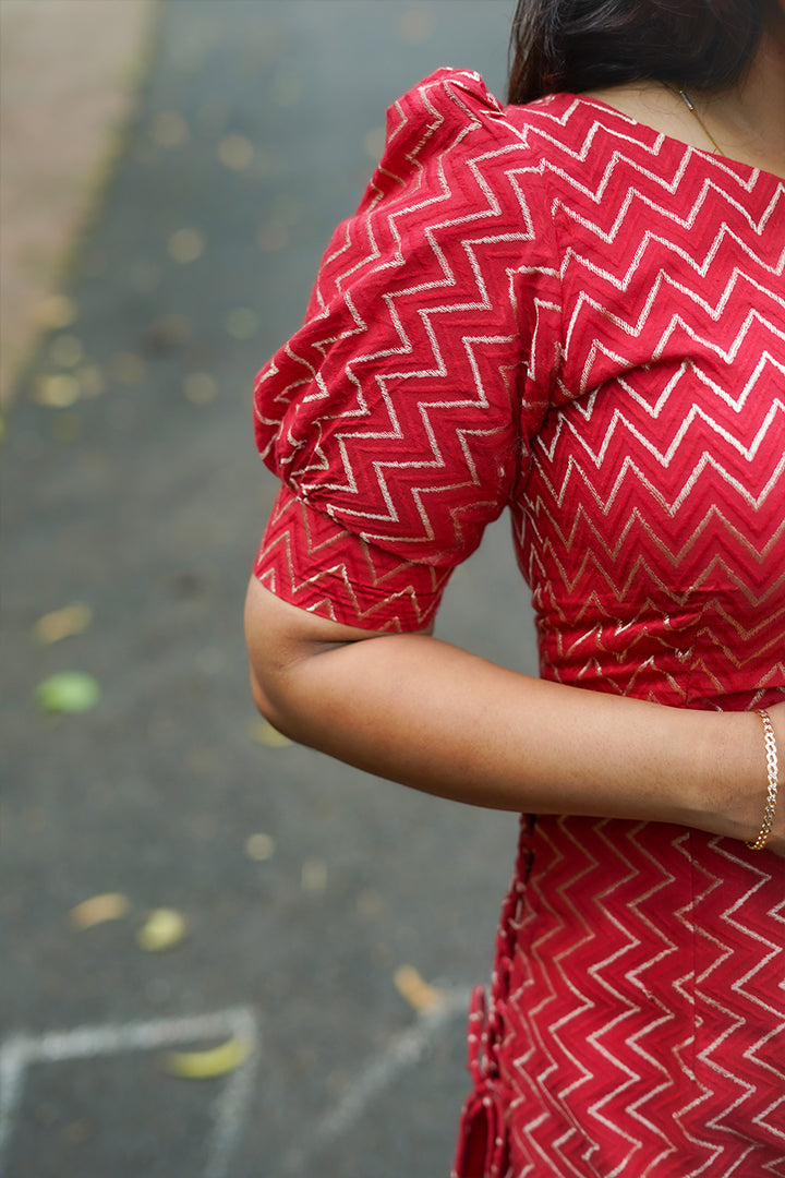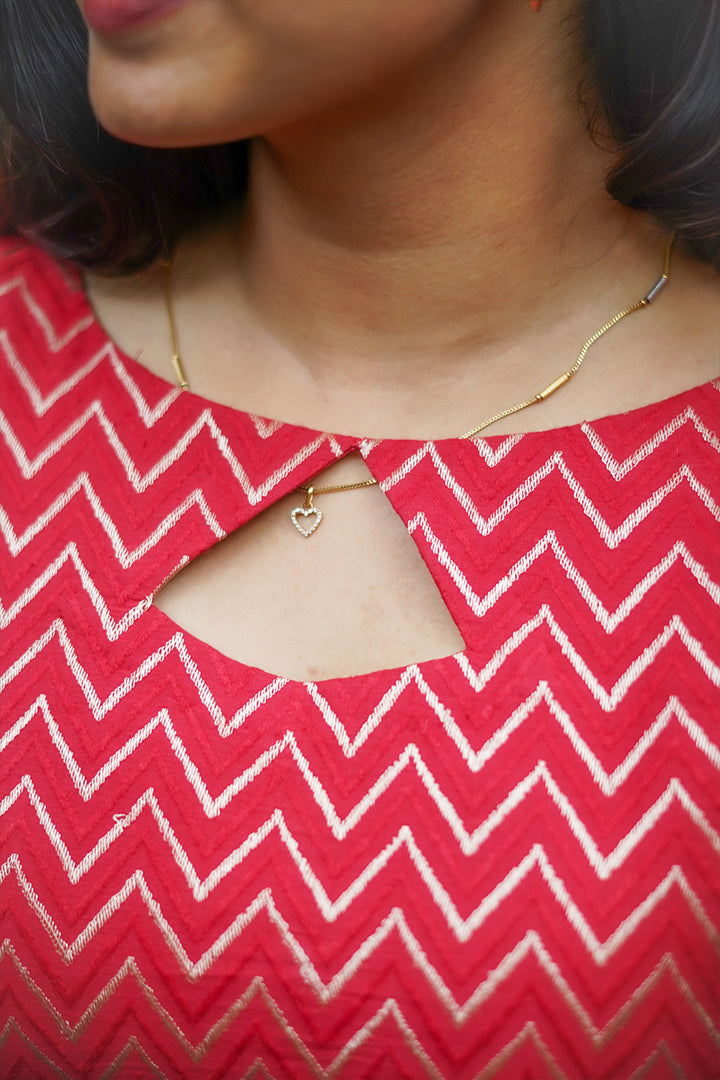 Add a touch of elegance to your wardrobe with this Red & White Soft Cotton Embroidered Top. Designed in thread-embroidered fabric with a zigzag/chevron pattern, it features a boat neckline with a keyhole detail, elbow-length puff sleeves, and a side slit adorned with loops and tie accents. The 47-inch length gives it a graceful fall, while the cotton lining ensures comfort for all-day wear. Perfect for office settings, semi-functional gatherings, or casual outings, this top is a versatile pick to pair with trousers, skirts, or palazzos.