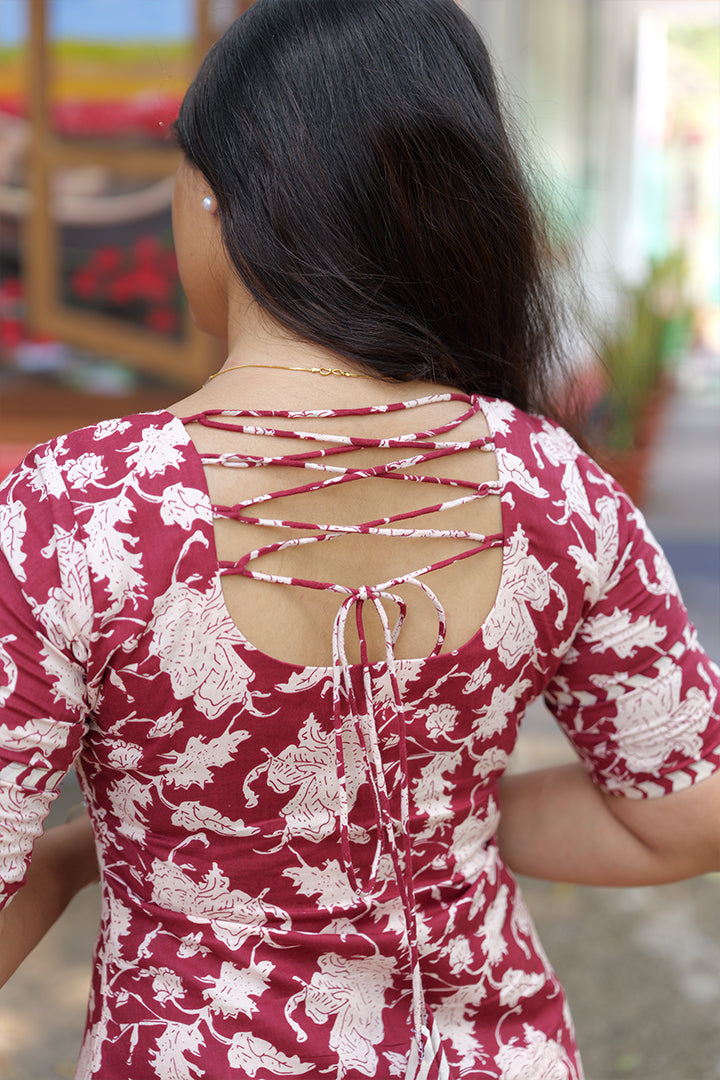 A stylish maroon and white cotton co-ord set designed for effortless casual and office wear. The top features an elegant sweetheart neckline with a small center V-notch, paired with comfortable elbow-length sleeves finished with a subtle V-cut on the hem for a refined touch. The design is enhanced with a deep U-back and horizontal criss-cross dori tie-up detail, adding a unique and modern element to the look. The bottom is finished with a 1/4 inch padi detail, while the breathable cotton fabric with soft cotton lining ensures comfort throughout the day. The set comes with a 47-inch top length, making it both stylish and easy to wear.
