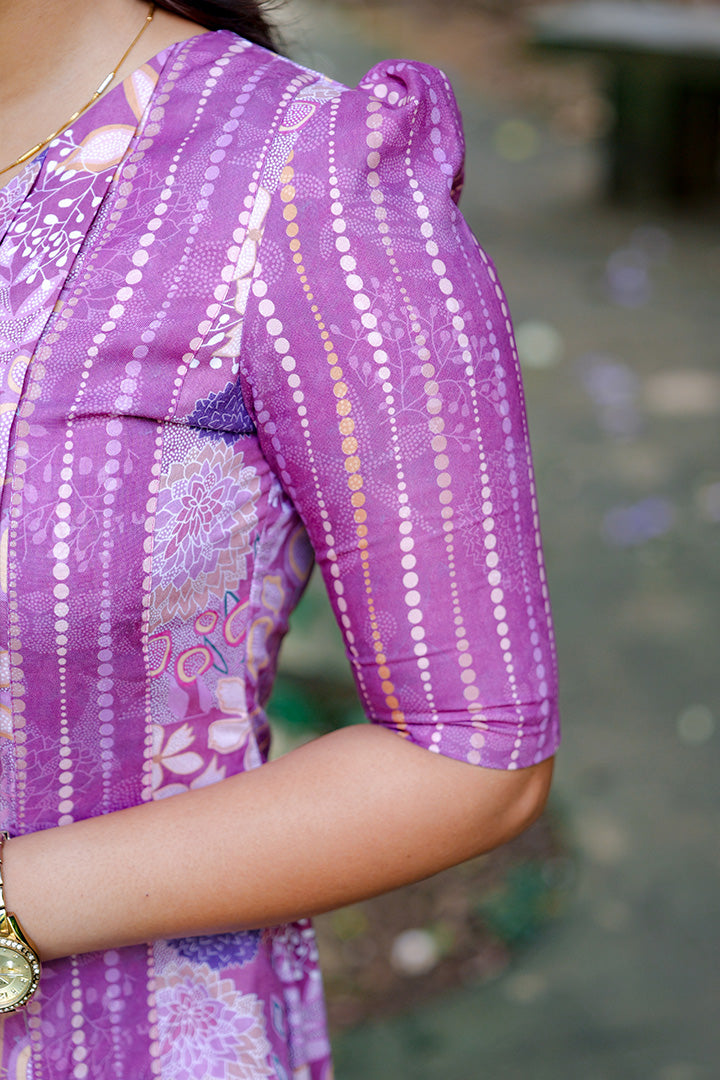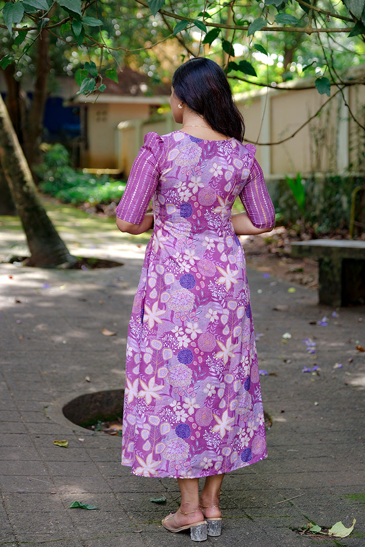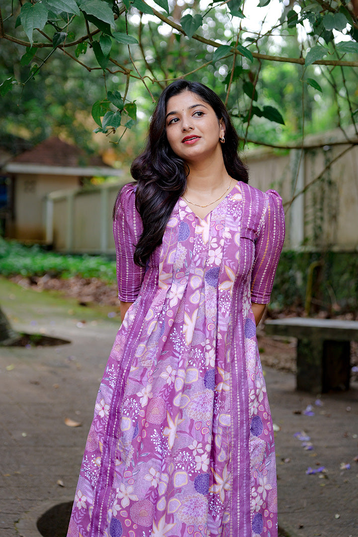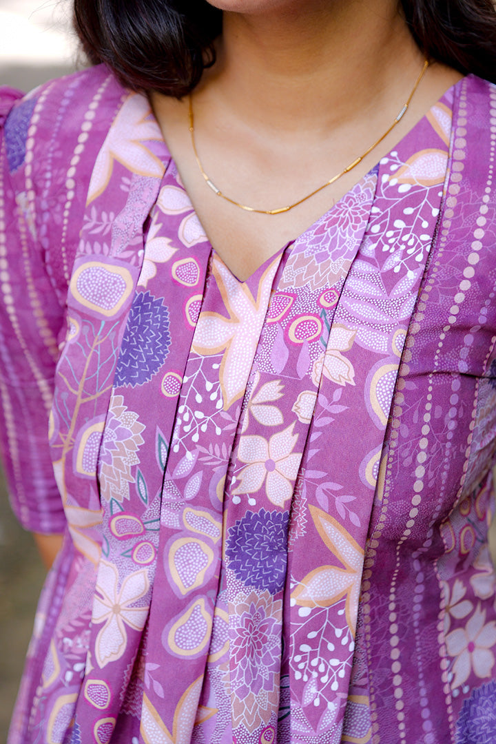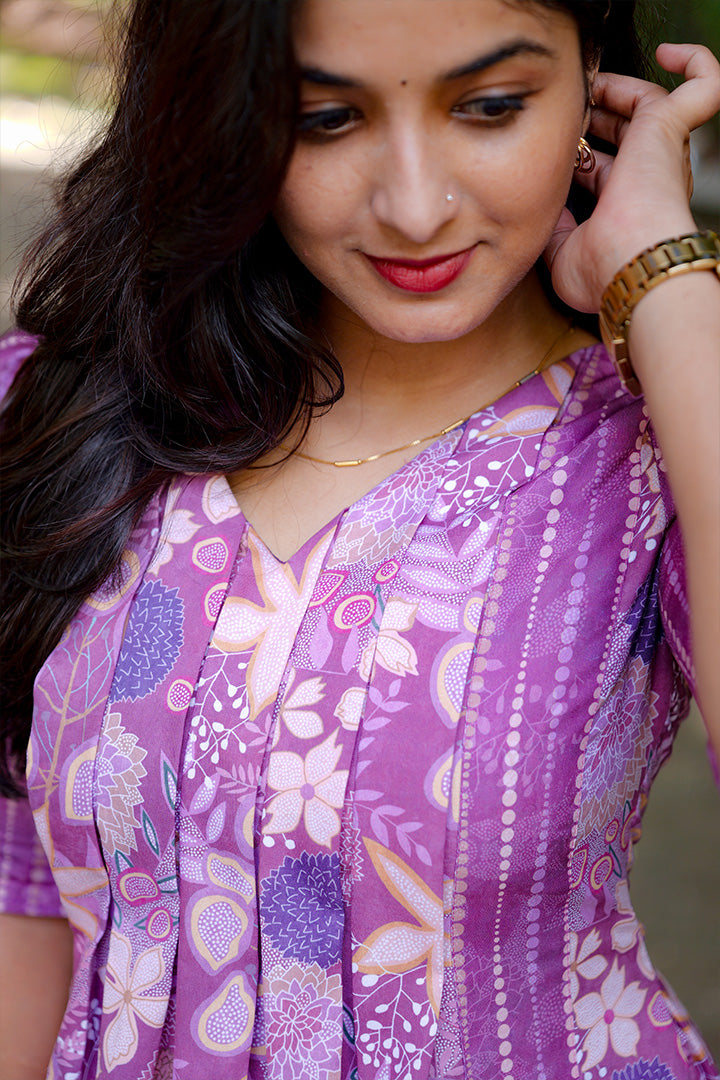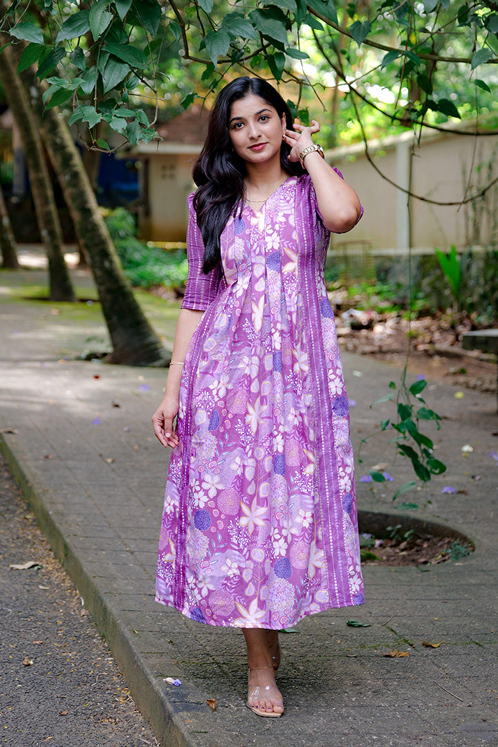 This Lavender mix A-line dress, crafted from soft and flowy rayon panna fabric, beautifully blends floral and geometric multicolor prints for a refreshing and elegant look. Designed for casual and office wear, it features a flattering V-neckline, a neatly pleated yoke, and elbow-length puff sleeves that add a feminine charm. The dress includes two side panels for enhanced structure and two convenient side pockets, combining style with functionality. With its breathable cotton lining and a 46-inch length, this dress ensures all-day comfort and effortless grace, making it a perfect choice for versatile everyday elegance.