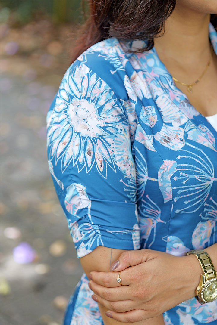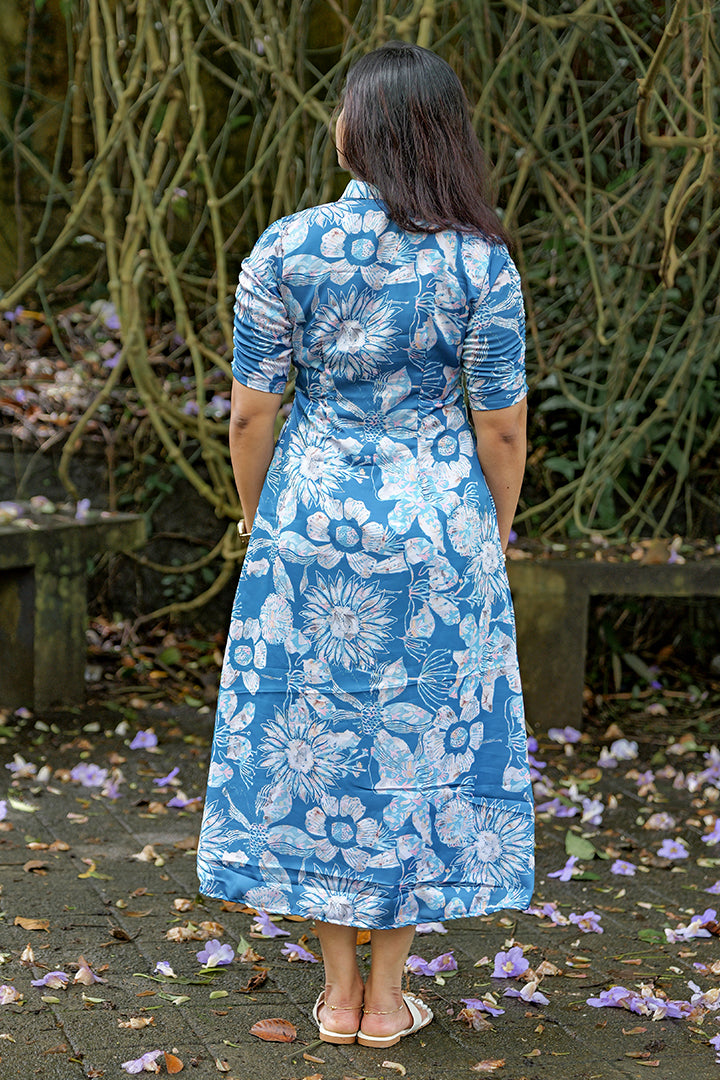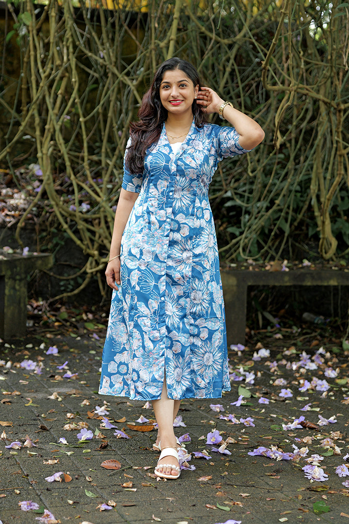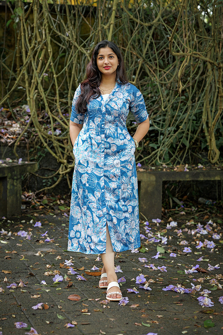 This Blue and White A-Line Dress crafted from luxurious Modal Satin fabric showcases a soft sheen and fluid drape, perfect for casual and office wear. The dress features a collar neck with a princess-cut yoke, adding tailored structure and elegance to the silhouette. Its elbow sleeves come with an elastic for comfort and a refined touch. Designed with a large floral print pattern, complemented by a linen slub yoke and button-down styling, it balances sophistication with everyday ease. The two side pockets add functionality, while the lightweight fabric ensures breathable comfort all day long.