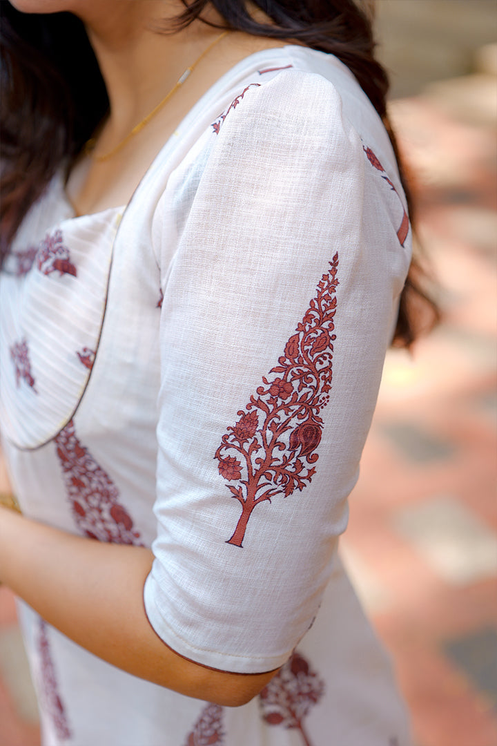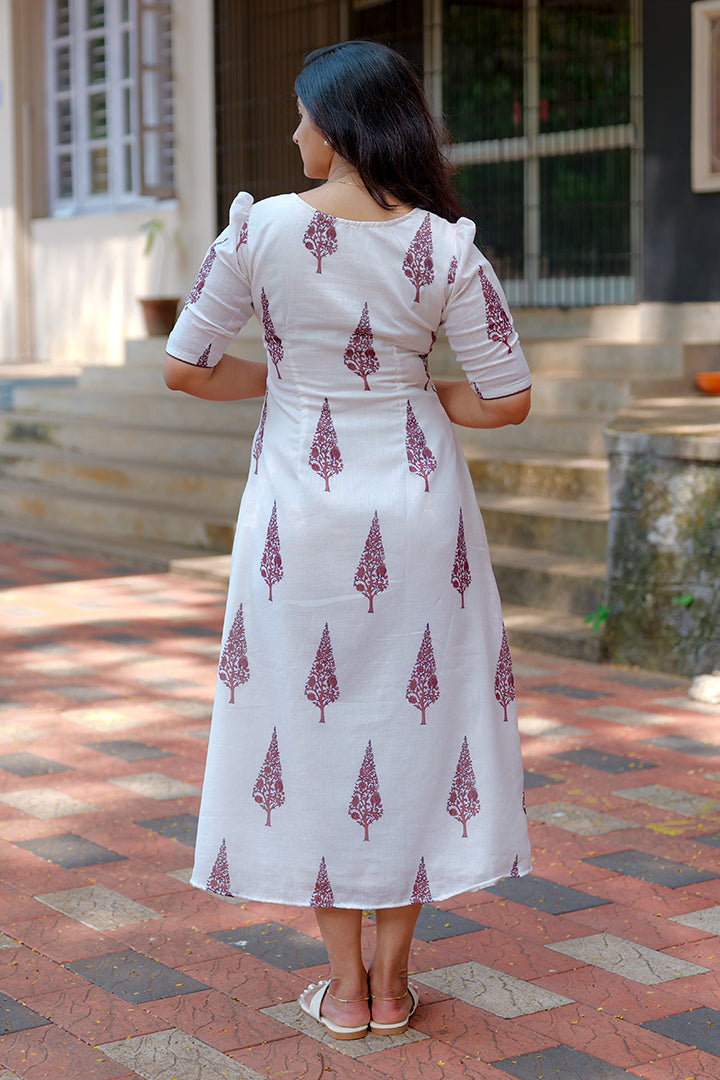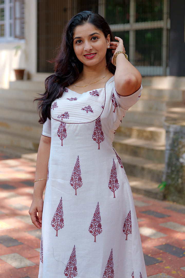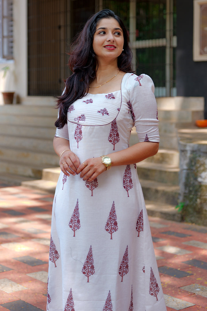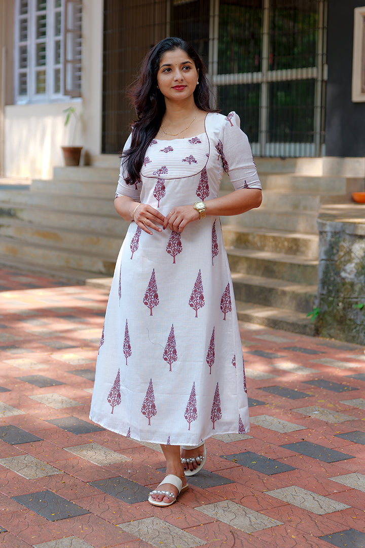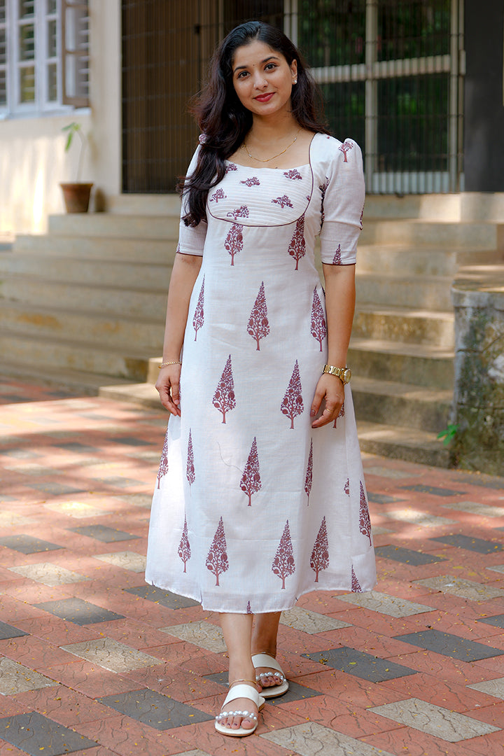 Embrace timeless elegance with this White A-line dress crafted from premium semi-linen fabric. Designed for casual and office wear occasions, it features a flattering sweetheart neckline and puff elbow sleeves that exude femininity. The pleated yoke design enhances its graceful silhouette, while the soft crepe lining ensures comfort and ease of wear. With a 46-inch length, this dress perfectly balances simplicity and sophistication for any setting.