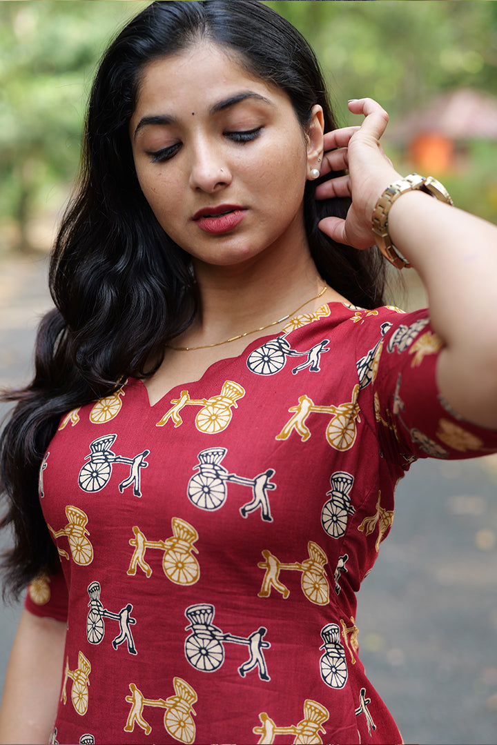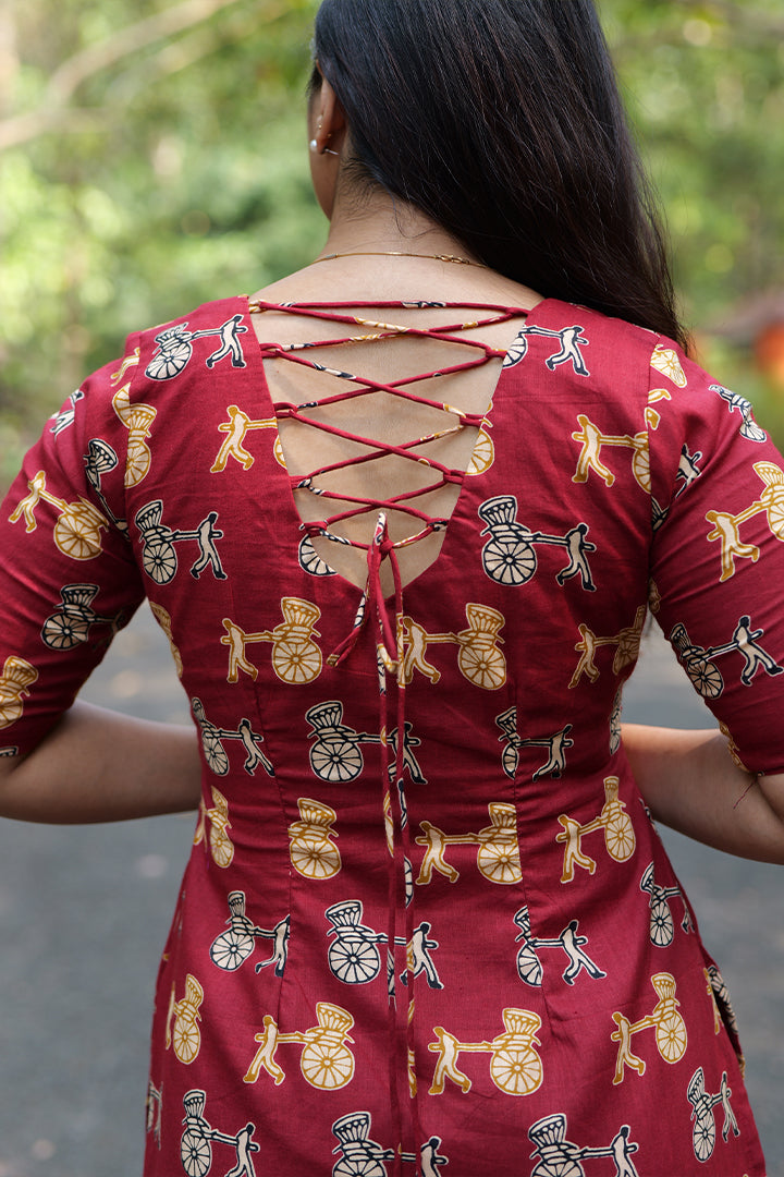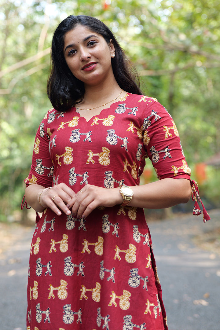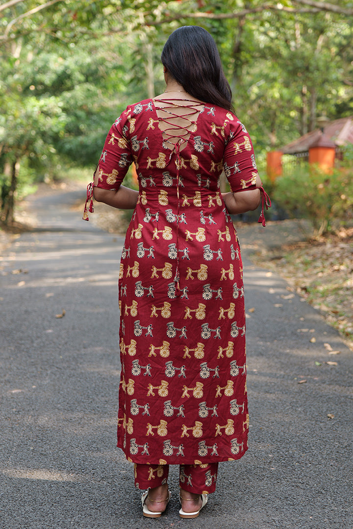 This red cotton co-ord set is thoughtfully designed for casual and office wear, featuring a V-neck top with elegant scalloped detailing that adds a feminine touch. The elbow-length sleeves with tie-up accents enhance the overall style, while the criss-cross dori design at the back creates a striking and adjustable detail. Paired with a matching bottom that includes a practical right-side pocket, this set balances style and functionality. Finished with a crepe lining, it offers breathable comfort and a polished look for everyday wear.