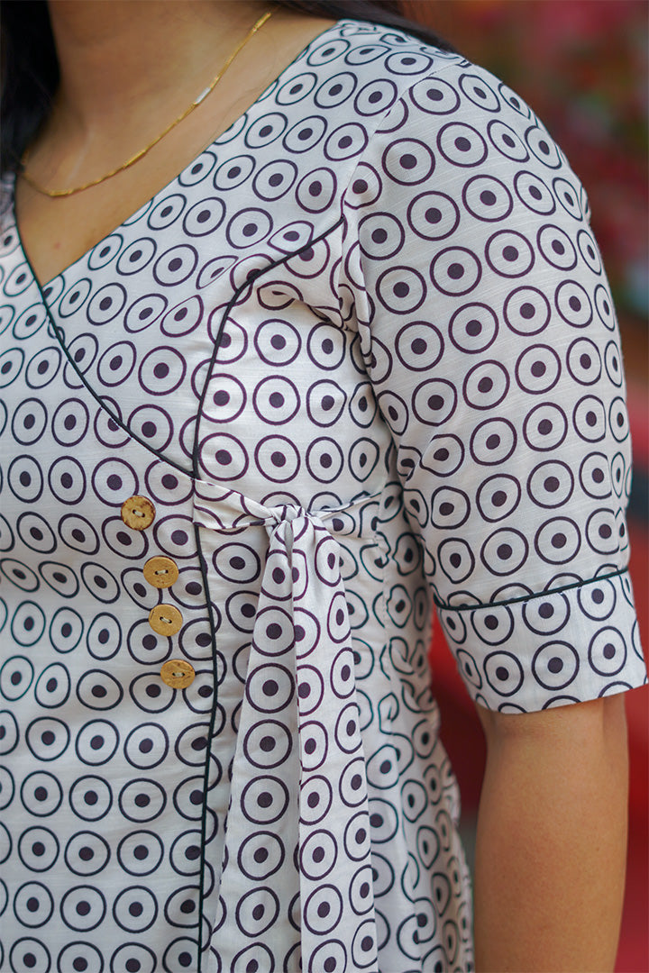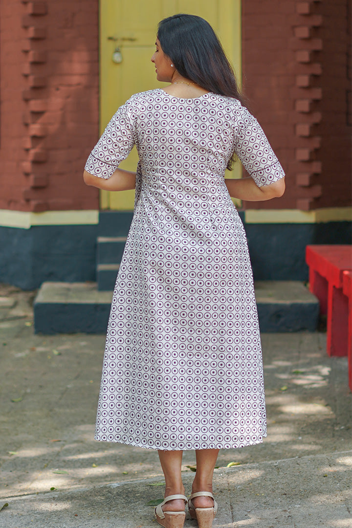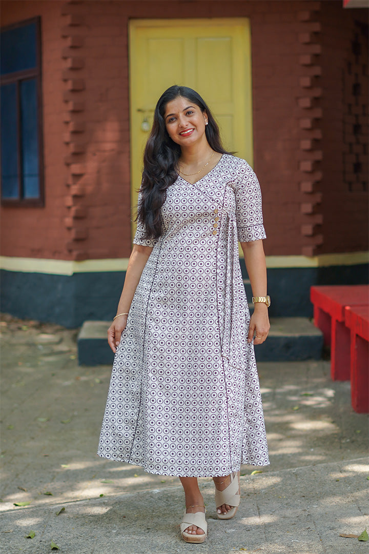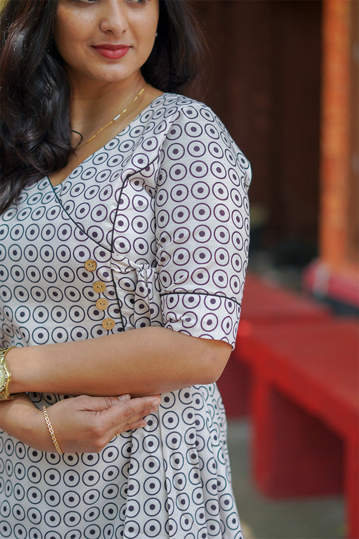 This off-white A-line dress is crafted from soft rayon slub, making it perfect for comfortable casual wear. Designed with elbow-length sleeves and a flattering wide V neckline, it offers a relaxed yet elegant look. The A-line silhouette with mock overlap pattern adds subtle structure and modern style, while the 47-inch length ensures graceful coverage. Finished with a cotton lining, this dress provides breathable comfort for effortless everyday wear