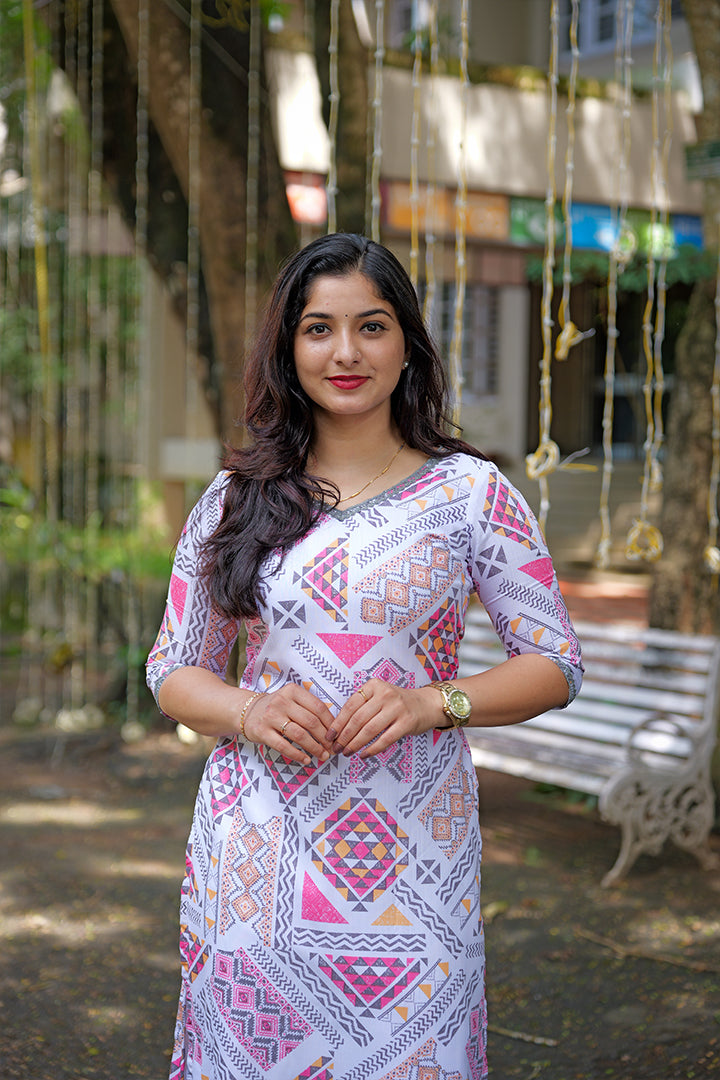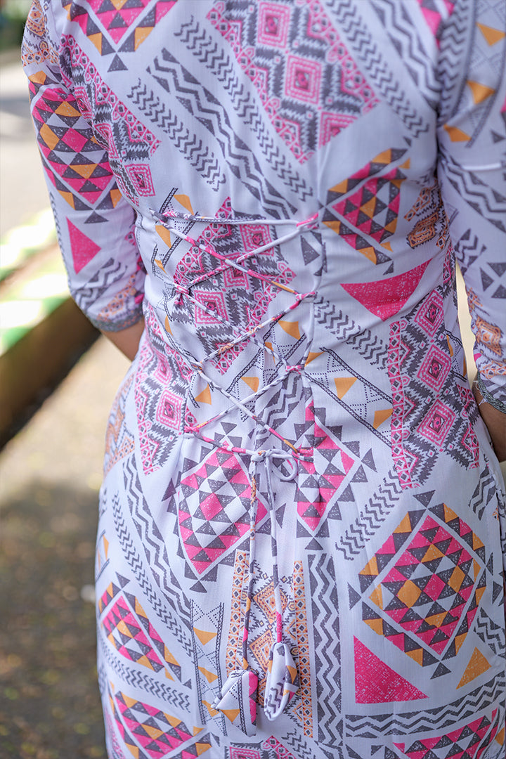 This White and Multicolor Top made from fine Slub Cotton fabric is a stylish fusion of comfort and sophistication, perfect for casual outings or office wear. It features a wide V-neckline beautifully adorned with lace detailing on the neck and sleeves, adding a touch of elegance. The highlight of the design is its lace-up corset-style back, which brings a chic, contemporary edge to the classic silhouette. With a 47-inch length and soft cotton lining, this top ensures breathability and ease, making it a graceful and versatile addition to your everyday wardrobe.