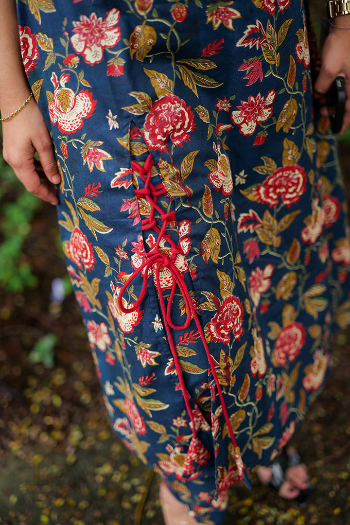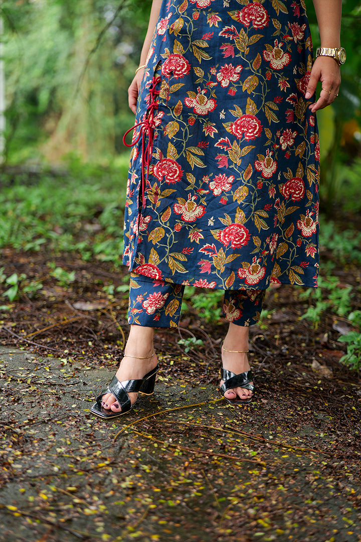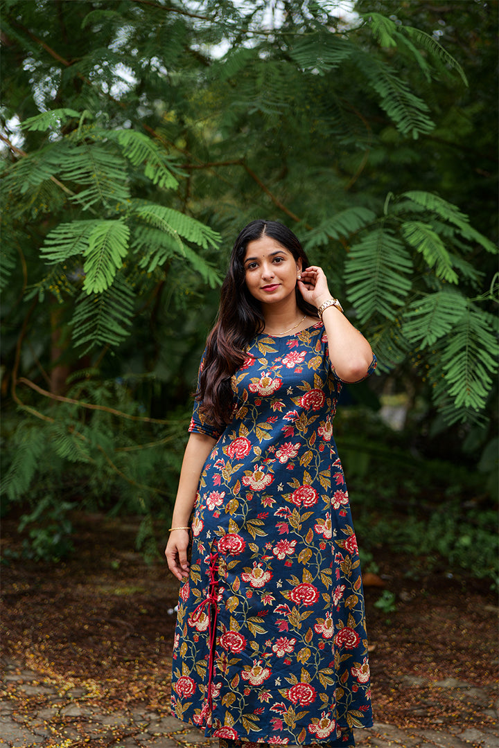Stay stylish and comfortable with this navy blue floral printed cotton top. Designed with a chic boat neckline, elbow-length sleeves, and a 47-inch length, it offers a flattering fit for both casual and semi-formal occasions. Crafted with breathable cotton and lined for comfort, this versatile piece pairs beautifully with pants, skirts, or palazzos.